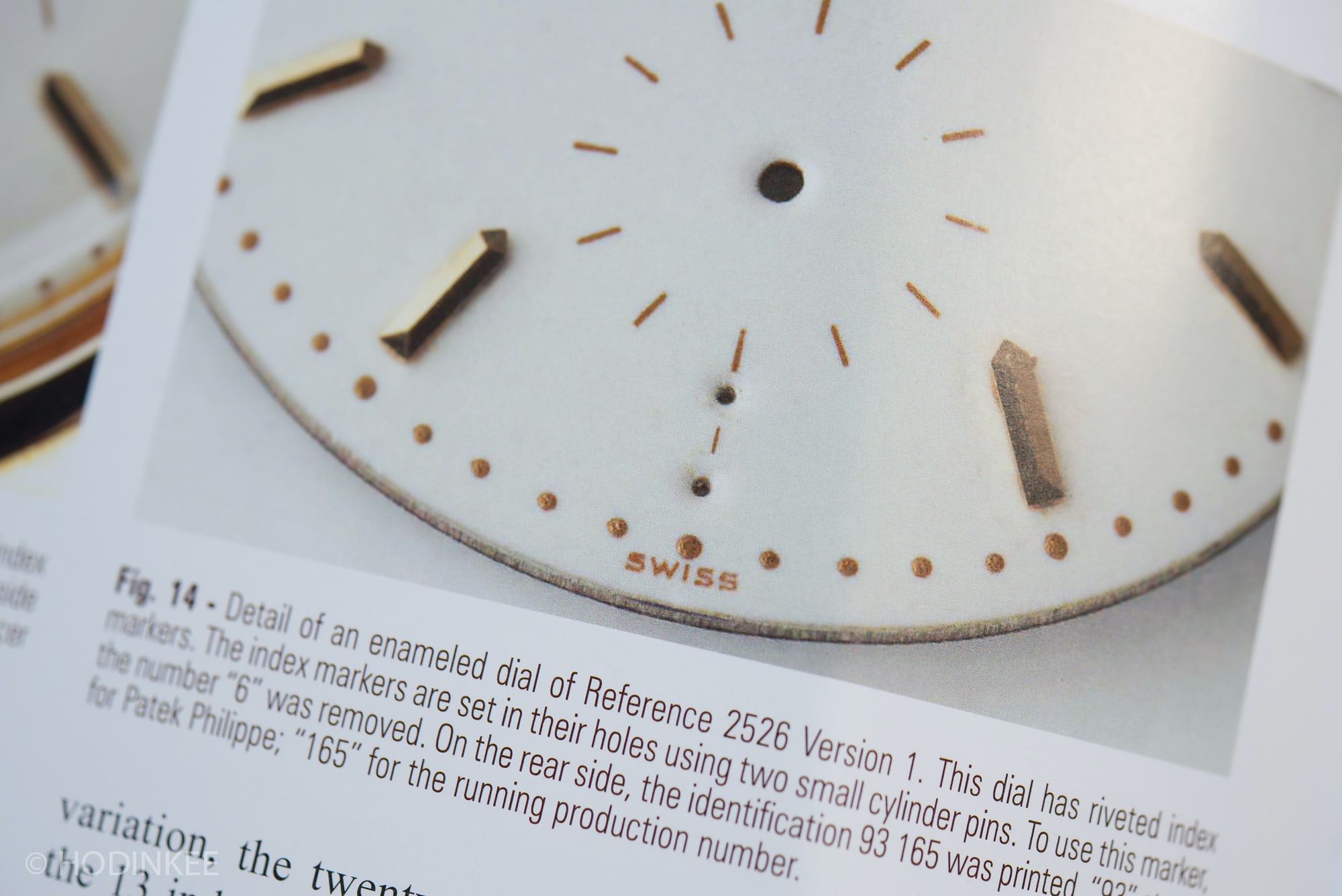 何度か言及したように、エナメルダイヤルの製造は並大抵のことではない。最初に製造されたRef.2526のダイヤルは、他のモデルと比べて特別な特徴をもっている。アワーマーカーが、ピンによって文字盤にセットされているのだ。それ以降のダイヤルは全て、アワーマーカーがソリッドエナメルの表面に接着されている。ダイヤル自体にマーカーを固定することは非常に問題があることが判明し、パテックはすぐにこの方法を放棄したわけだ。あなたはこれが何を意味するかピンときただろう - 困難で短期間しか行われなかったことが証明されているときはいつでも、収集家はそれを望むだ。それはRef.2526の初期ダイヤルを見れば一目瞭然だ。では、どうやって初期ダイヤルを見分けることができるのだろうか? ダイヤルを斜めにしてアワーマーカーを見てみてみよう。後期ダイヤルは、アワーマーカーが完全に平らになっている。下に、私が言っていることを分かりやすく示した例示がある。