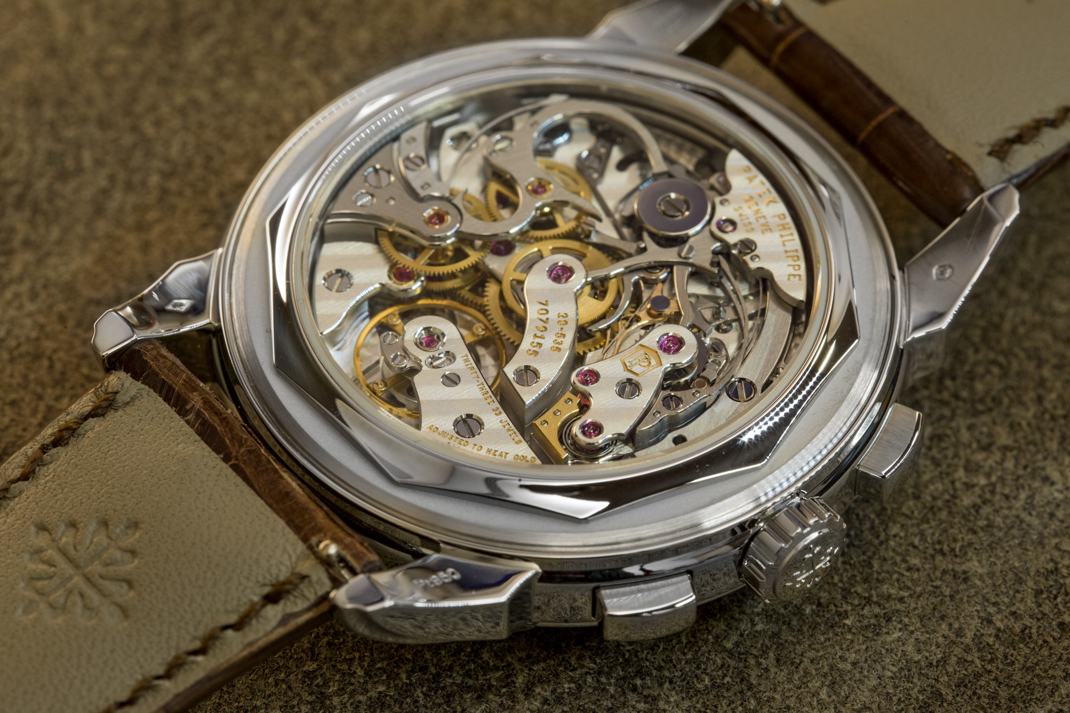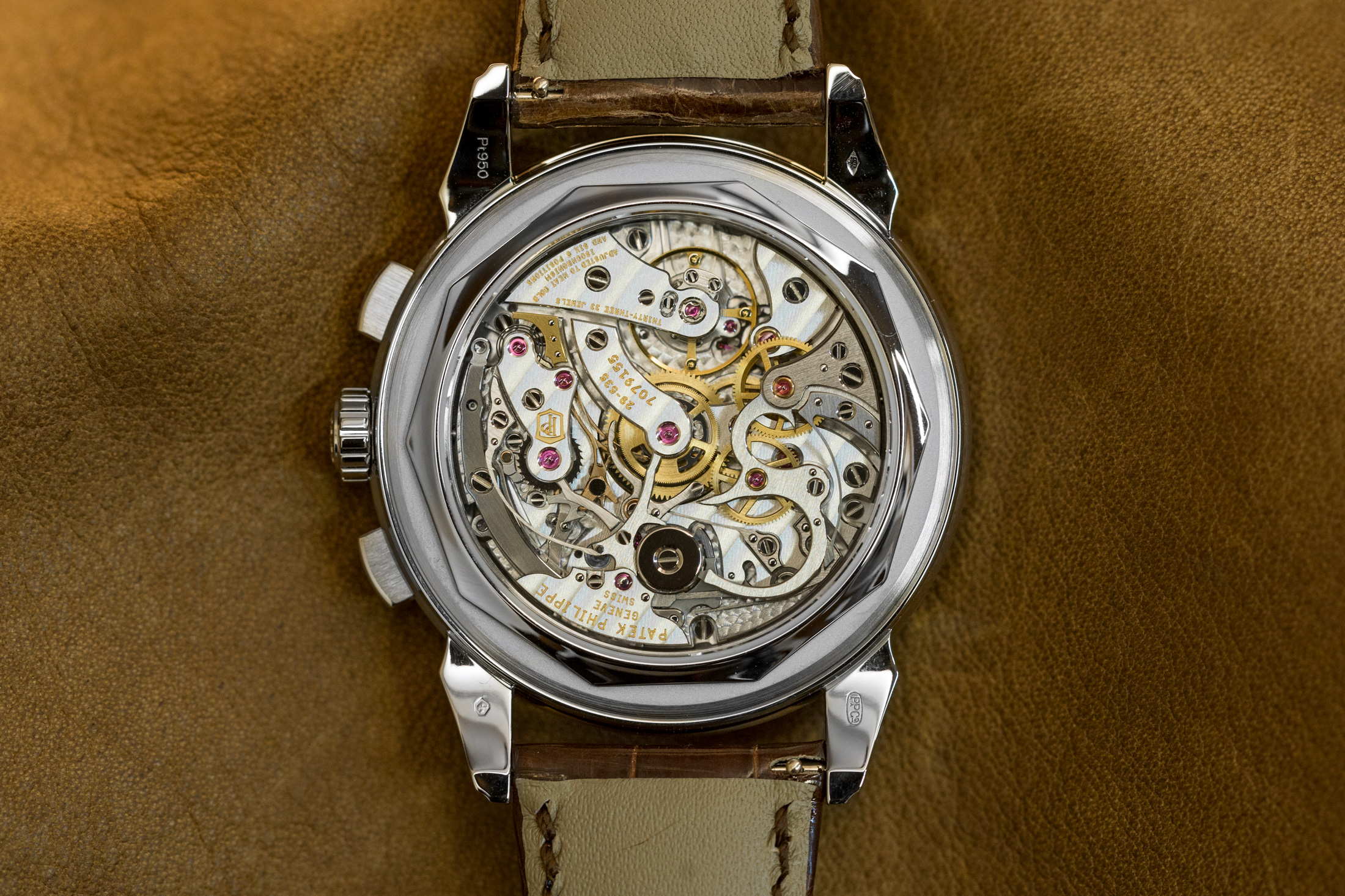 このムーブメントもおそらく今となっては、お馴染みのもの。Cal. CH 29-535 PS Qは、クロノグラフとデイ/ナイトインジケーター、うるう年インジケーター、ムーンフェイズを備えた永久カレンダーを組み合わせたものです。非常に伝統的な方法を採用した素晴らしい仕上げが特徴です。ダトグラフで見られるものほどすぐに目を引くわけではないかもしれませんが、エレガントで申し分ありません。このムーブメント(パテックが真の意味で初めて自社開発したキャリバー)で僕が気に入っている点は、クロノグラフのレジスターで、余分な針で表示するのではなく、デイ/ナイトとうるう年を2つのウィンドウを使用している点です。この方法でなければ、確かにダイヤルは多少スッキリするかもしれませんが、読みやすさが妨げられてしまいます。
