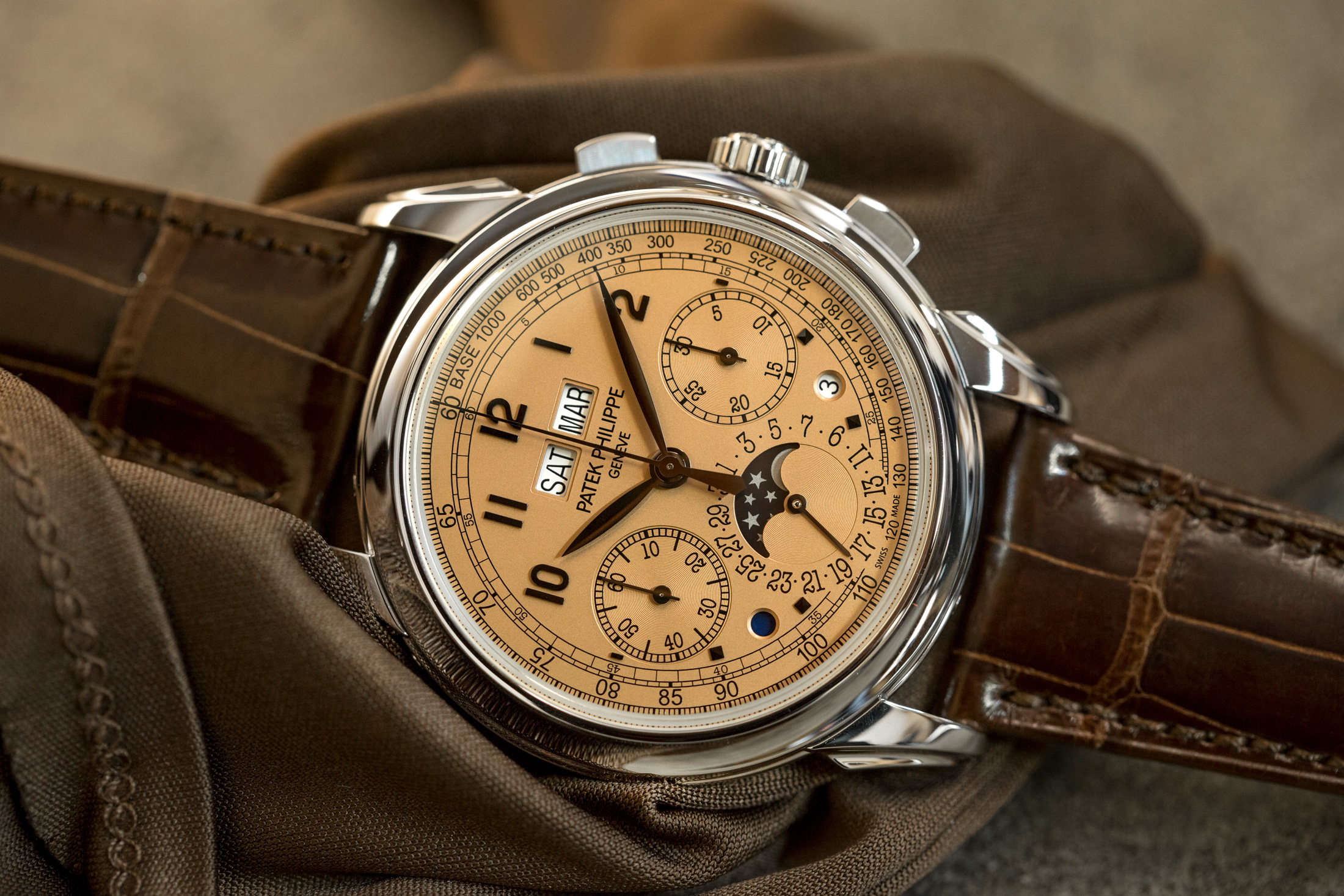 基本的には、これまで僕たちが話してきた5270と同じです。ポリッシュされた明るいプラチナケースは、直径41mm、厚さ12.4mmです。ケースに関しては、サイズは違うかもしれませんが、すべてがとても伝統的なものであり、ラグには僕が結構気に入っている独特のファセットモチーフがあります。この時計には、プラチナのパテック製フォールディングバックルが付いた茶色のアリゲータストラップが付いています。ここまでは、それほど驚くものはありませんね。