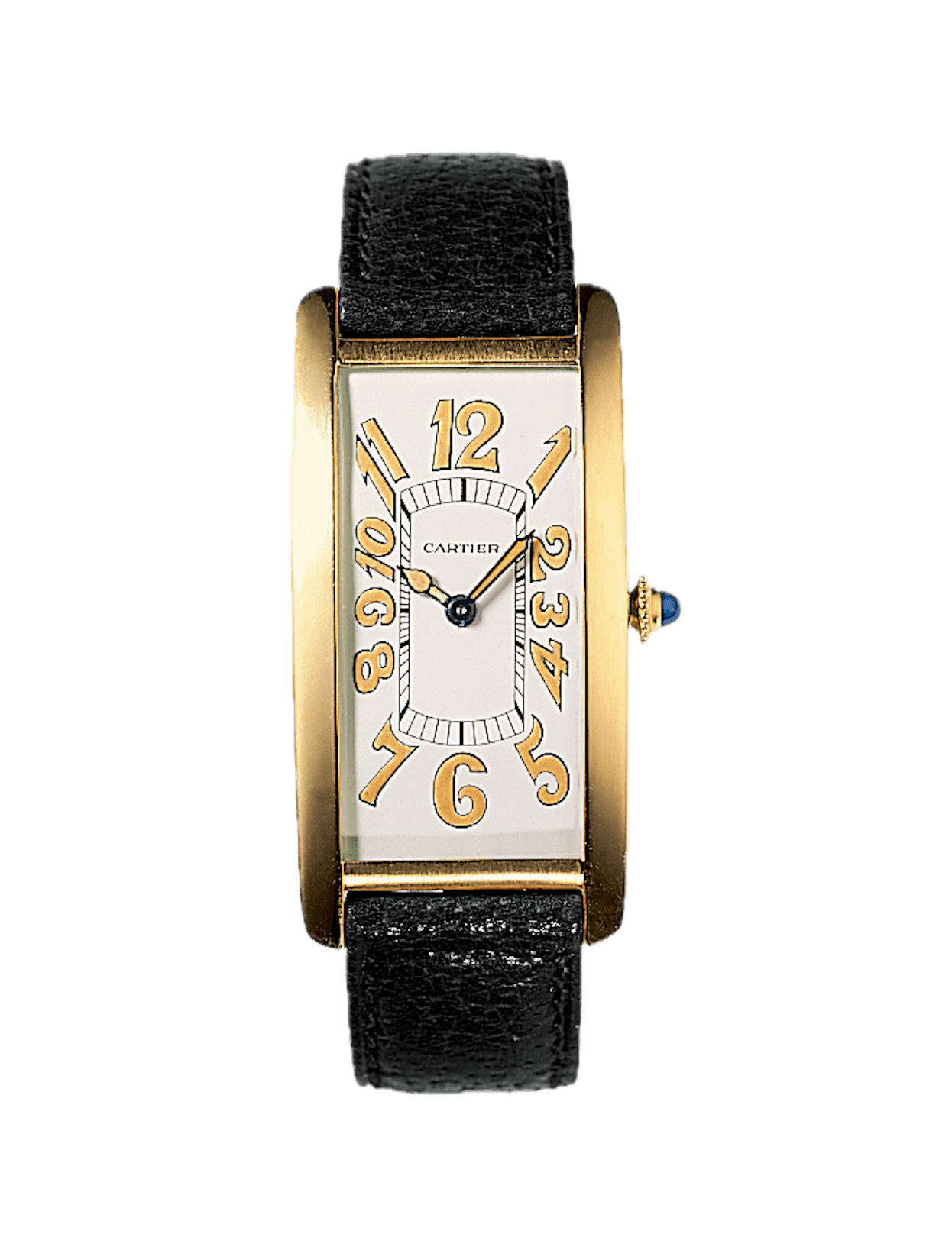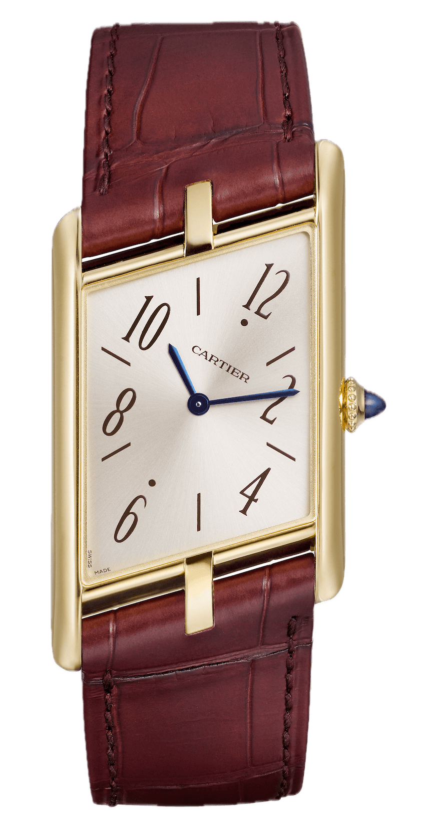 タンク サントレは1921年に登場し、ブランカードをさらに縦に伸ばした長方形の形状が特徴。フランス語で「傾ける」を意味する「サントレ」という名の通り、微妙にカーブしたケースを採用したことで、シンメトリカルかつ優雅なフォルムをさらに強調した。本機はアールデコの美学に呼応するものとして、モダニズムを代表するデザインとなった。