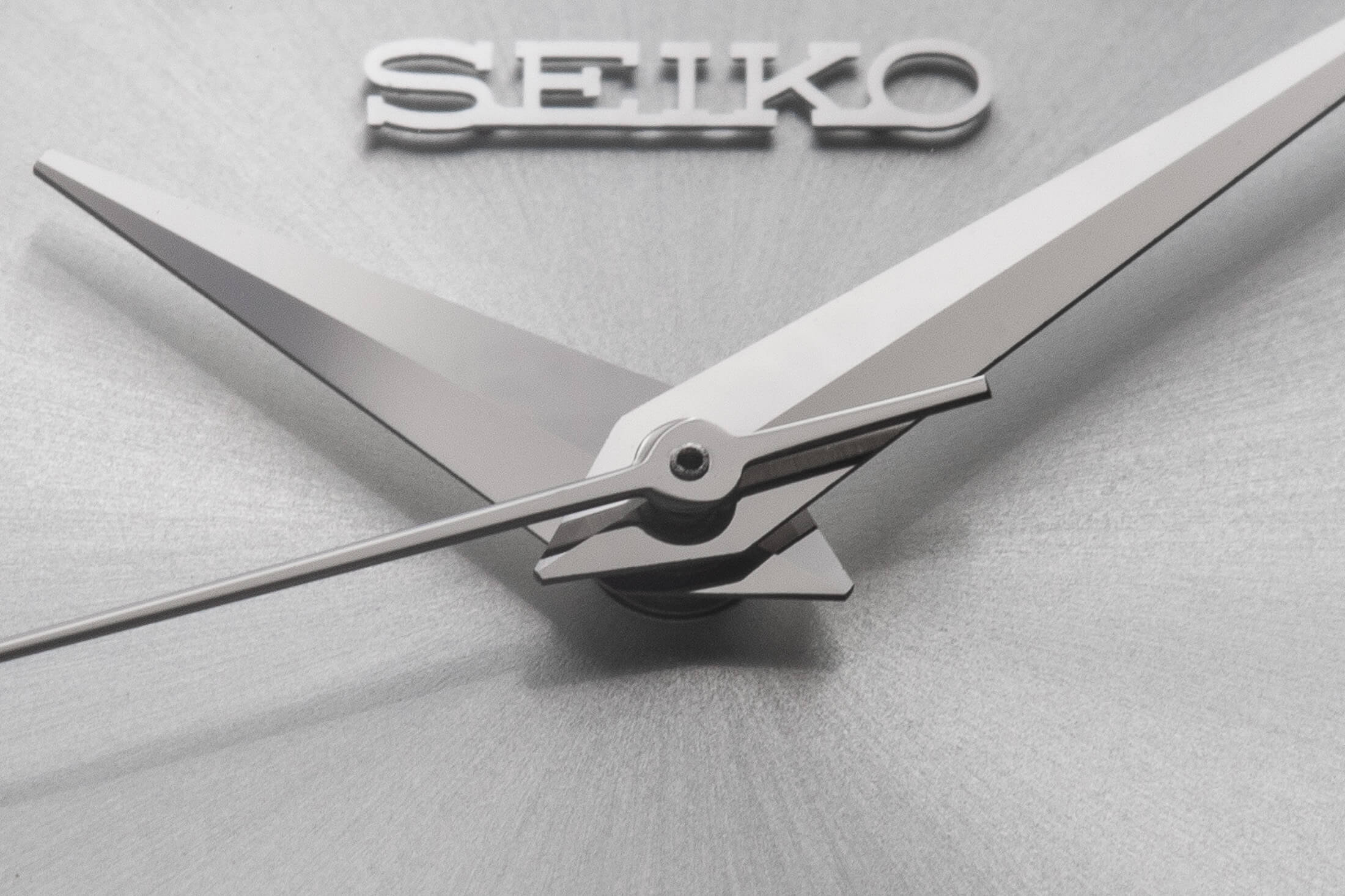 さらにダイヤルを眺めているとある部分に違和感を覚えました。それは針です。時分秒針はいずれも長く取られており、インデックスと相まって高い視認性を実現していますが、よく見ると時分針のデザインが“KSK”と異なるのです。オリジナルはグランドセイコー同様にダイヤカットを施した5面の針でしたが、本機は2面のシンプルなドーフィン針。これはおそらくグランドセイコーとの差別化を明確に図るためでしょう。針だけでここまで雰囲気が変わるのかと思わせる好例ではないでしょうか。ロゴは、12時位置にアプライドの“SEIKO”が、6時位置には“KING SEIKO”と“AUTOMATIC”が印字されています。
