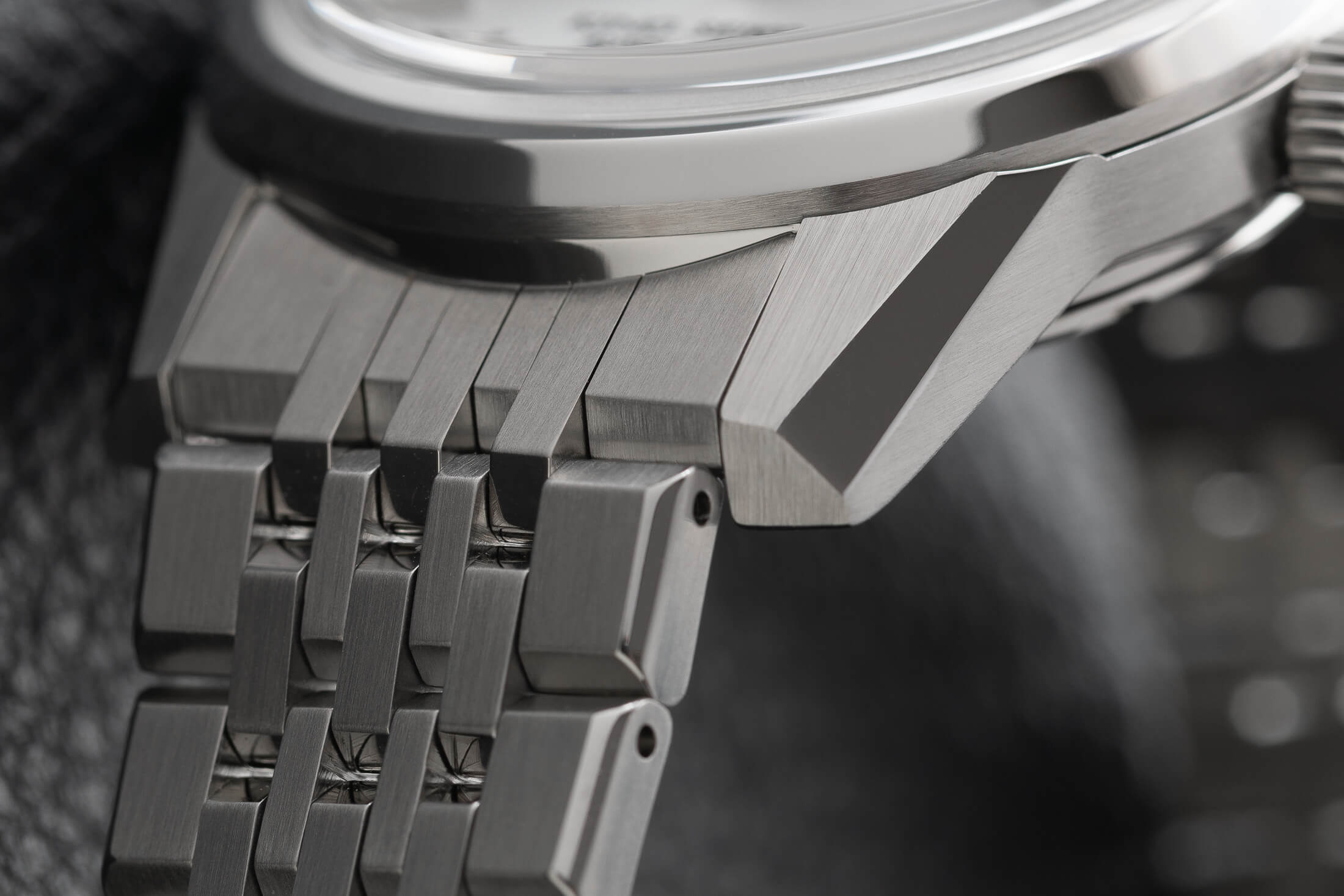 ケースデザインは、オリジナルの“KSK”のシャープな質感を彷彿とさせる多面カットを多用したもので、鏡面仕上げとサテン仕上げが施されています。太くしっかりとした特徴的なラグも受け継がれていますが、鏡面仕上げの箇所は少し異なります。オリジナルでは上面と斜面に鏡面仕上げが採用されていましたが、SDKSでは斜面のみ。本モデルにはサテン仕上げのブレスレットがついていますが、この仕上げの変更によってケースとブレスレットの一体感が強調されています。
