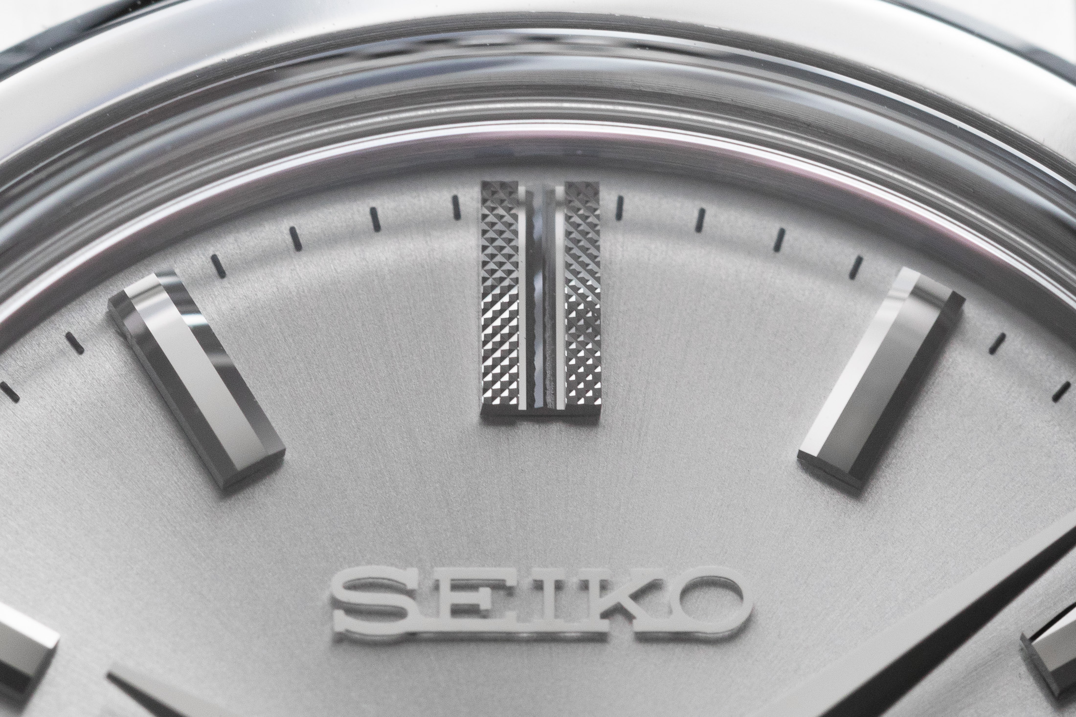 では、ダイヤルにもっと近寄ってよく見てみましょう。まず最初に僕の目に留まったのは、インデックス。特に12時のインデックスは、ほかと同様にダイヤモンドカッターで素材の表面を削ってならすダイヤカットが施されていますが、さらに2本のV溝カットと斜めに細かな刻みを入れた“ライターカット”が組み合わせられたデザインです。実はこの意匠は“KSK”だけに見られるもの。キングセイコー“KSK”の現代アレンジにおいても絶対に外すことのできないアイデンティティなのです。