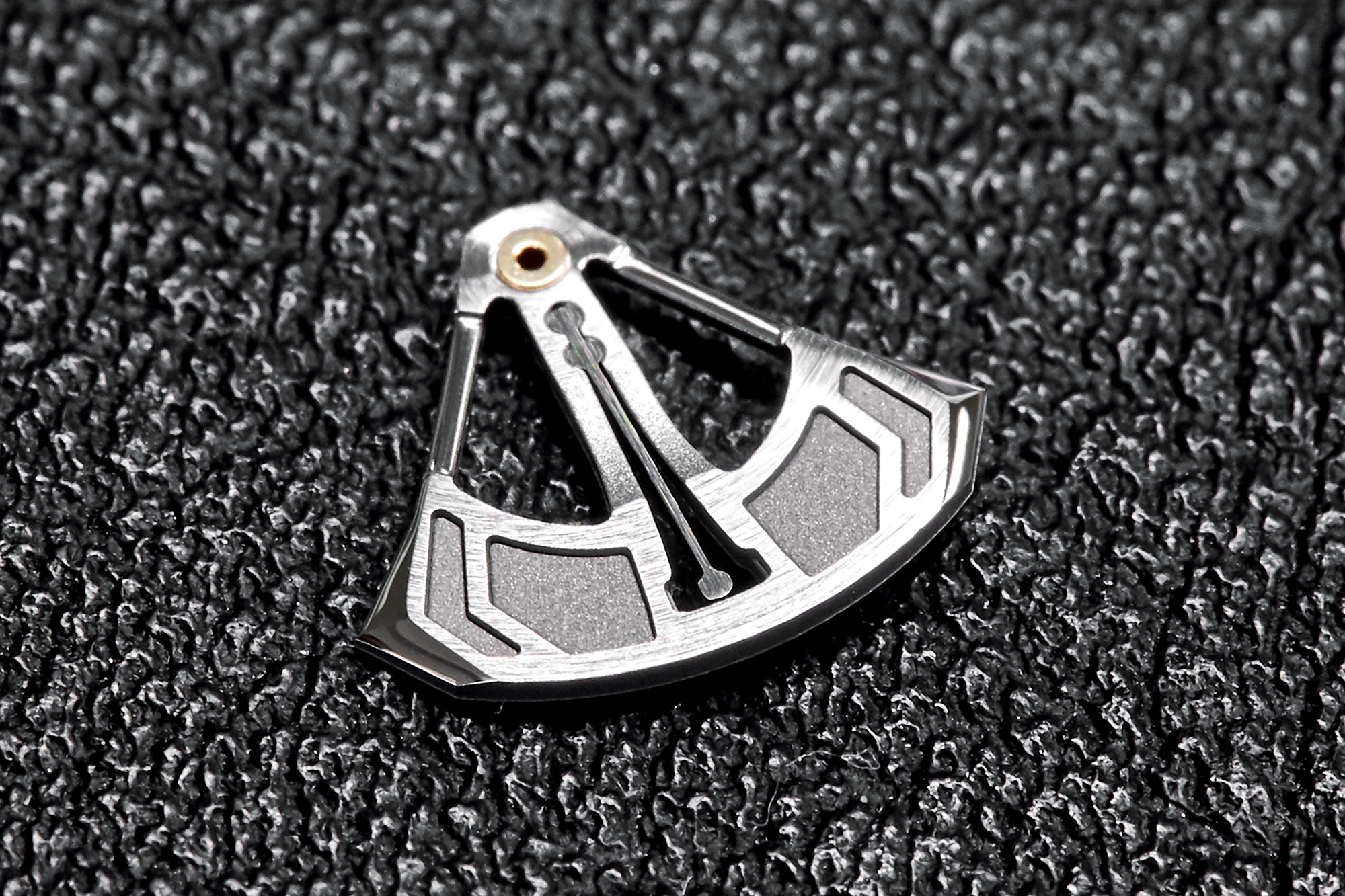 「サファイアのガラスは飛行機の窓に似た形で、その下の各種インジケーターは色別にはっきりとしたコントラストをなし、読み取りやすくなっています。超幅広のチタンリューズはジェットタービンを、ボタンはエンジンと翼を繋げるパイロンを想像させます」