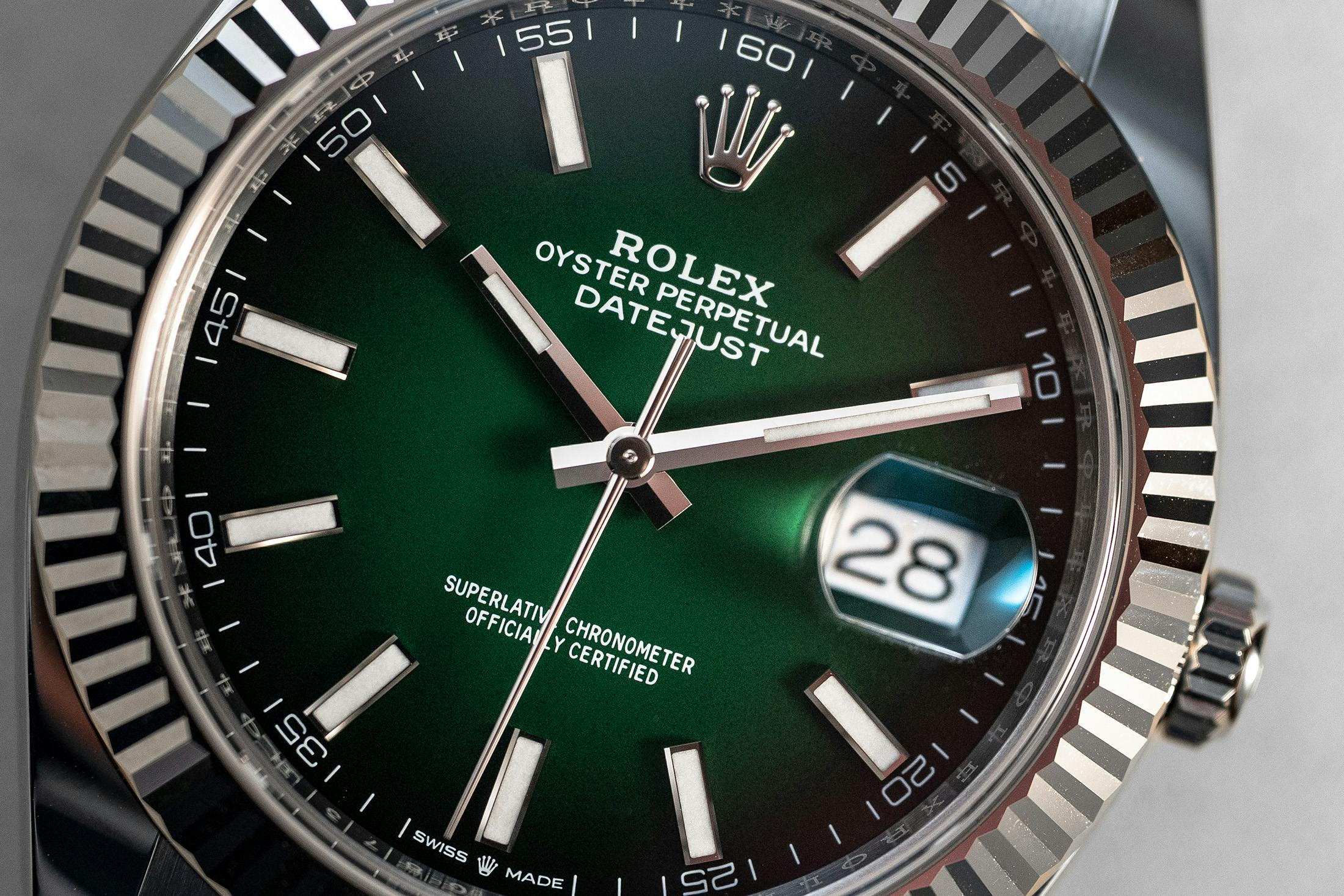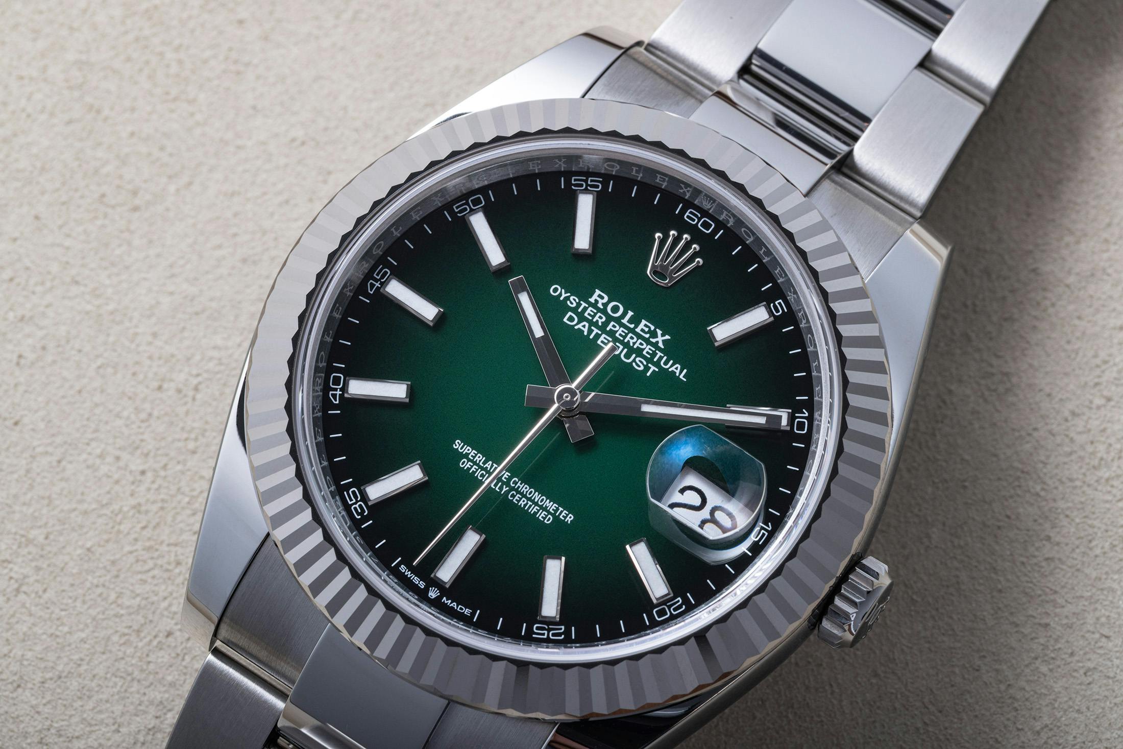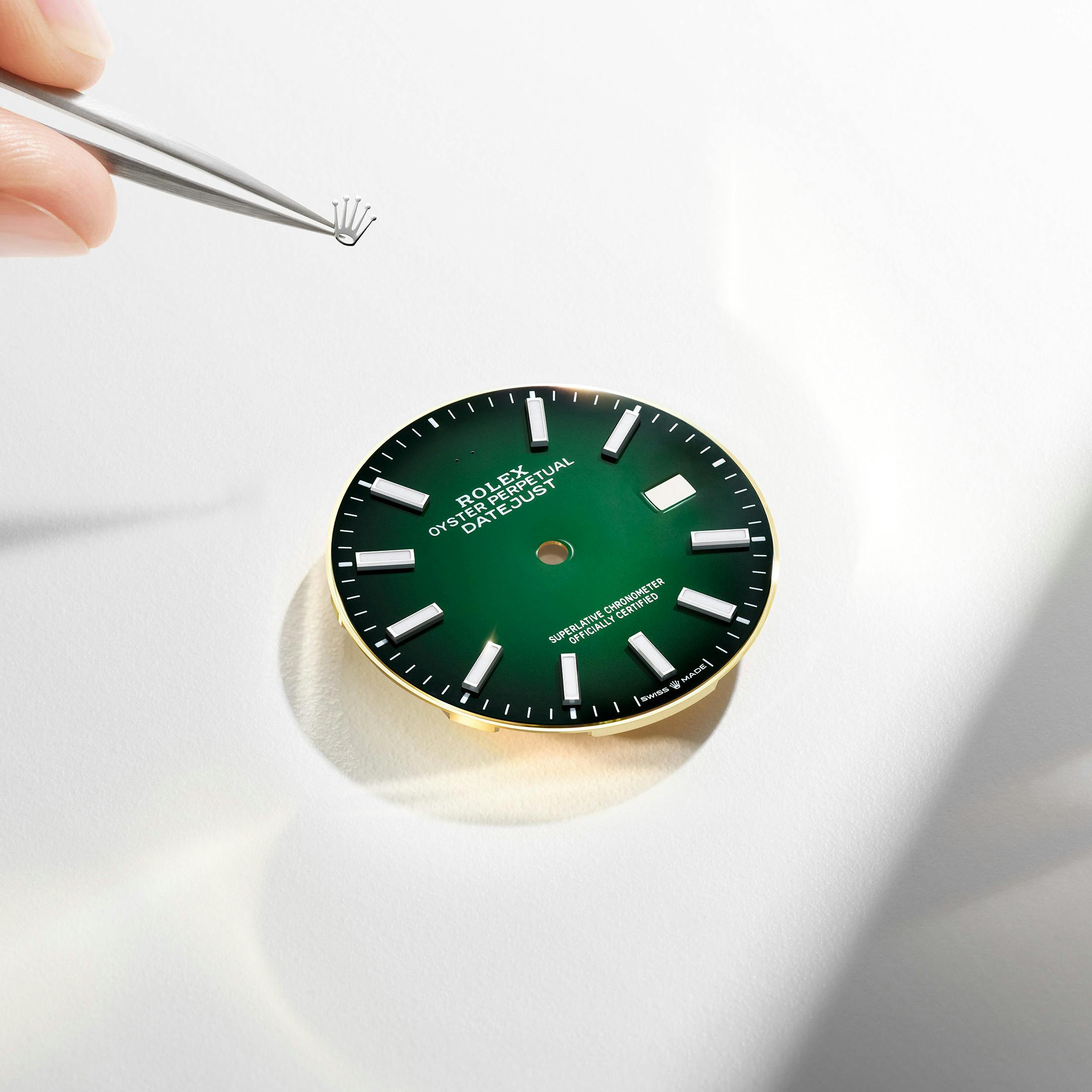 ロレックスのラインナップにおいてデイトジャストが時計の代名詞として長きにわたり果たしてきた役割を称え、さらには外敵から時計を守るオイスターケースの密閉構造の誕生から100周年を祝し、ロレックスはグリーンラッカーのオンブレダイヤルを備えた、きわめて特別なデイトジャストを発表した。
