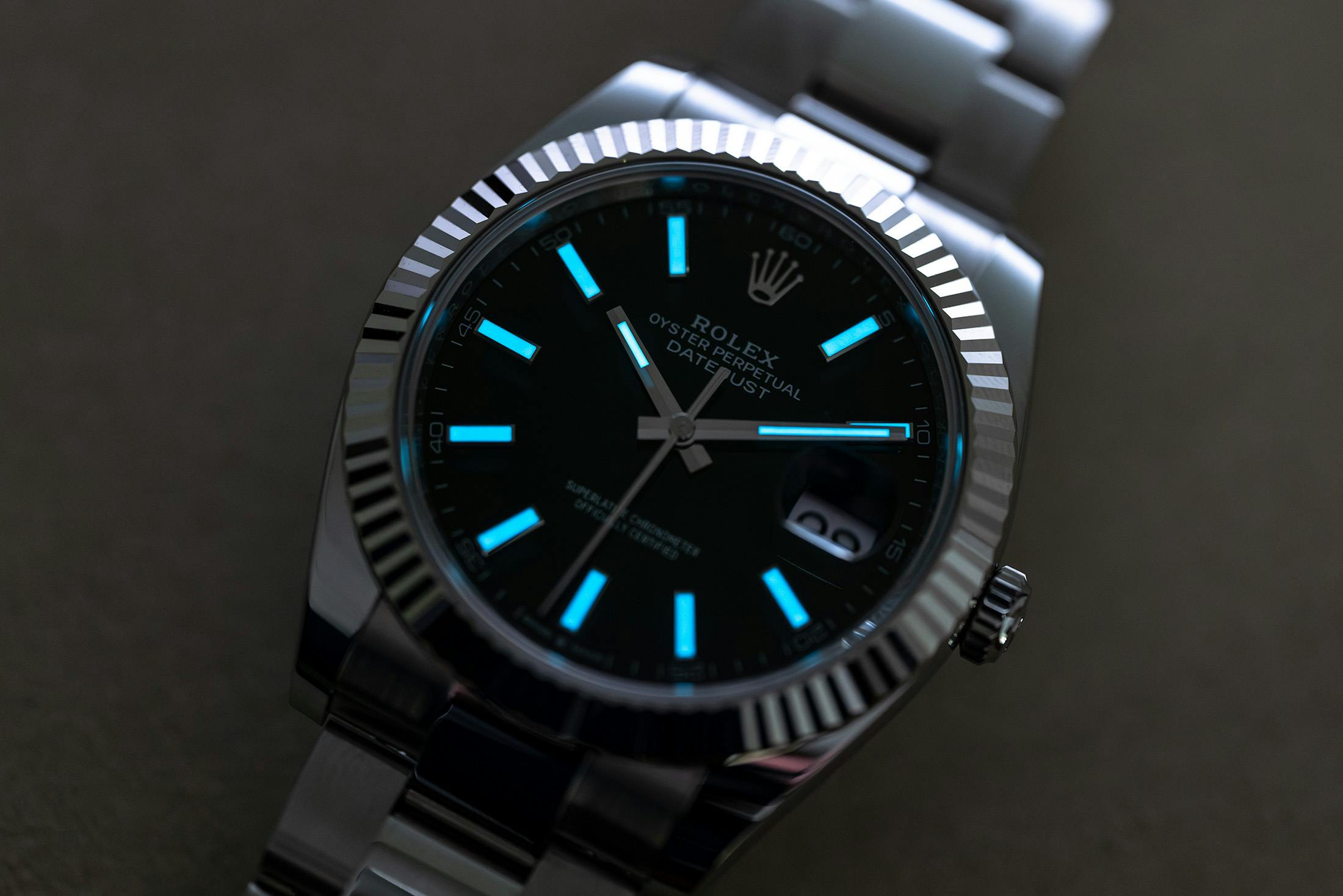 実際、大胆なオンブレを除けば、この時計はクラシックなデイトジャストそのものだ。インデックスは18Kホワイトゴールド(18KWG)製で、バトン針も同様である。どちらも白色のクロマライト夜光を備え、青く発光する。オイスタースチール(SS)製のリューズは、伝統的なトゥインロック式のねじ込み式で、防水性を確保している。
