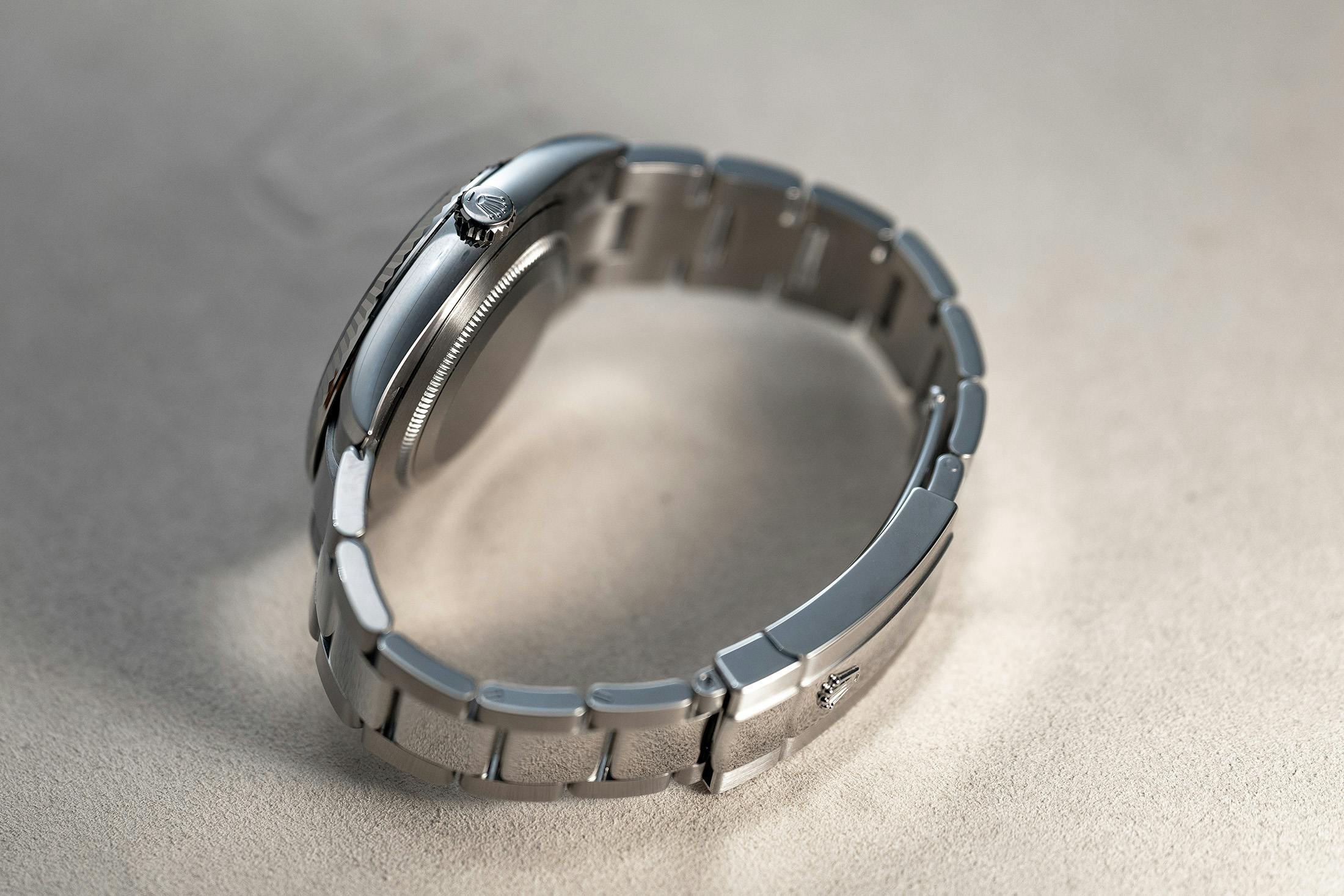 この時計は直径41mmのホワイトロレゾール製で、サテンとポリッシュ仕上げが施されたステンレススティール(SS)製ミドルケースとブレスレットに、ホワイトゴールドのフルーテッドベゼルを組み合わせている。ロレックスが2019年から一部のモデルでグラデーション(デグラデ)効果を再導入して以来、このカラーのオンブレダイヤルにラッカーが採用されたのはこれが初めての例となる。
