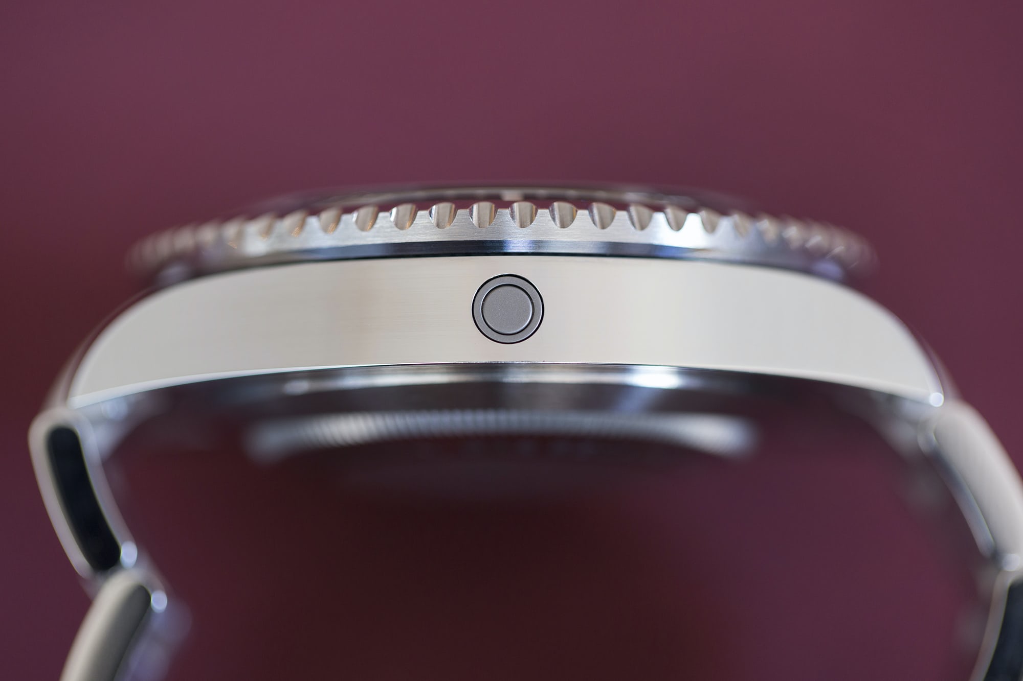 もちろん、この904Lステンレススティール無垢の製造品質と仕上げは実に素晴らしく、上の写真でもそのシャープなラインと強烈な研磨は健在だ。ヘリウムエスケープバルブはケースサイドと同じ高さにあり、ベゼルのサイドには鮮明なブラッシュ仕上げが施されている。もちろん、トリプルロック式のリューズも採用している。