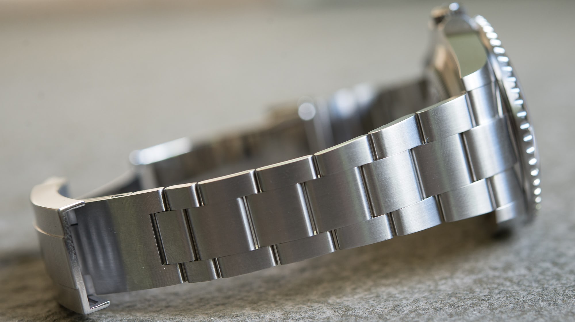 しかし、時計を裏返して観察するとフォールディングクラスプのすぐ上のリンクに、ちょっとびっくりするような擦り傷があることに気が付いた。金属同士が触れ合うのは避けられないものの、それでも新品のオイスターブレスレットにこのような傷が付いていたのは予想外だった。