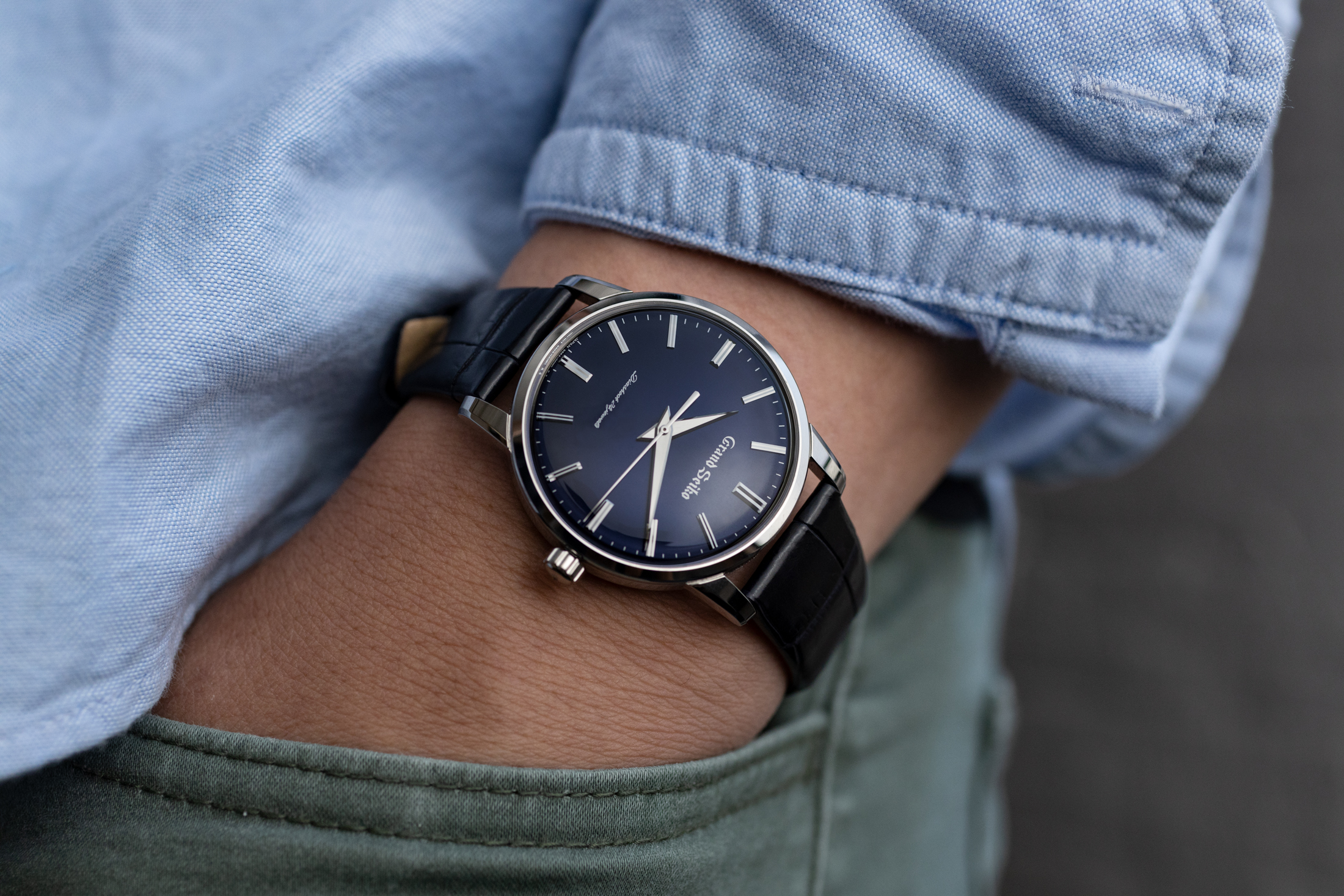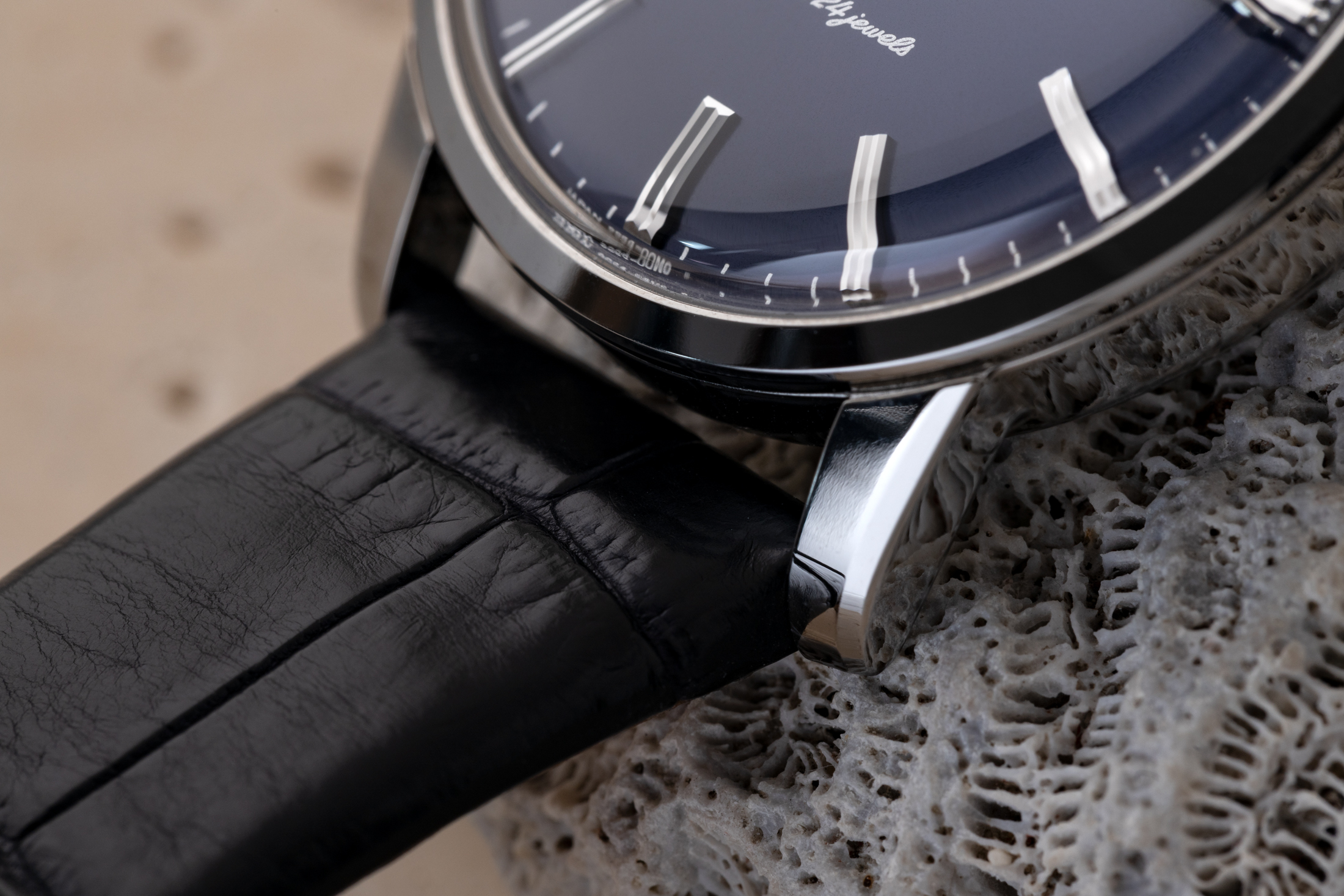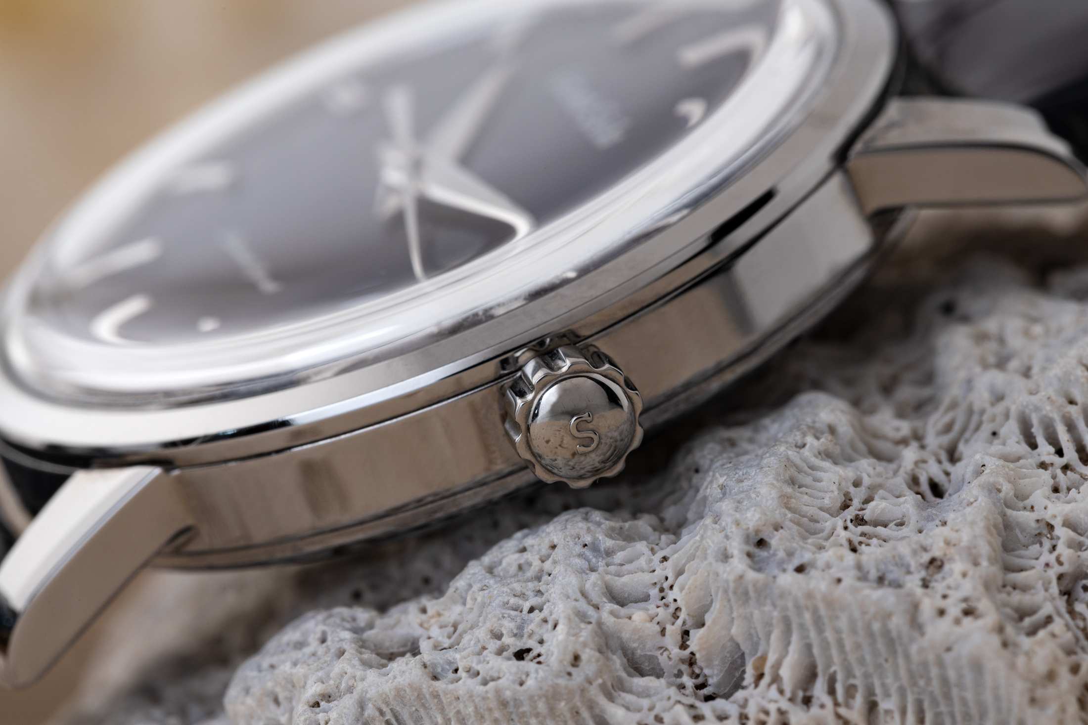 日常的な使用においては、シンプルさが最大の美点になる。リューズはつまみやすく、Cal.9S64の巻き上げを、本来あるべき私的で感覚的な喜びにしてくれる。そしてケースと針の輝きは、時間を見るたびに小気味よく、しかし確実に喜びを再発見させてくれる。38mmのチタンケースは、バランスのとれたシェフズナイフや、1950年代のクラシックフィルムのライカIIIF(史上最も美しいカメラのひとつ)のように、手首や手にジャストフィットする。