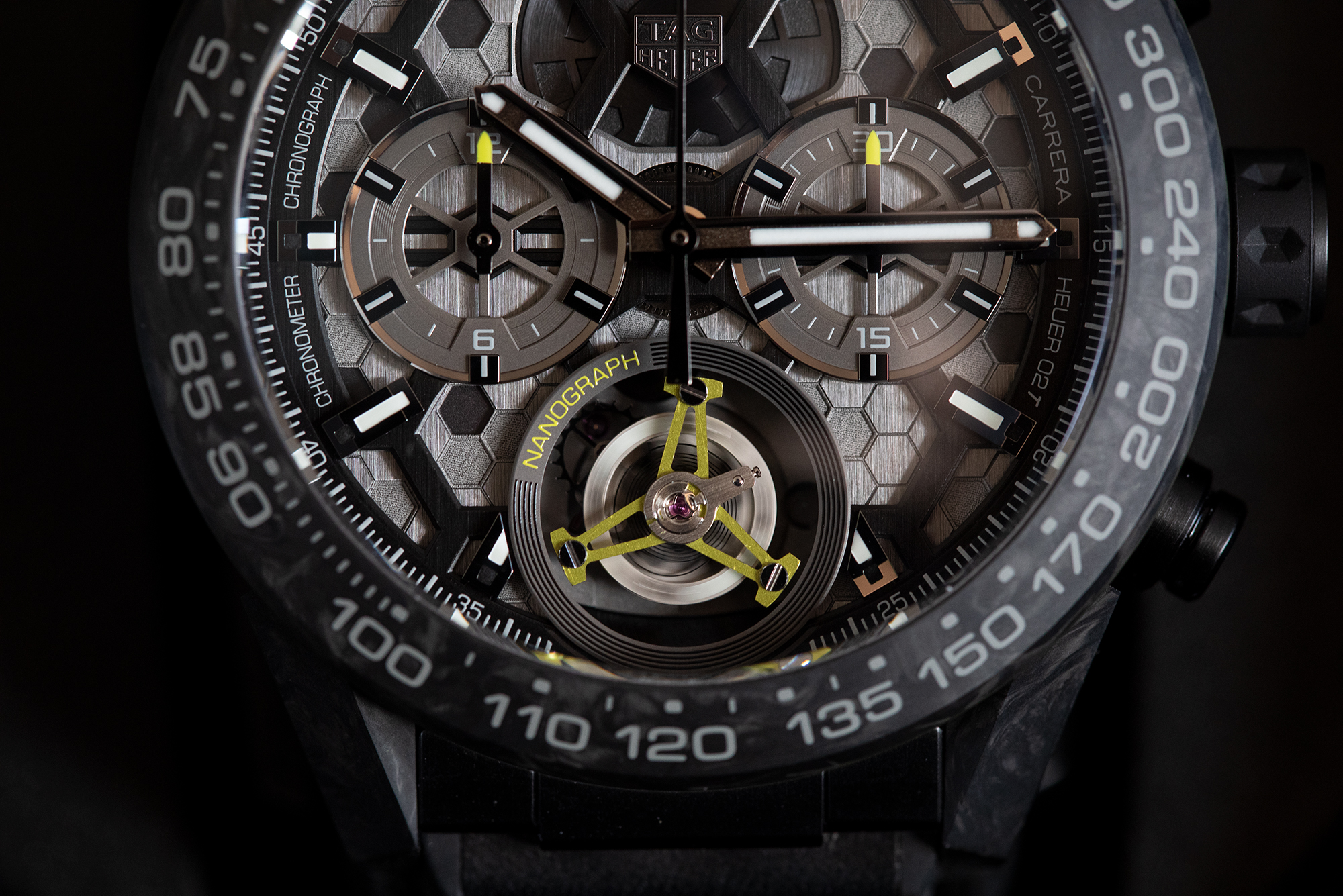 ナノグラフにおいてもう一つ興味深い特徴は、テンプがアルミニウムでできていることである。タグ・ホイヤーがアルミニウムを採用した理由としているのは、「温度の変化に最適化できる」点である。しかし、我々はここで詳細に触れたい。もう少し話を越し掘り下げてみると、単層のグラフェンは熱膨張率がマイナスとなるので、それがアルミニウムが選ばれた理由かもしれない。なぜならアルミニウムの熱膨張率は、温度によってヒゲゼンマイが失う弾性を相殺する傾向があるからだ。そうだ、全く別の観点からいえば、それはスーパールミノバでコーティングされており、純粋にデザインの観点ではこれによってとても洒落た外観になっている。そのうえ、トゥールビヨンを搭載したオープンダイヤルの時計が、暗闇では鑑賞できないという長年の問題を解決してくれる。