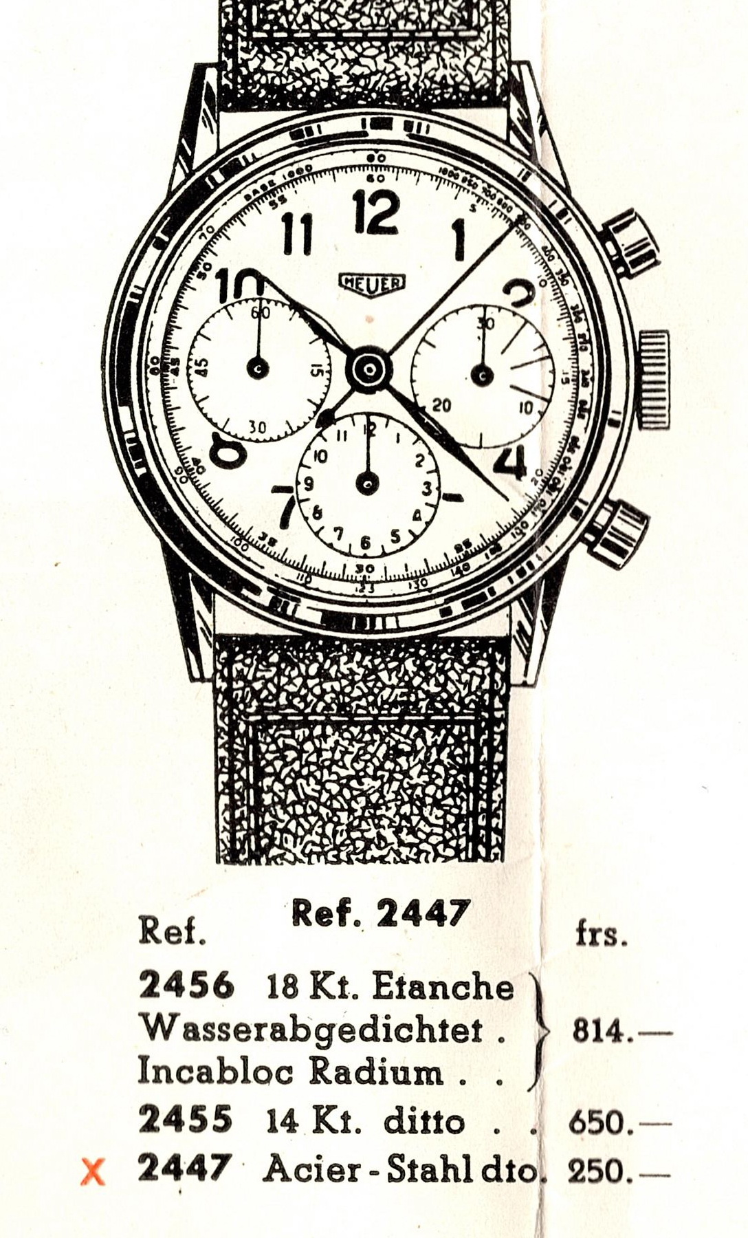 1943年のホイヤーのカタログ。ホイヤーの初代カレラの前身であるRef.2447が描かれている。
