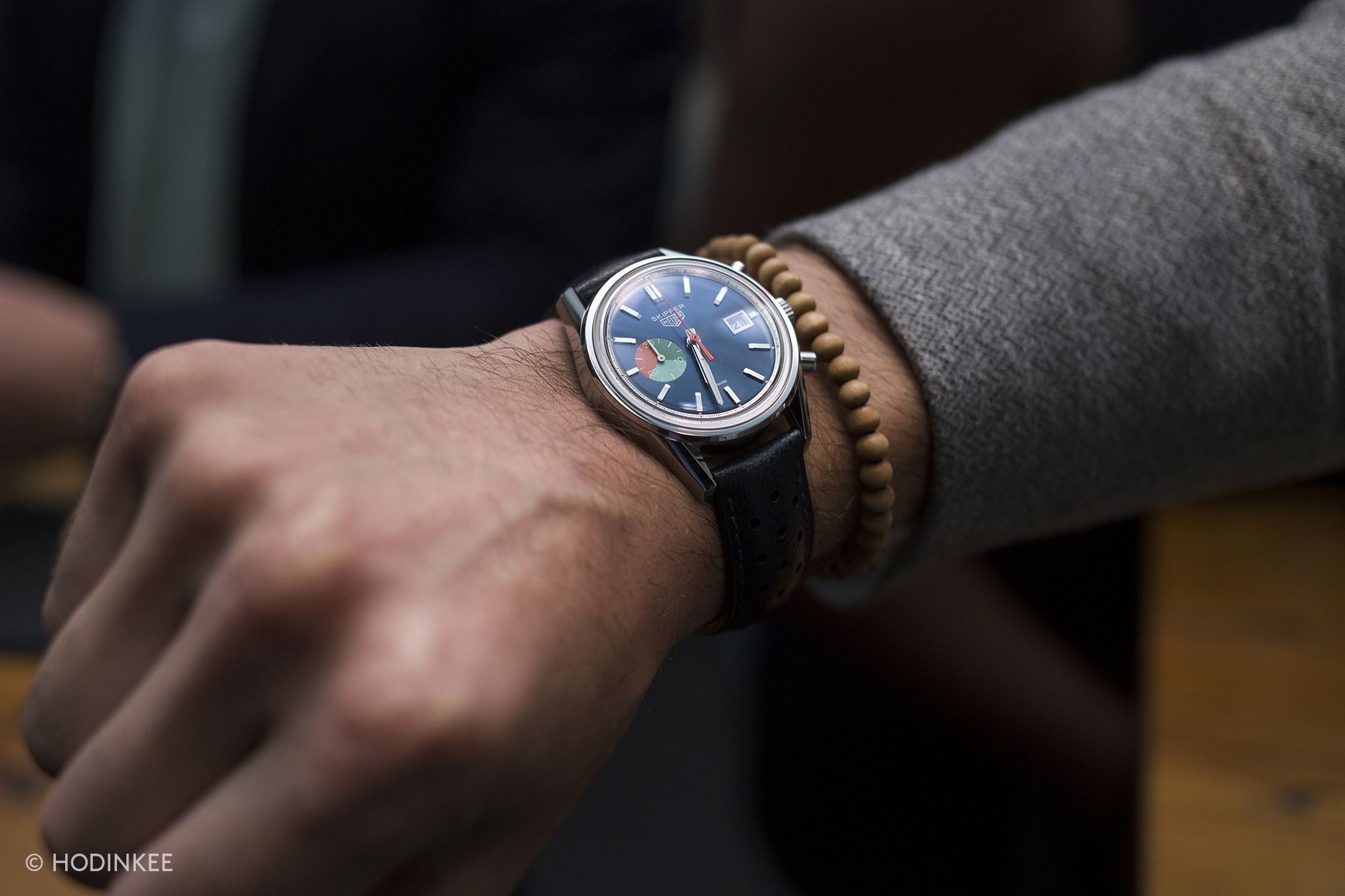 腕に着けたタグ・ホイヤー HODINKEE限定「スキッパー」カレラ。