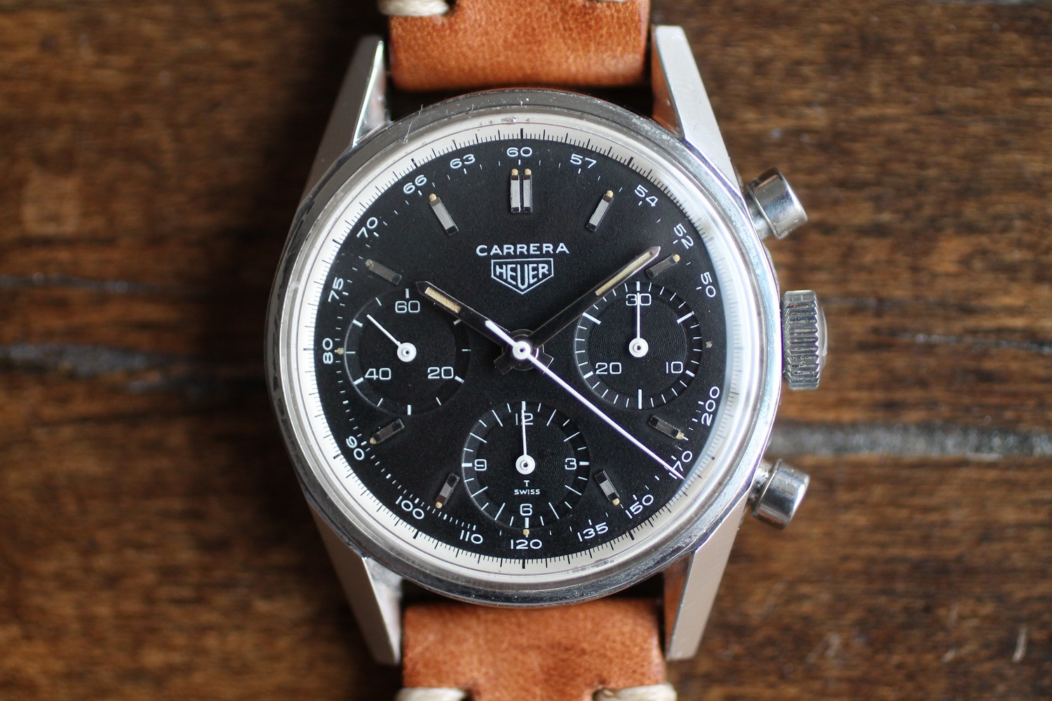 1963年にホイヤーが初代カレラを発表してから間もなく、タキメータースケールを文字盤に配したモデルの販売が始まった。Tダイアルと呼ばれるこれらの文字盤には、(少なくともホイヤーのヴィンテージ時計としては)比較的よく見受けられるものも存在するが、最も希少価値が高いモデルは、黒いダイヤル、黒い積算計、ブライトホワイトのタキメータースケールを特徴とするものだ。コレクターのコミュニティでは、このモデルは一年に1、2本見かけることがあり、直近(2017年12月)の公開オークション(クリスティーズ)で売りに出されたモデルは、実に475万円の値がついていた。