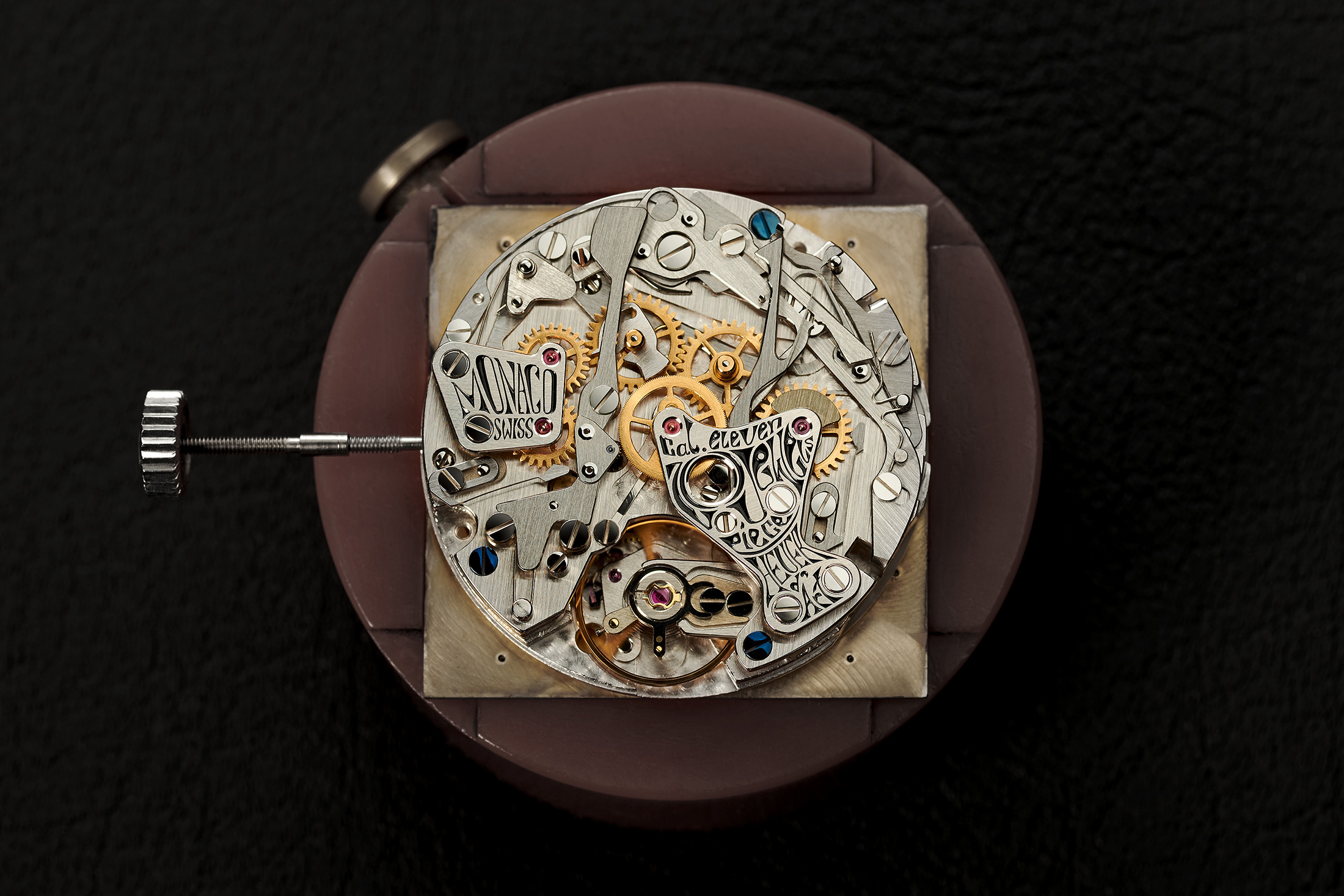モナコ ピース ダートと名付けられその特別なモナコは、ムーブメントに再度手を入れて特別な仕様に変更し、多くの特徴が一緒になったものとなっている。下写真のように、ムーブメントを完全に分解し、組み立て直し、特別な刻印を施している。通常の分解洗浄とは全く異なった処理で、Cal.11を時計師が技巧を駆使して、まさに完璧にオーバーホールしたものだ。