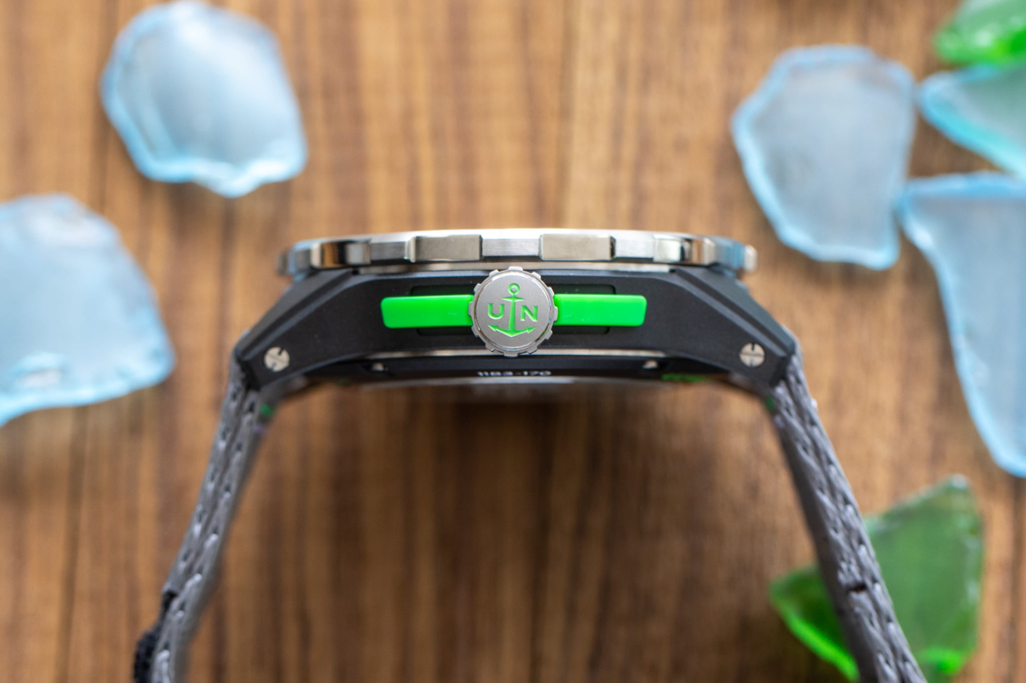 ユリス・ナルダンの通常のダイバーモデルとは異なり、バネ棒はビス留めされている。