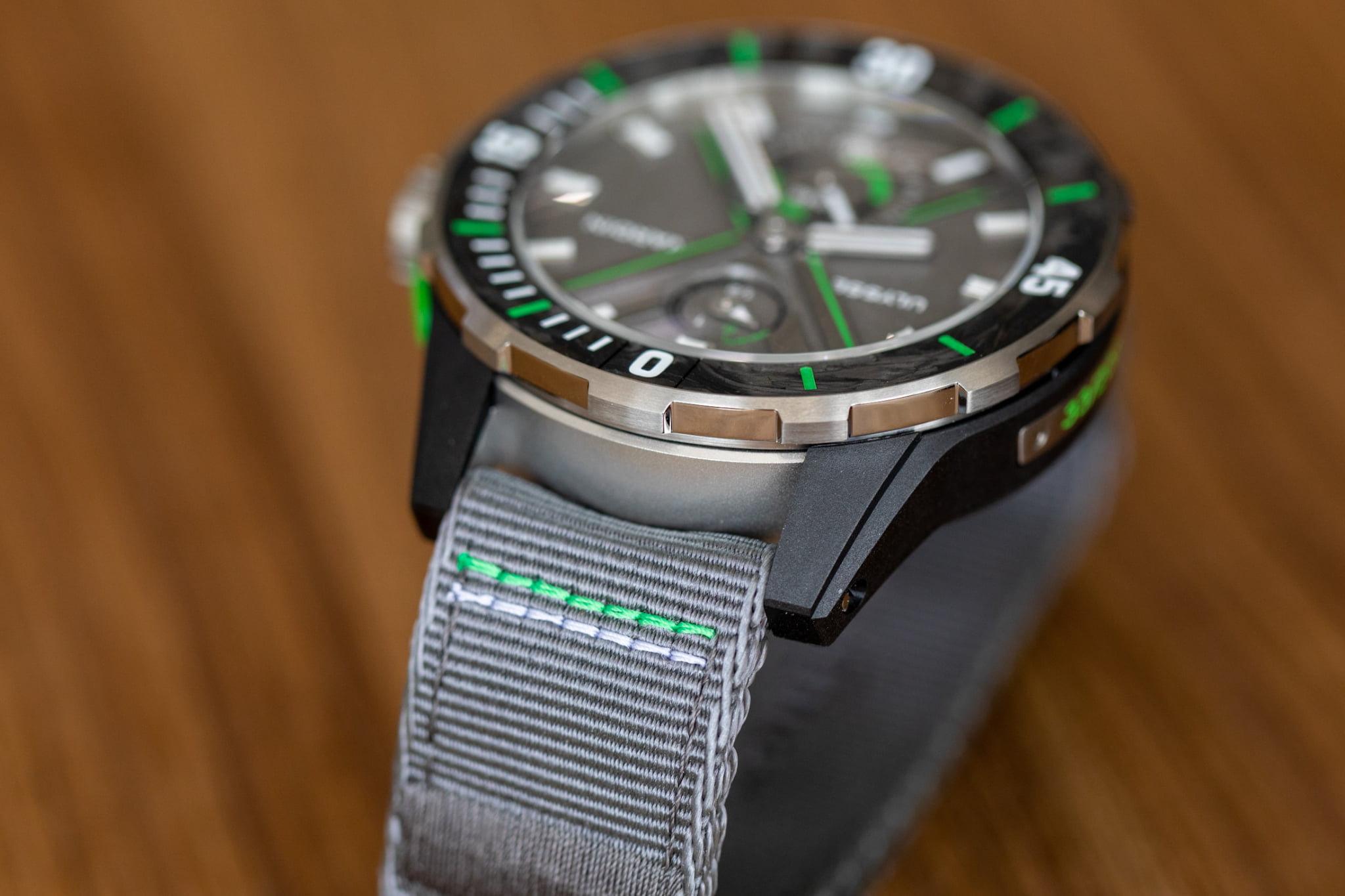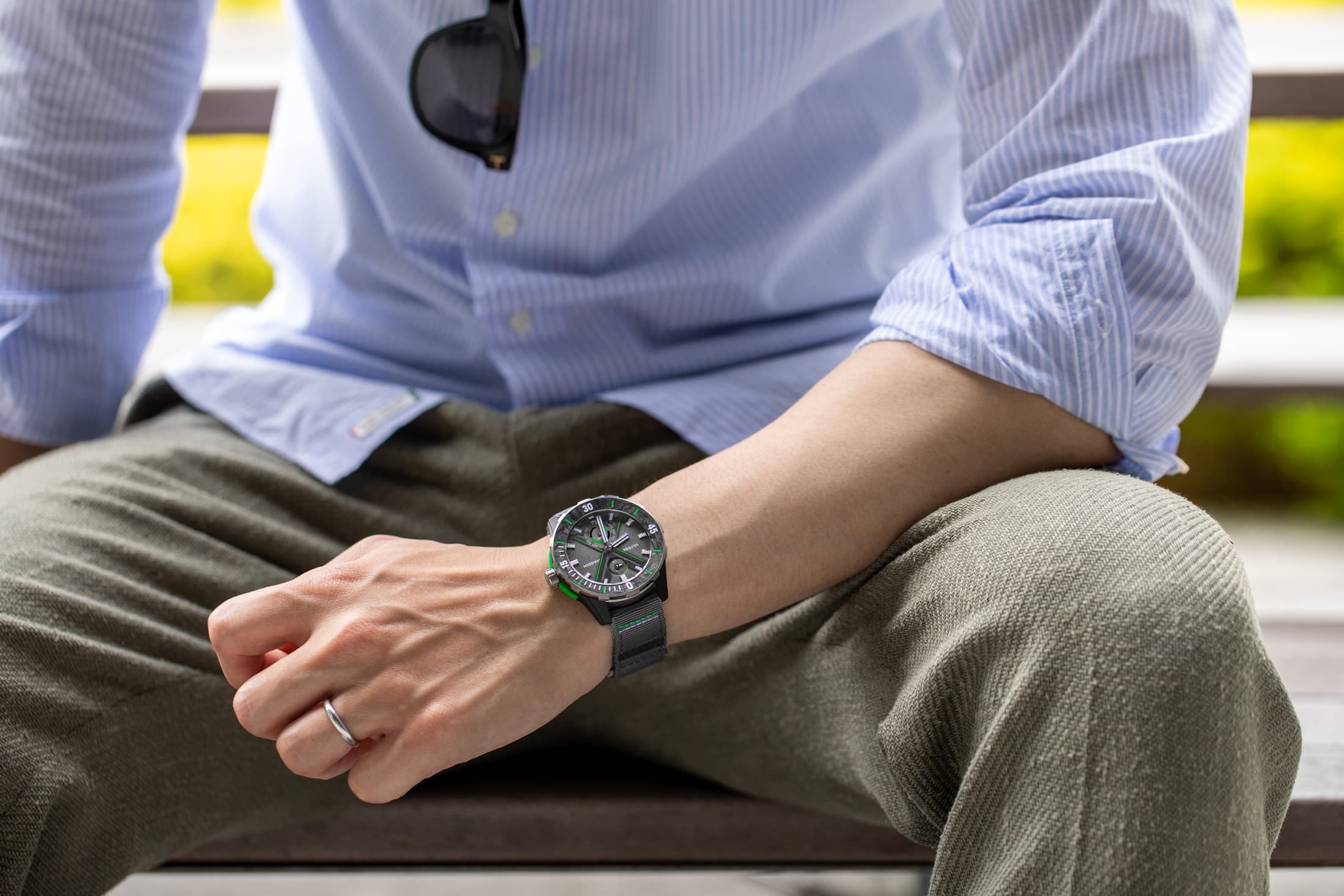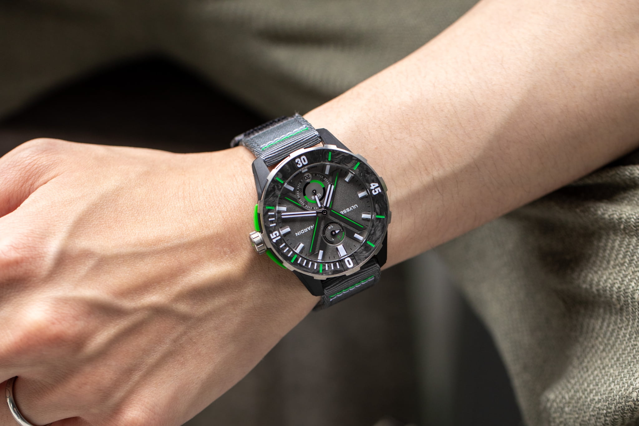 ダークグレーをベースにグリーンのハイライトがクールで、特にカーボニウムベゼルの独特な模様が目を引く本機は、これからの季節、アクティブなシーンに連れていきたくなるような時計です。