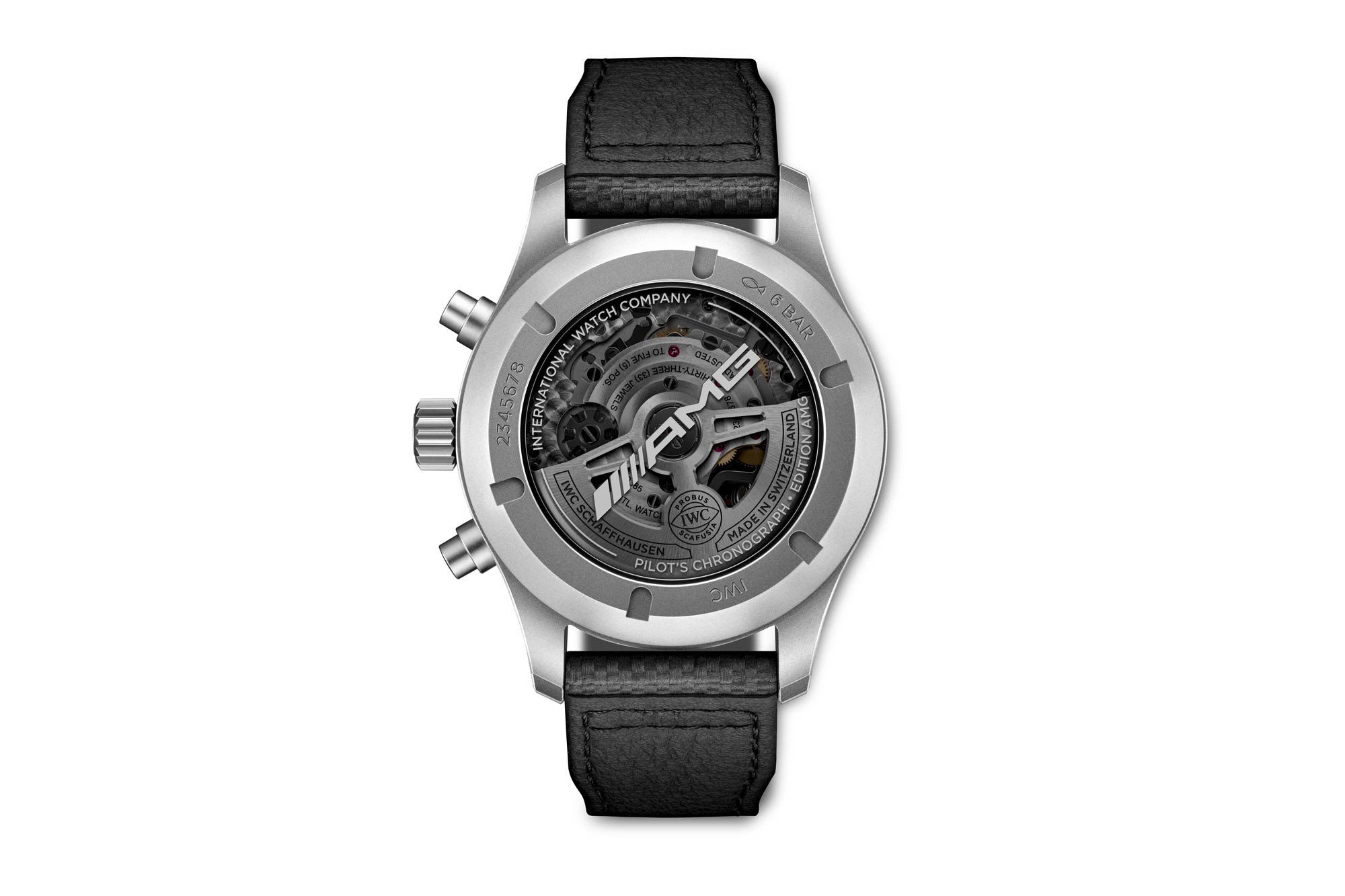 しかしIWCは、メルセデス社内のチューニングとモータースポーツ部門であるAMGに敬意を表し、この時計に関しては常に慎重を期しているようだ。ケースバックにAMGのブランドロゴを配しし、クルマのイメージを質感や素材を随所で表現している。