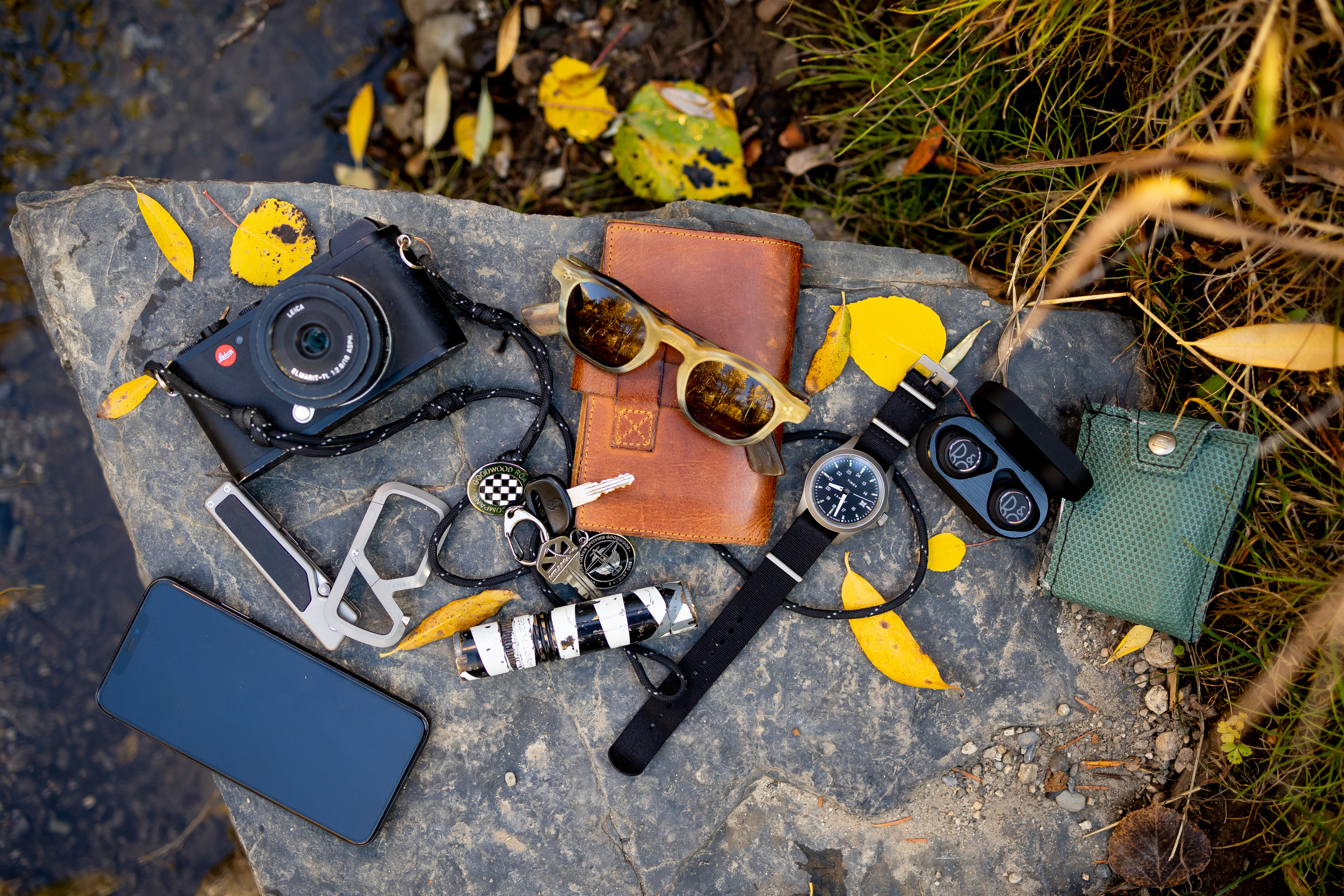 1)iPhone、2)HODINKEEのオフィスからお下がりのライカ CL、3) JBのチャプターナイフ(チタン製)、4)JBのメルヴィル(チタン製)、5)使い込まれたMuyshondtメイスンのプロトタイプ フリーガー エレクトリック トーチ(ラズルダズル迷彩柄)、6)1995年に購入した日産スカイラインのキー 、7)バンコクの古い工房でベン・ヴィアピアナ(Ben Viapiana)と一緒に作ったパスポートカバー、8)セイム・オールド・ デイズによるタイのバッファローホーンを使ったカスタムサングラス、9)JB × タイメックス エクスペディション ノース、10)バング&オルフセンのベオプレイ E8 スポーツヘッドフォン、11)60年代のビュイックに使われていたデッドストックのビニールで作った財布