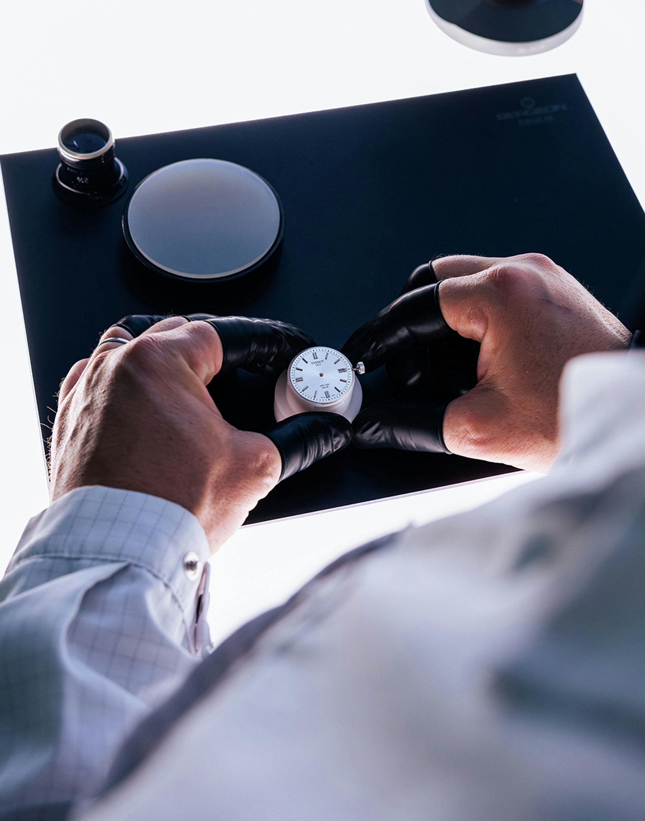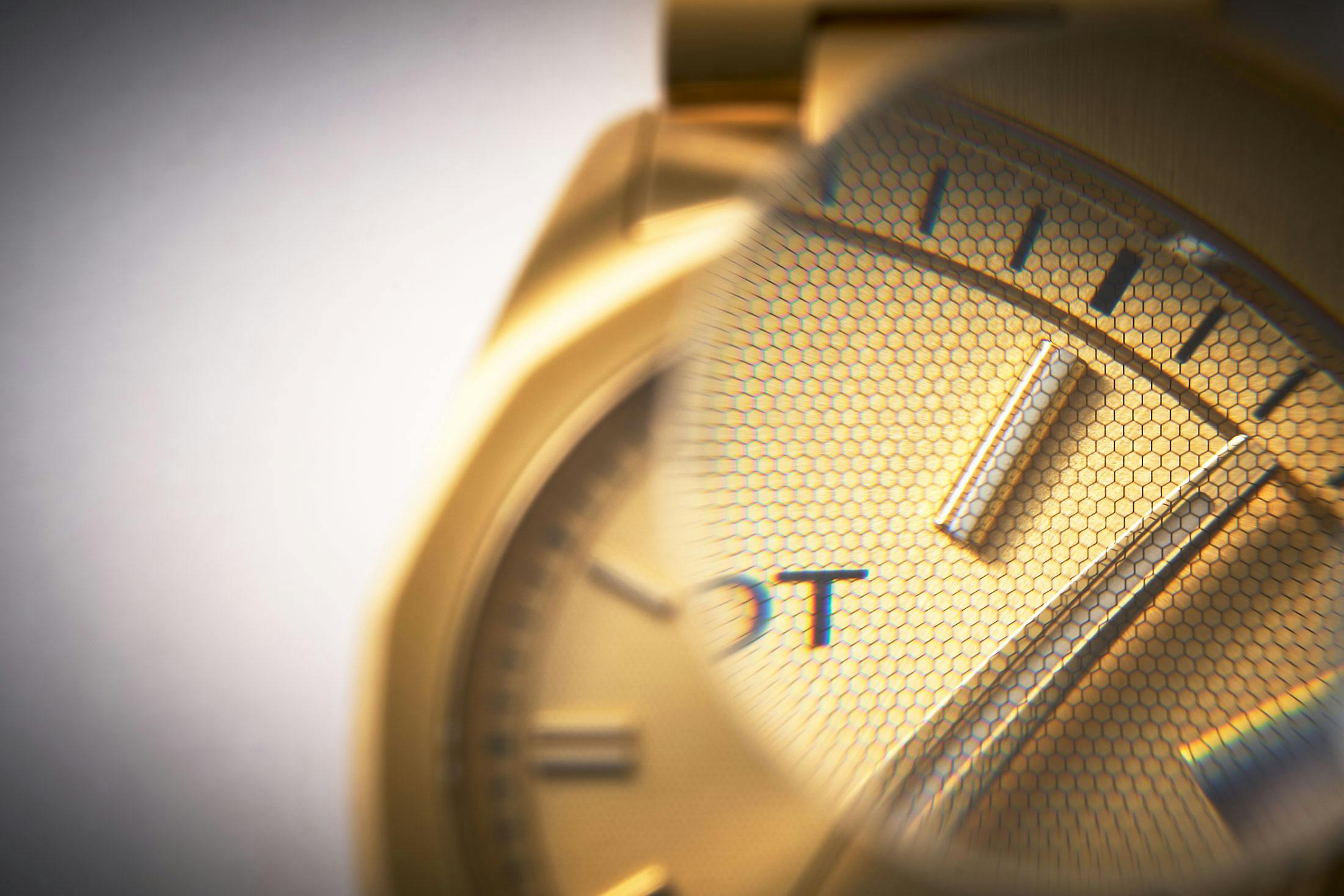 サファイアクリスタルに圧着したソーラーセルは、画像のように極端に拡大しなければハニカムのパターンをほとんど確認できないだろう。風防自体の厚みも通常とほぼ変わらず、34mmの小径モデルでも受光性能に大きな差はない。そして何よりもそのメリットは、文字盤表現の自由度にある。ソーラーセルを透過性の高い樹脂で覆う従来の構造とは異なり、メタルや天然素材、さらにカラーやその濃淡、ギヨシェなど装飾への制約もない。これによって伝統的な文字盤の様式を損なうことなく、先進の実用機能を享受できる。視点を変えれば、スイス時計の基軸となる仕様を変えることのない革新的な技術だからこそ、ティソは満を持してライトマスター ソーラー テクノロジーを搭載したといえるのではないか。そこからは1853年に創立し、スイスの国民的時計として親しまれているティソ本来の姿が浮かび上がってくるのである。
