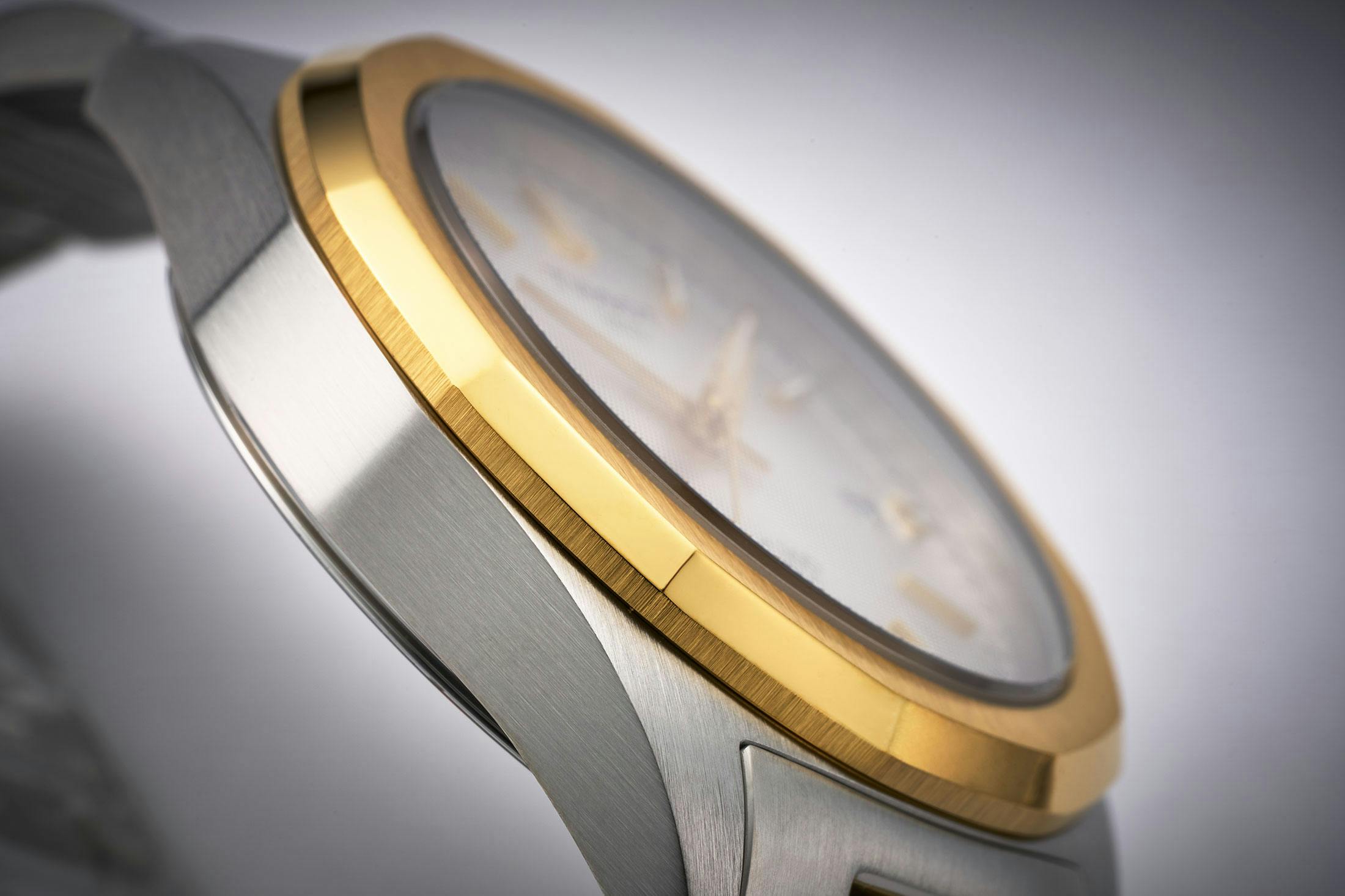 厚みを抑えたケースもソーラー搭載を感じさせず、むしろデザインによって内在する光のモチーフをより強く主張する。全体は洗練された面の造形からなり、ポリッシュとサテンを組み合わせた仕上げで上質感を醸し出す。そしてH字型ブレスレットのリンクをはじめ、ファセット加工の12角形ベゼルや角張ったインデックスと針など、あらゆるディテールに「光を捉え、反射する」表現が施されている。これは、ソーラー機能の命とも言える太陽の輝きに着想を得たものだという。滑らかな曲線を描くラグは、そのあいだに描かれた緩やかな凹みのシェイプが有機的な印象を与える。シャープな面で構成したエッジィなPRXとは好対照な、まさにクラシックなデザインだ。