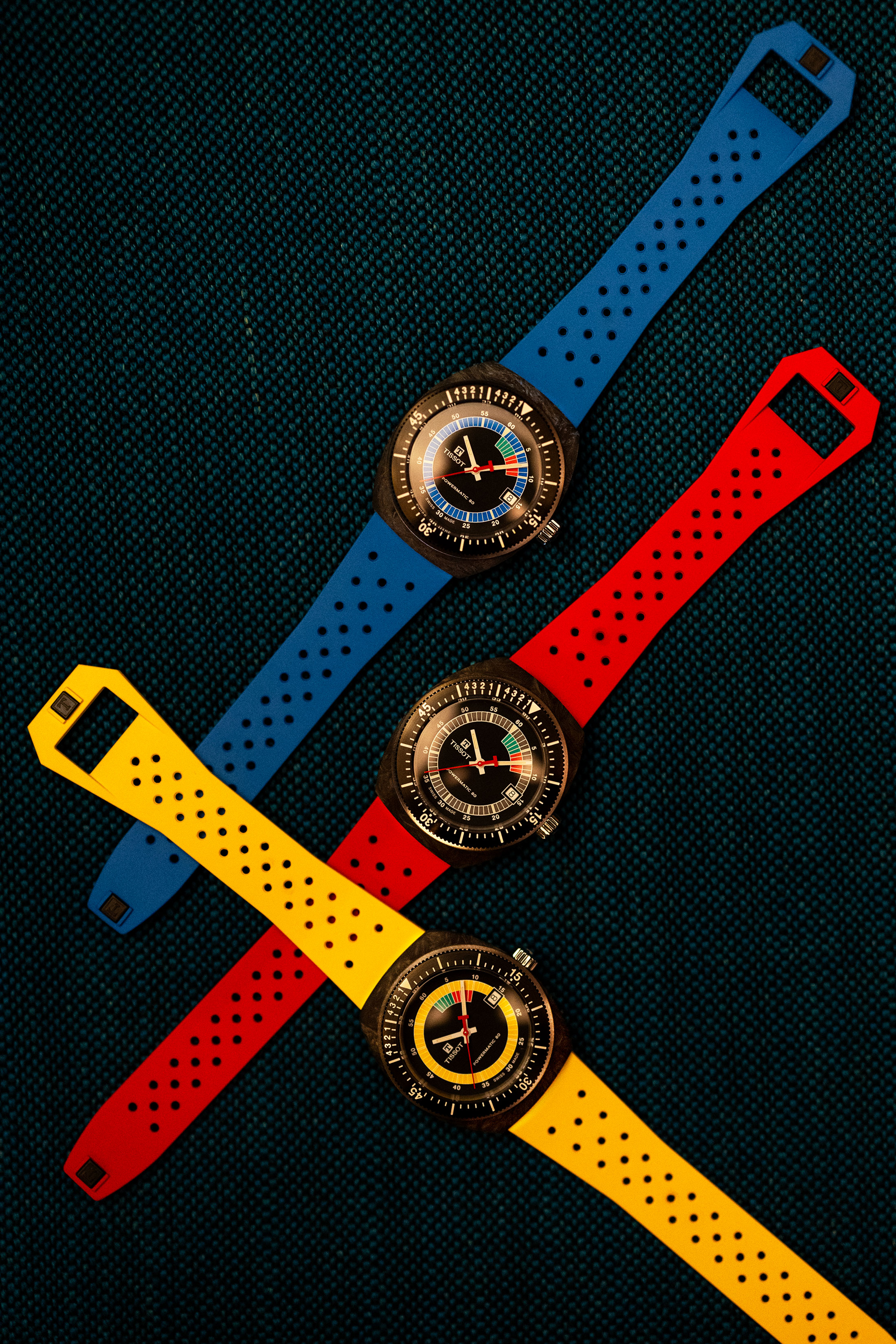 全3モデルのダイヤルデザインは、それぞれストラップとの相性を考慮したもの。後述する別売りのラバーストラップとの付け替えをイメージして選ぶのも面白い。41mm径。300m防水。自動巻き(Cal.POWERMATIC 80.111)。