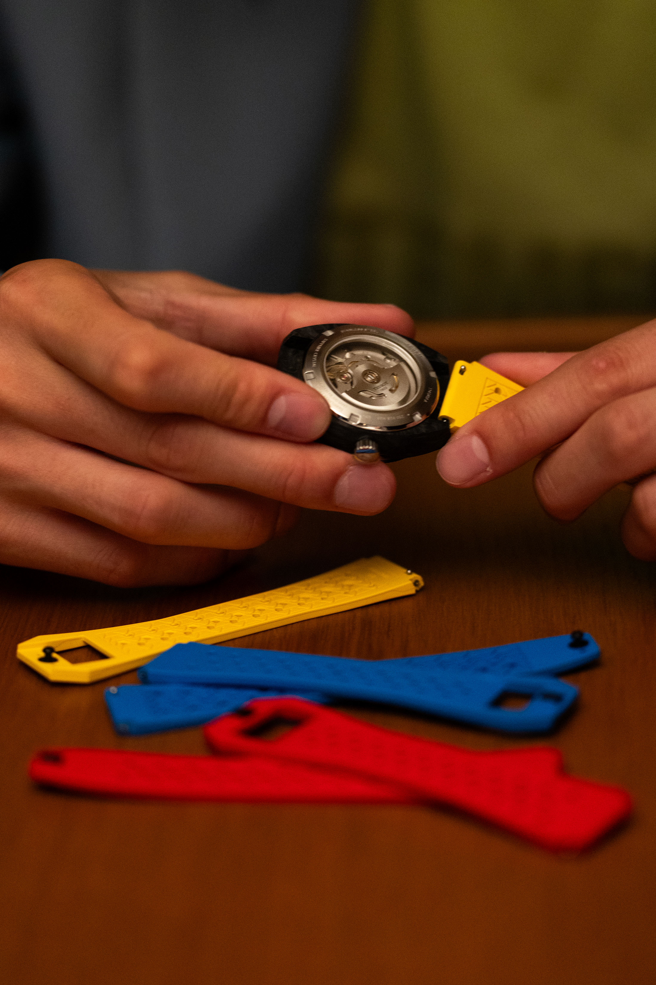 なお、新作ティソ シデラルでは、シデラル Sでも採用されたクリップシステムのストラップを採用している。これはラバーストラップの末端に設けた凸部を、パンチングされた穴に留めることで腕に固定する機構だ。優れたフィット感に加え、アジャストの自由度も高く、腕周りのサイズが異なるパートナーとのシェアもできる。さらにインターチェンジャブル機構により、専用工具を使わず簡単に着脱できるので、ファッションやシーンに応じて異なる個性を演出することも可能だ。デフォルトのカラーのほか、グリーン、オレンジ、ブラックのカラーバリエーションも用意されており、さらに楽しみは広がるのだ。