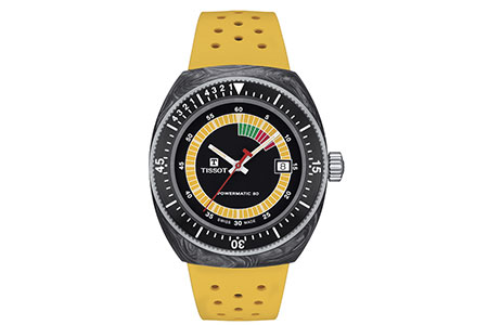 ティソの新作シデラルがモチーフとしたのが、1971年に同ブランドから登場したシデラル Sだ。そのルーツはさらに1969年に遡り、初代シデラルは、グラスファイバーを世界で初めてケースに採用した時計として知られている。軽量かつ衝撃や錆びにも強い特性と斬新なデザインから、世界で広く支持された。そして多くのスポーツ愛好家に愛用されたことから、当時の人気スポーツであったレガッタのカウントダウン機構や躍動感あるイエローカラーを纏い、初代でも好評だったストラップ留めのクリップシステムを踏襲したスポーティな仕様でアップデートを果たした。これが、シデラル Sだった。