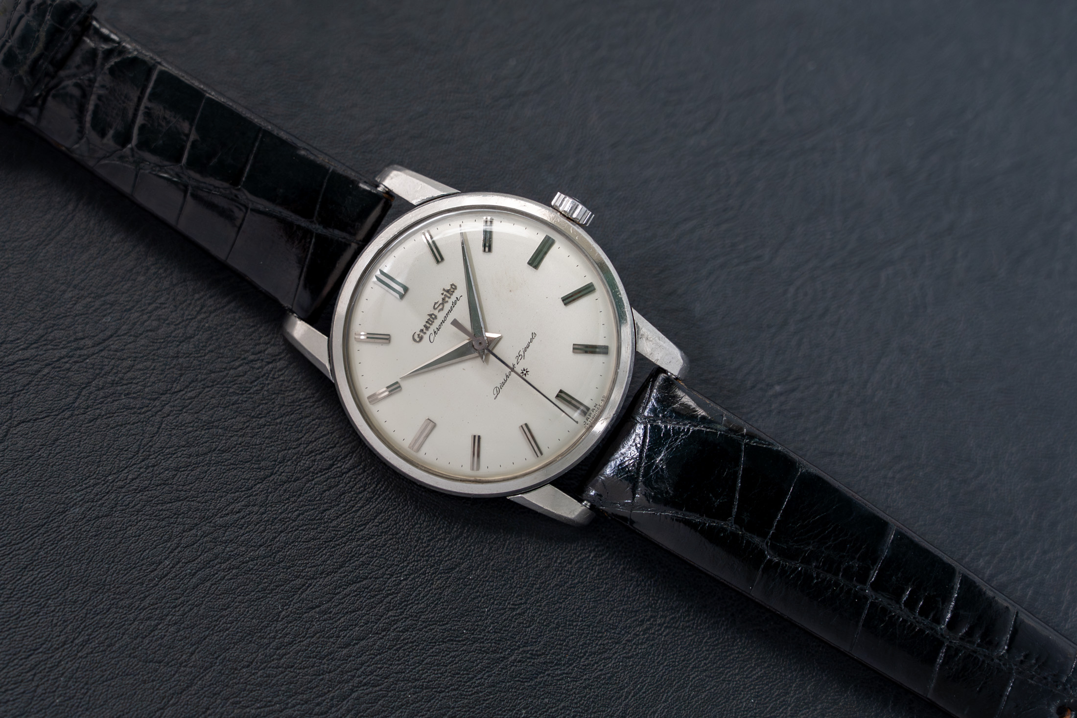初代グランドセイコーは1960年の誕生から約3年間のみ製造されたモデルで、その生産数自体が限られていました。そのなかでも、ごく一部にのみ存在するプラチナケース仕様は、静かな存在感を放つ特別な一本です。