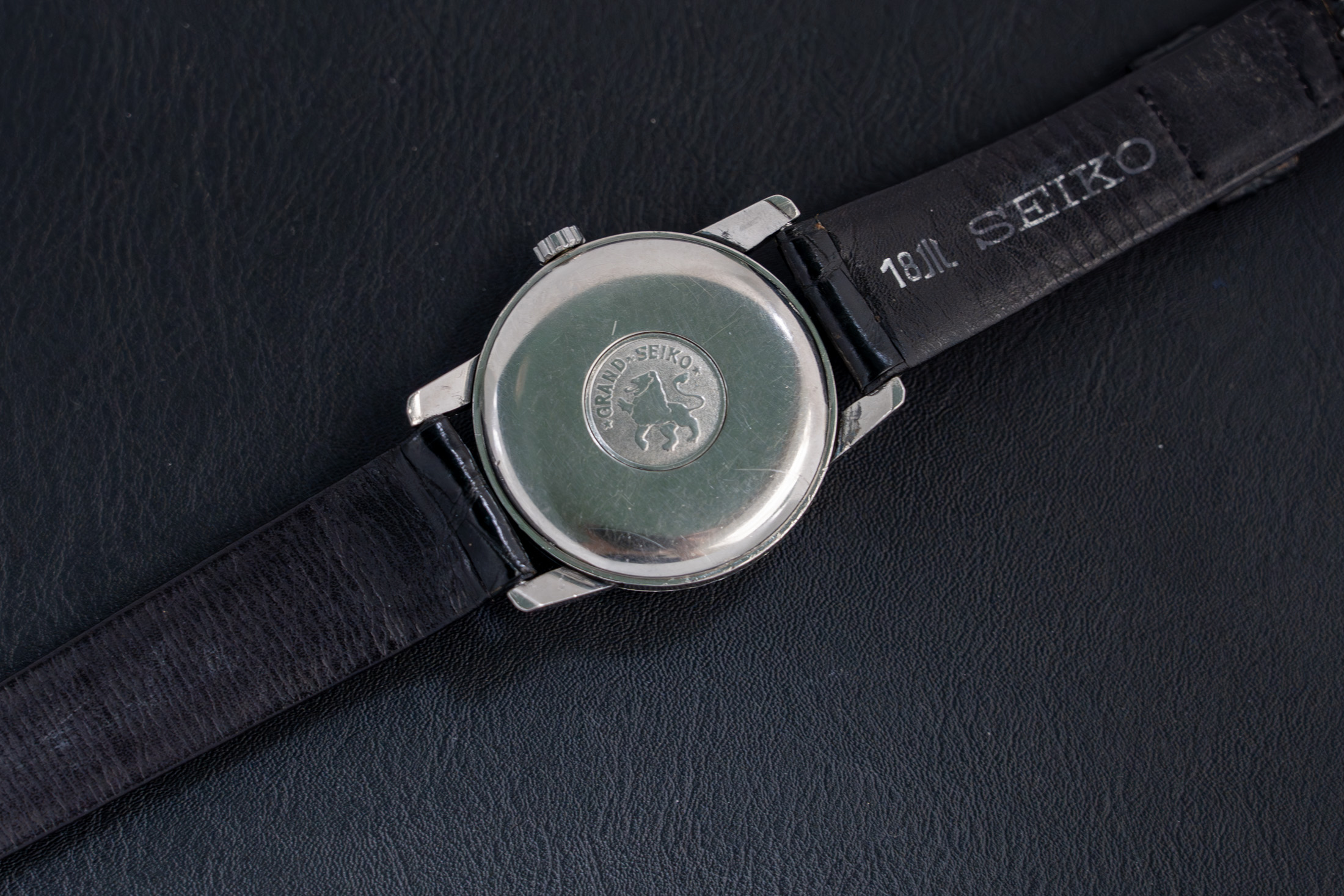 初代グランドセイコーのほとんどは14金張りケースで作られましたが、このモデルにはプラチナケースが採用されています。長らく実在は知られつつも、市販の証拠が確認されていませんでしたが、2010年頃に1963年度版の定価表が発見され、当時14万円という価格で実際に販売されていたことが明らかになりました。これは同時代の金張りモデルと比べても、突出した高級品だったことを示しています。