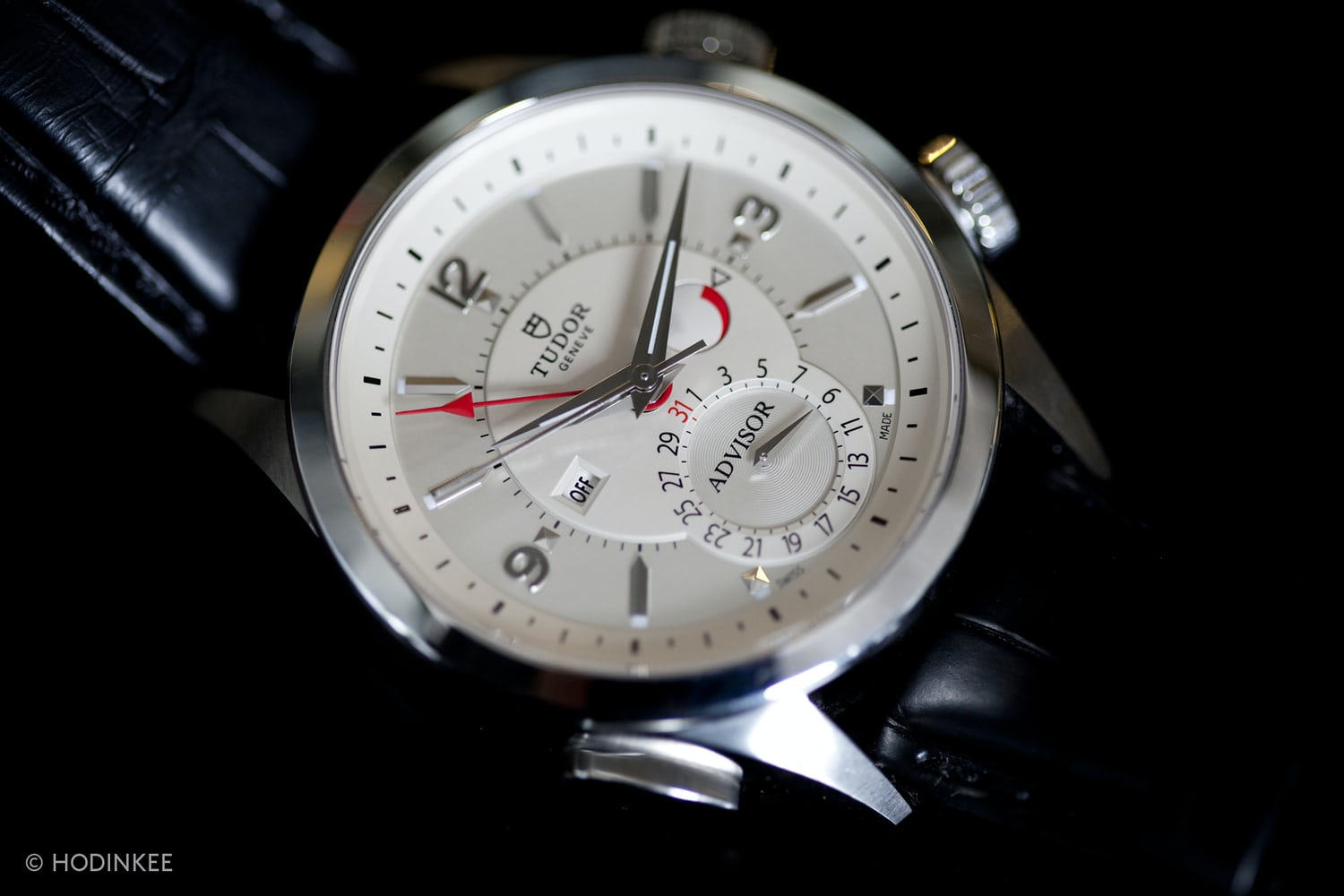 チューダーは、アラビア数字(12、3、9)とバトン型のインデックスを組み合わせたデザインを採用している。ダイヤル内側にはミニッツトラックが配置されており、真っ白なダイヤルと対照的なベージュ色を採用している。3時位置には、アラーム機能のパワーリザーブがグラフィカルに表示されている。最後に、6時位置には、内接する円ダイヤルとデイト表示インダイヤルが重なっており、かなりのスペースを割いている。