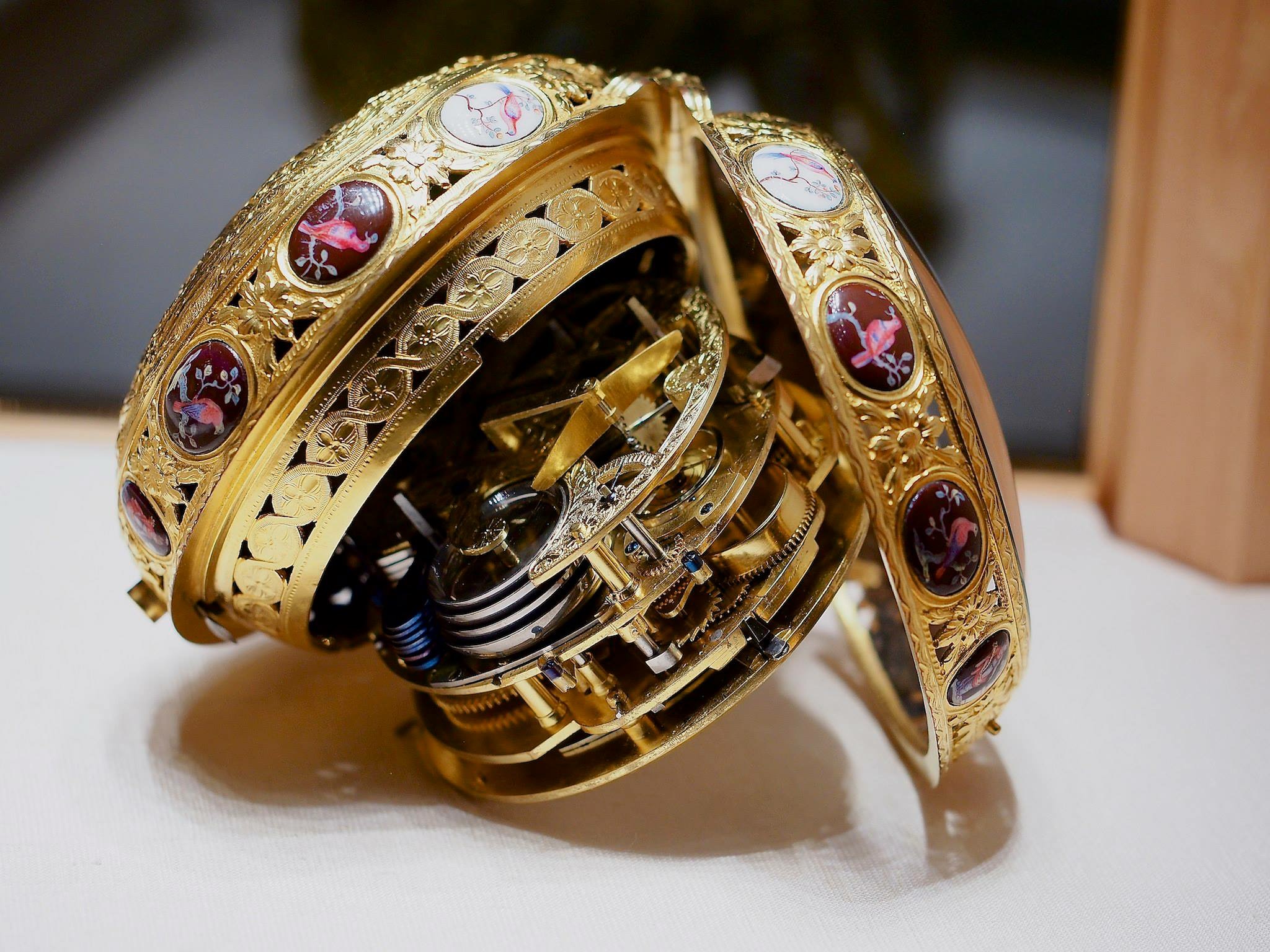 これは、非常に初期のドイツ製卓上時計で、16世紀半ば頃にアウグスブルクで作られたものだ(アウグスブルクは当時、ヨーロッパにおける時計づくりの中心地のひとつであった)。携帯用小型クロックの第1世代のひとつであり、金属製ゼンマイを動力としていた。ここから、ウォッチと呼ばれる最初の時計が派生していったのだ。携帯用クロックとウォッチとの間に明確な違いはない。どちらも、動力源としての金属製ゼンマイの開発により実現したものだ(それに対して最初期のクロック時計は、ロープや鎖の重みが動力源であった)。このクロック(もしくはウォッチの祖先)は、ご覧のように非常に厚みがあるが、これは主に、当時のクロックやウォッチに広く採用されていた2つの機構によるものだ。バージ脱進機と、円錐型のフュジーである。その後200年間ほど、時計の一般的な構造はそれほど変化せず、2枚のプレートの間をピラーで仕切り、ギアを取り付けるというものだった。ウォッチは美しさや複雑性を増していったが、18世紀中頃まで、そのサイズが縮小し始めることはなかった。下のウォッチは、1730年頃にロンドンでショーベルにより作られたものだ。4つのベルを鳴らして15分毎に時刻を知らせるクォーターリピーターである(ベルとハンマーが左側に、空気抵抗で機能するゴング用レギュレーターが右側に見える)。言うまでもなく非常に美しいが、この時点ではまだ非常に分厚く、依然として、バージ脱進機とピラーやプレートを使った構造に依存していた。