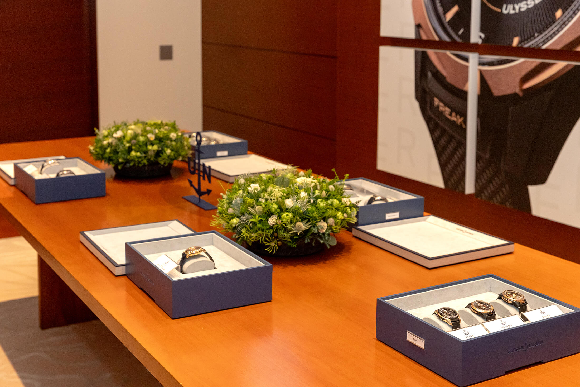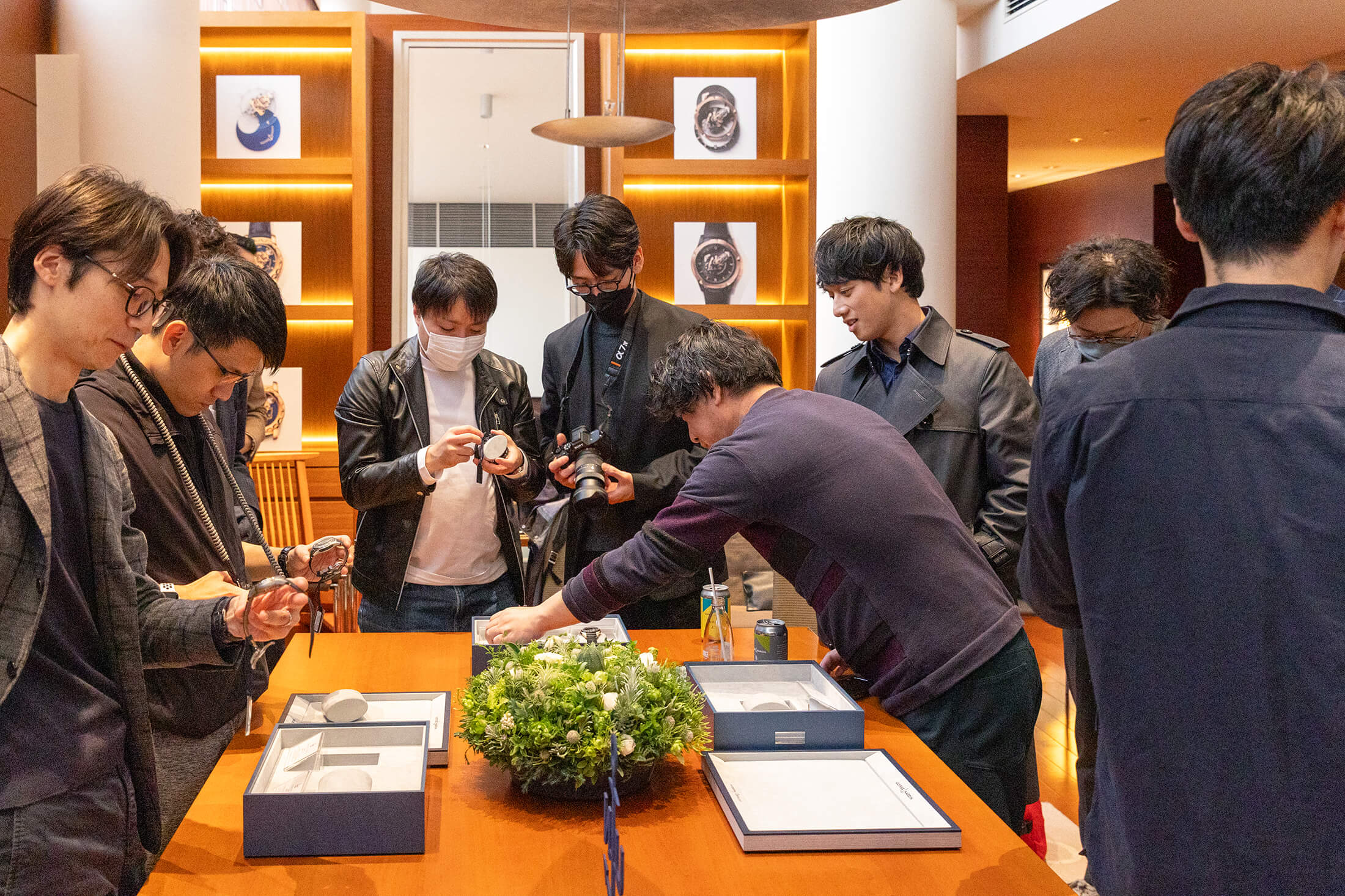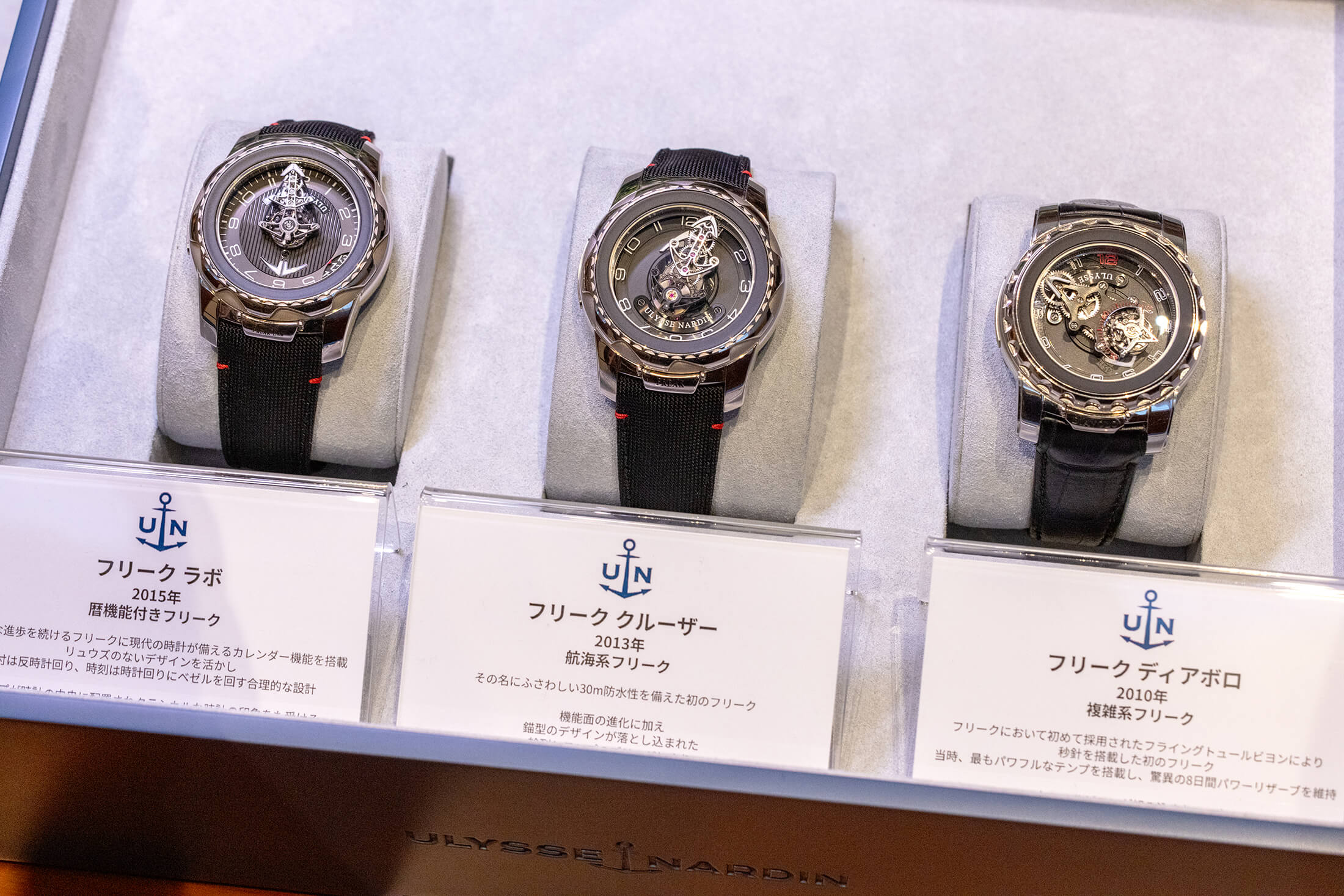 フリークの歴史を振り返るトークイベント終了後は、来場して下さった読者の皆さんと編集部も参加してのコレクターミーティングの時間に。そして、なんと言っても目玉のコンテンツは、歴代フリークのタッチ&フィールだ。2001年に発表された初代フリークをはじめ、マイルストーンとなった歴代モデル(一部)から現行のフリークコレクションが並べられ、そのすべてが実際に触って着用することができる。フリークコレクションはユリス・ナルダンのアイコンともいえるモデルだが、製造数は決して多くはなく、どの時計店でも扱っているようなコレクションでもでもないため、実機を実際に見ることができるまたとない機会となった。