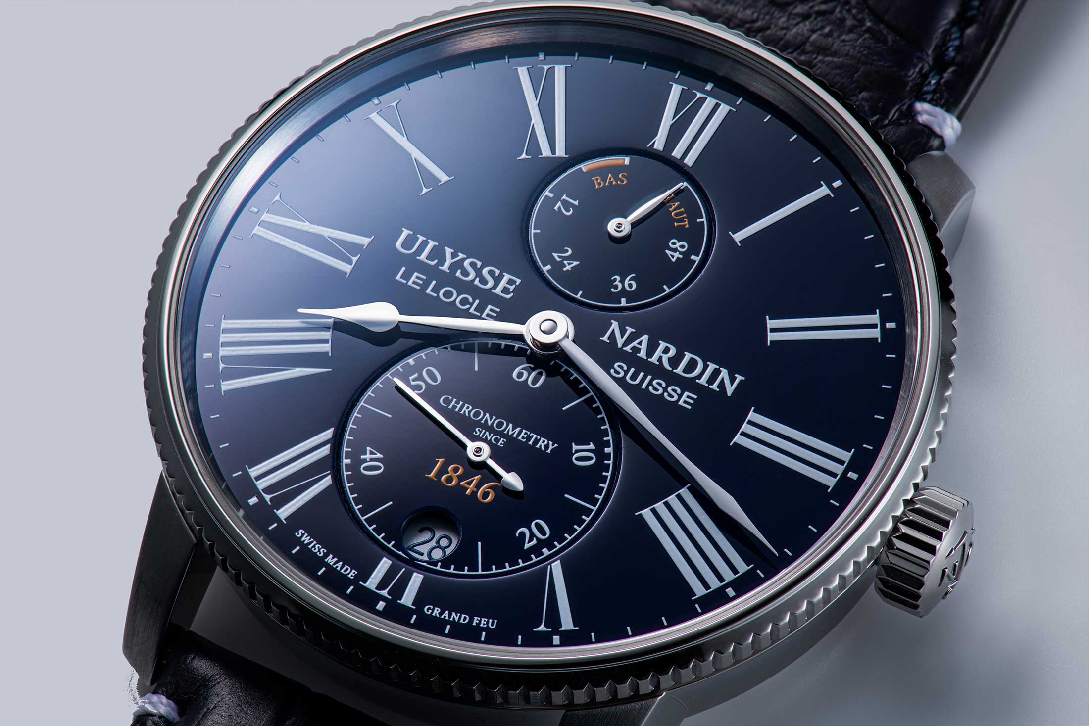 そしていまやグラン・フーを始め、クロワゾネ、シャンルベ、フランケといったエナメル技法を駆使し、ユリス・ナルダンの至高の美を支えている。ブルー文字盤はエナメル独特の艶が風格を漂わせ、さらにマリンクロノメーターを出自にした次世代の先進技術を漂わせる。そんな時を超越した技術の邂逅こそブランドの真価である。