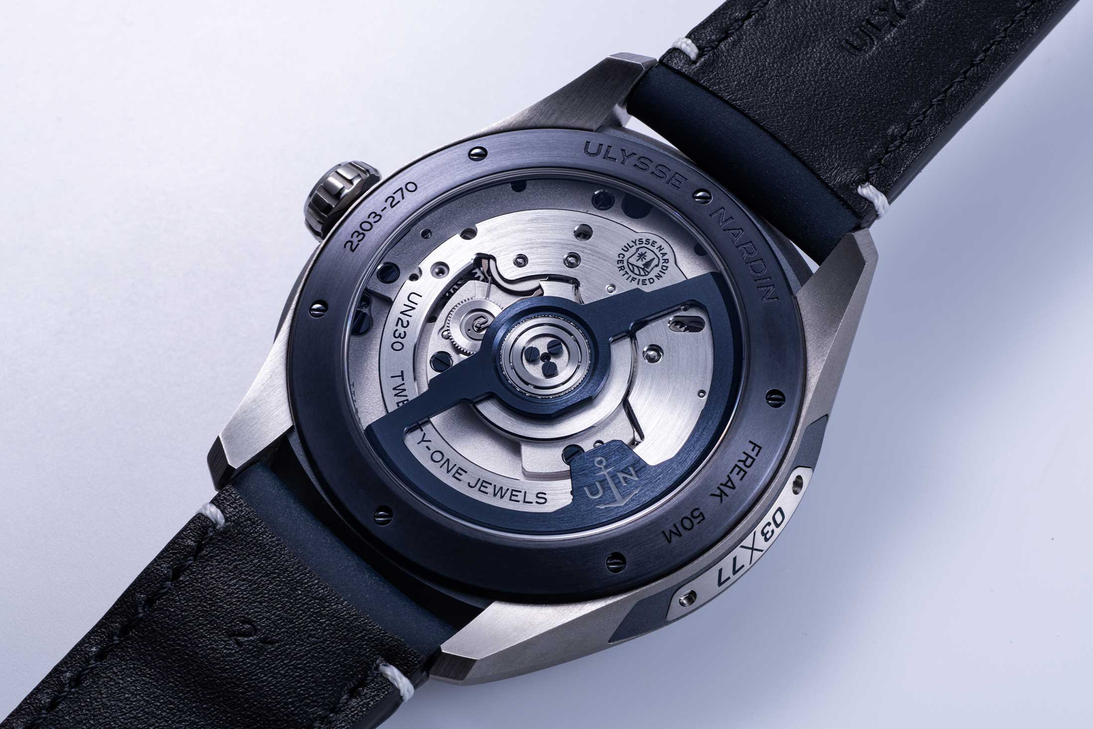 チタンケース、直径 43mm。自動巻きCal.UN-230、シリシウムヒゲゼンマイ。72時間パワーリザーブ。フライングカルーセル。