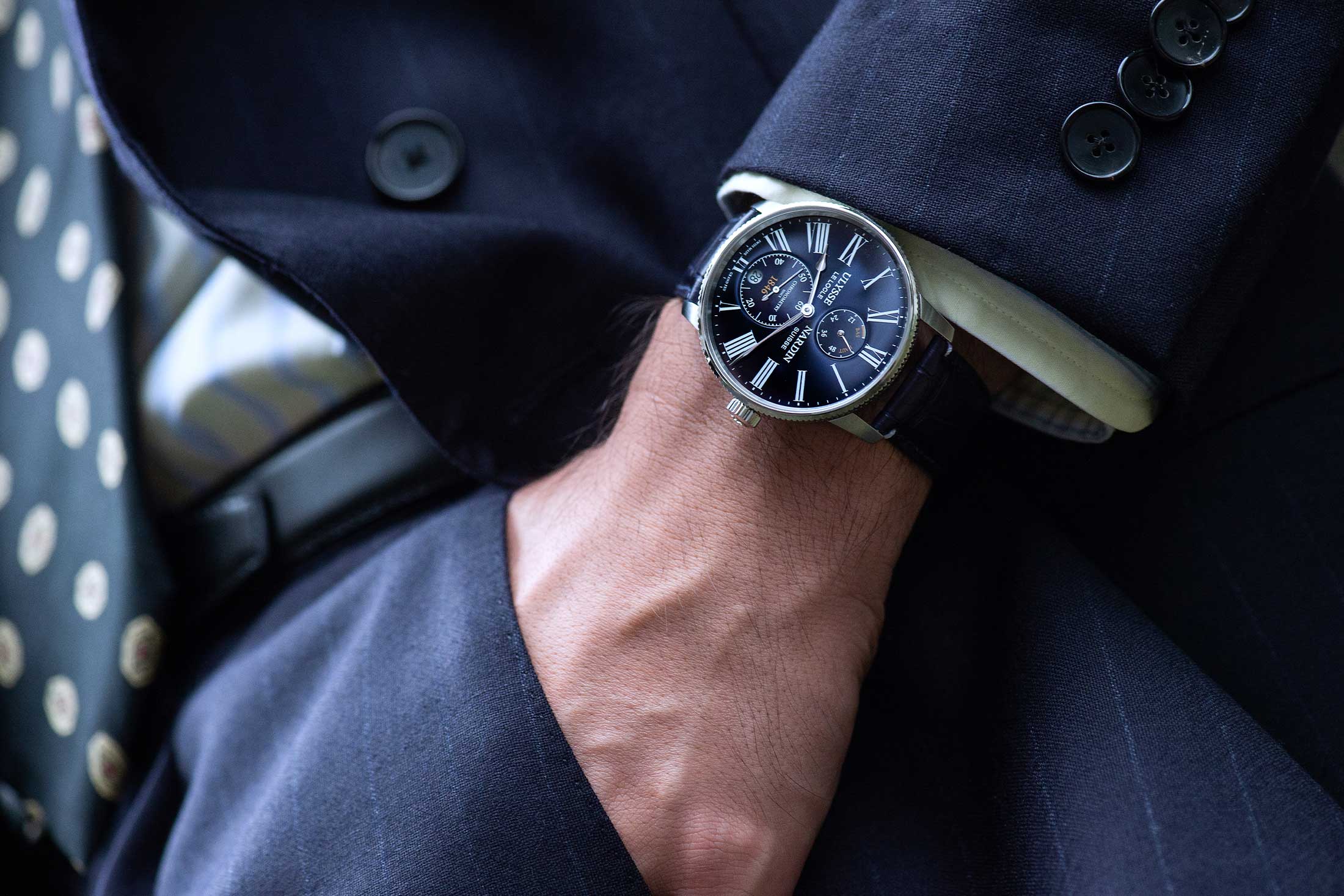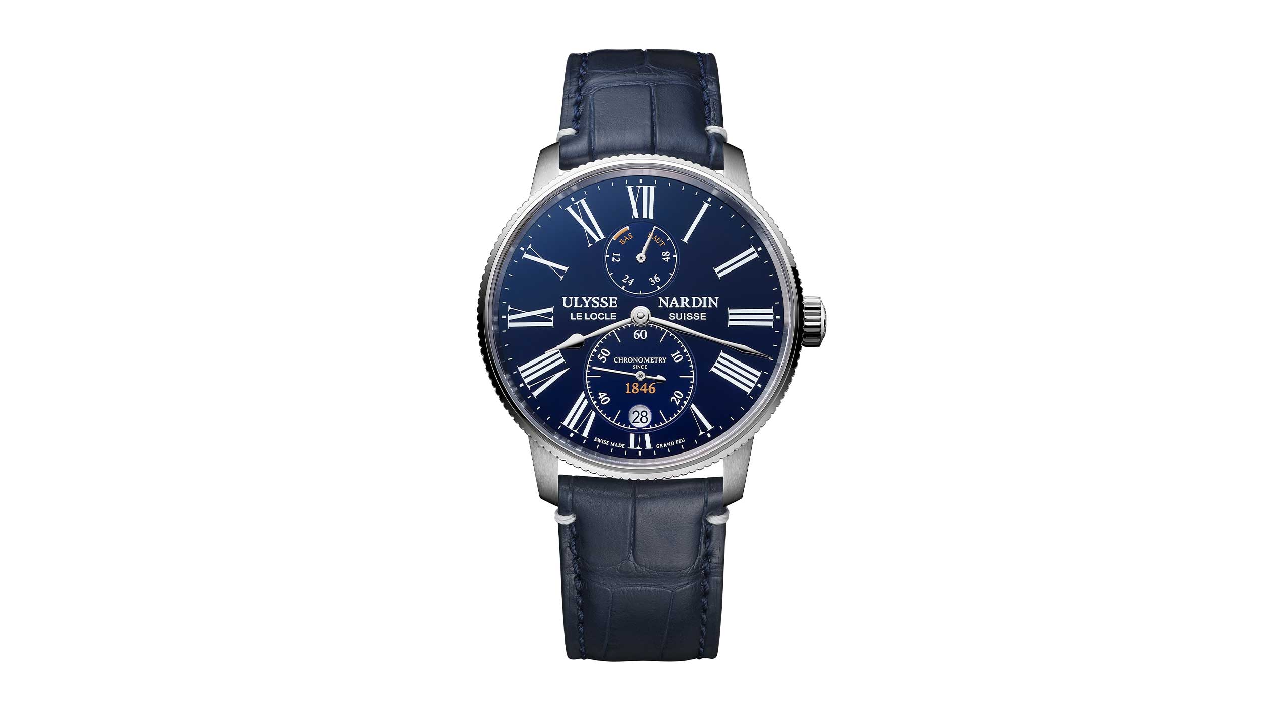 ブランドのフラッグシップであるマリーンは、その歴史を現代に継承する。腕時計としてのコレクションは、創業150周年に当たる1996年にスタートし、現在では3針からクロノグラフ、アニュアルカレンダー、トゥールビヨンなど多彩なラインナップを揃える。いずれのモデルもベゼル幅を狭めて一杯に広げた文字盤に、スモールセコンドとローマ数字のインデックスを備え、これも視認性を重視したマリンクロノメーター譲りのデザインだ。