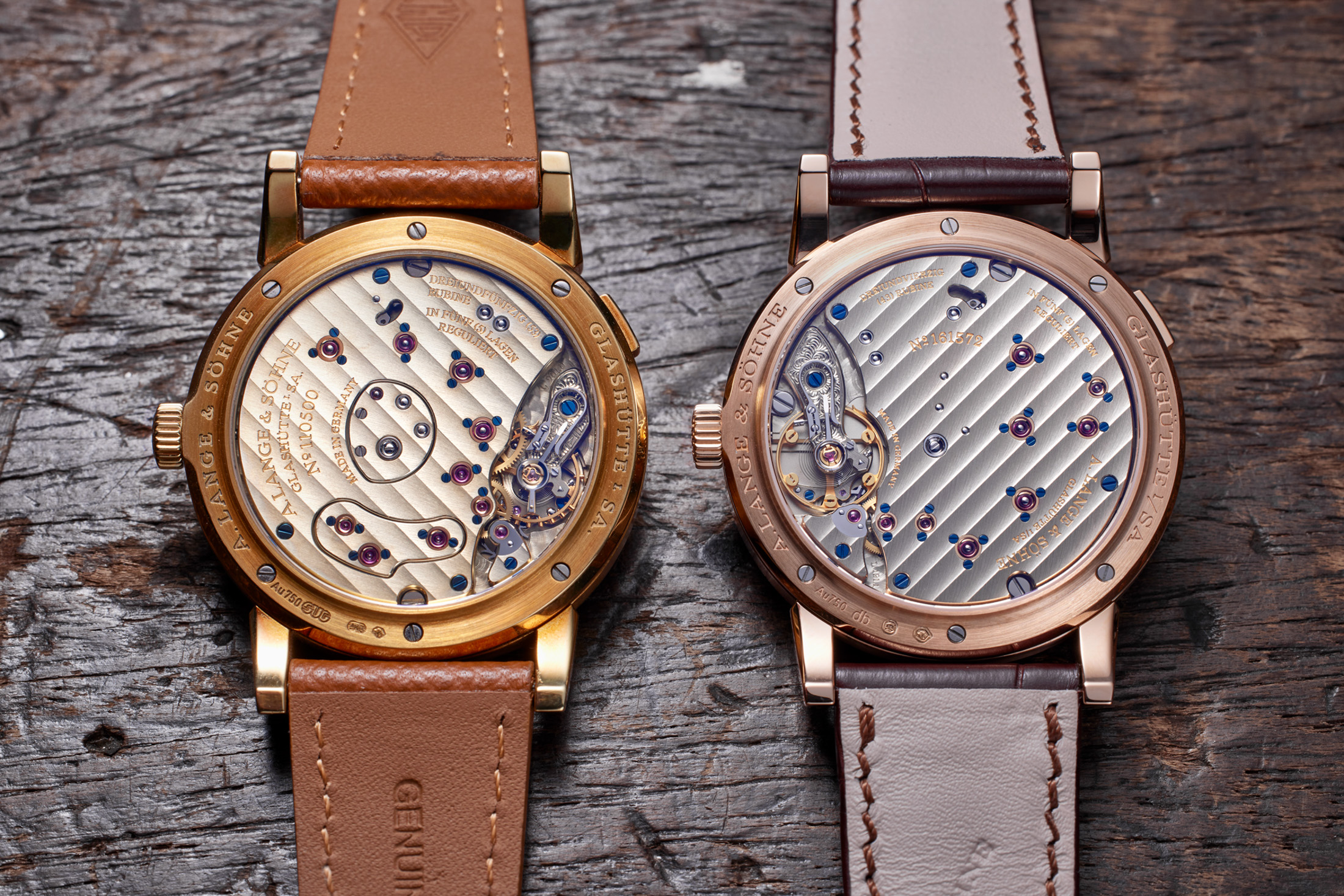 左が筆者所有のランゲ1、右が撮影用にお借りした新品のランゲ1。経年変化によって左の方がムーブメントの全体に温かみのあるカラーになっている。