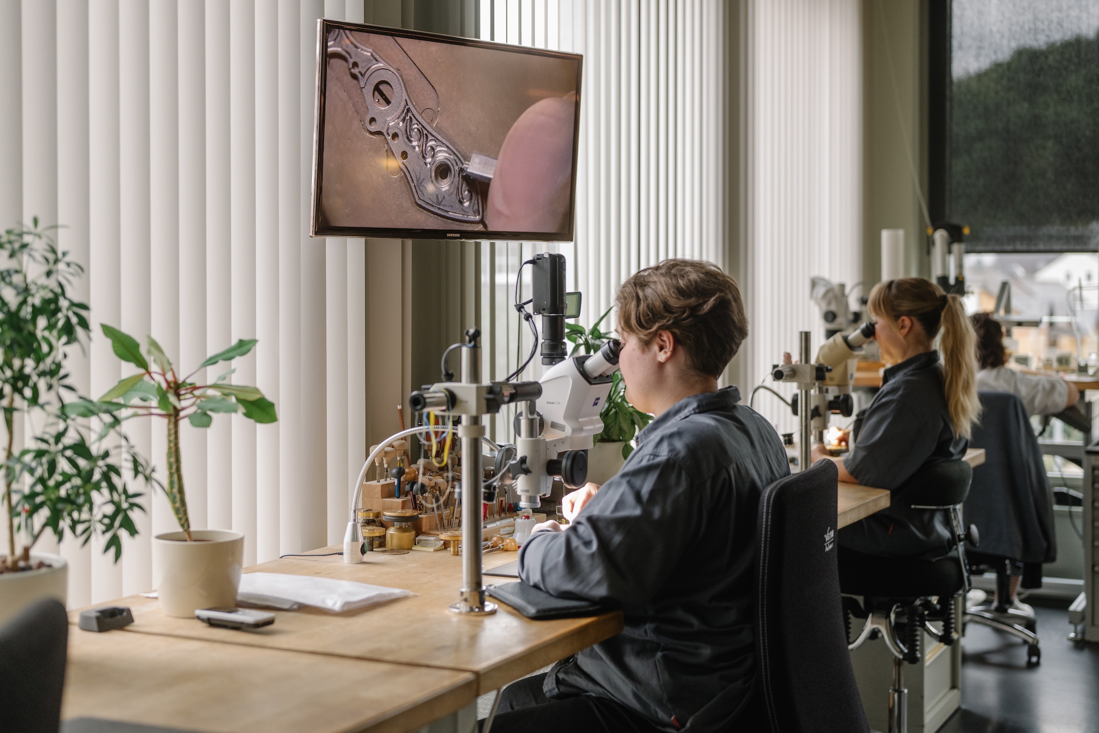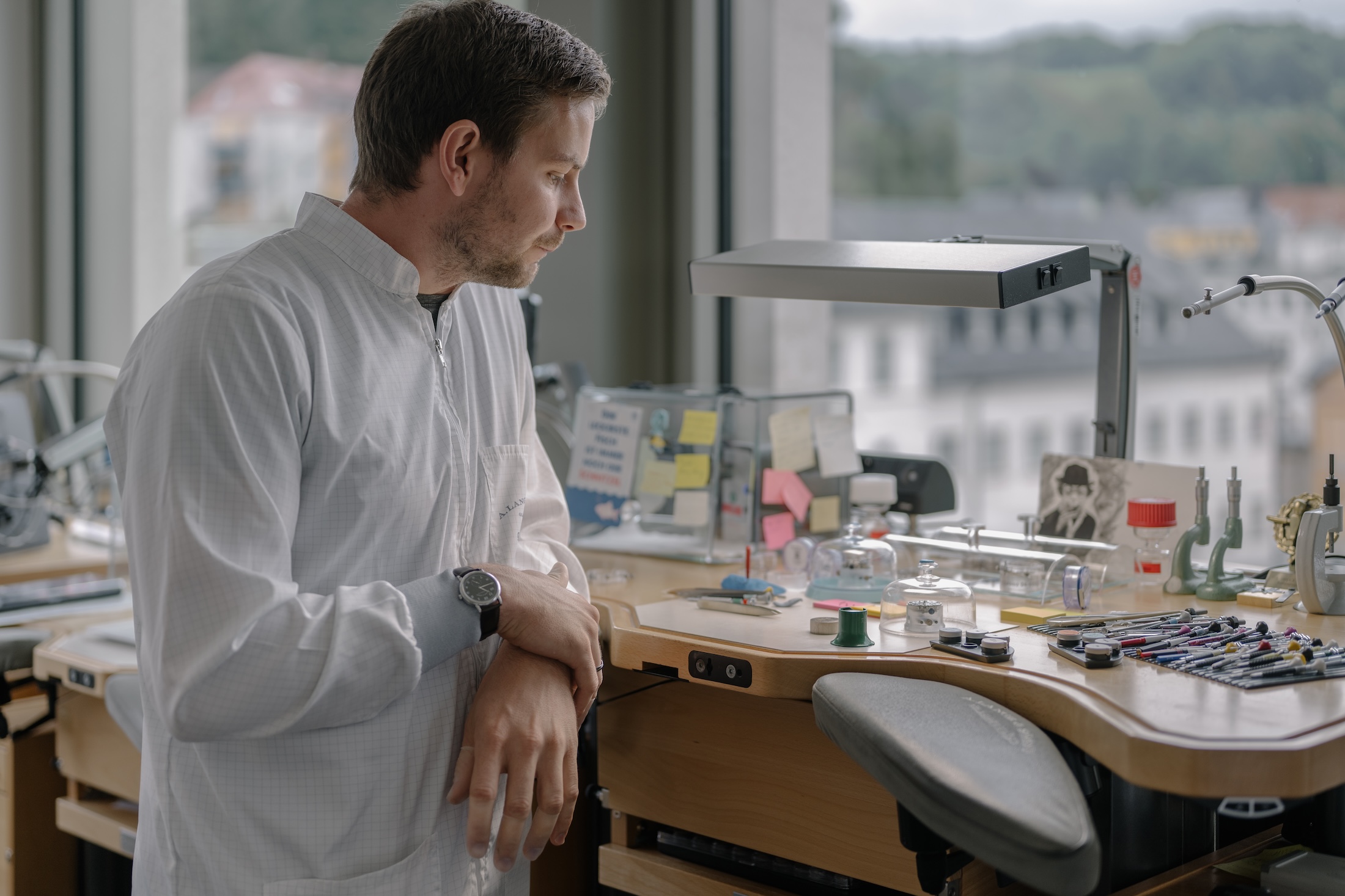 組立は大まかにはコレクションごとに分かれた複数の専門部門で分担されています。僕が案内されたのは、復活の象徴にして今やブランドの顔であるランゲ1の部門。グラスヒュッテの工房でも屈指の規模で、約20名の若い時計師が集中して持ち場に臨む空気は、静けさに満ちていました。