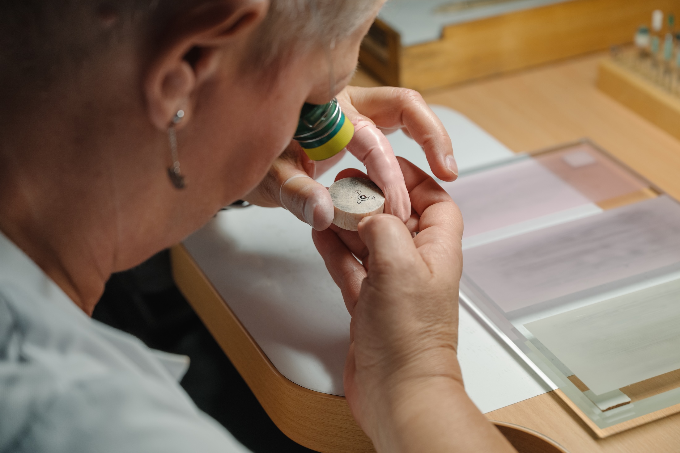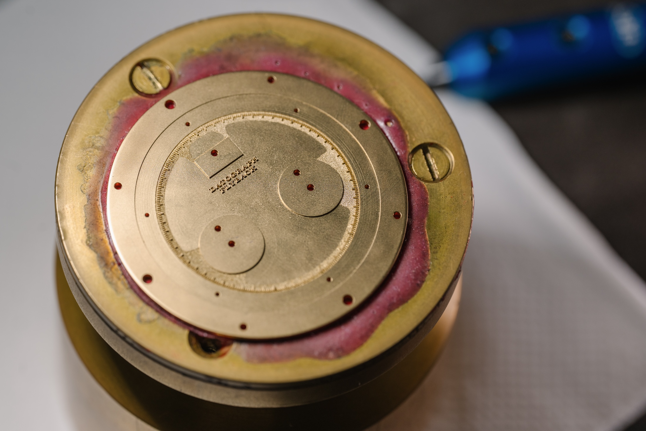 またここではテンプ受けのエングレービングだけでなくハンドヴェルクスクンスト・エディションのための手彫り部品の作業も行われていました。下はレリーフエングレービングの作業が行われているダイヤルです。
