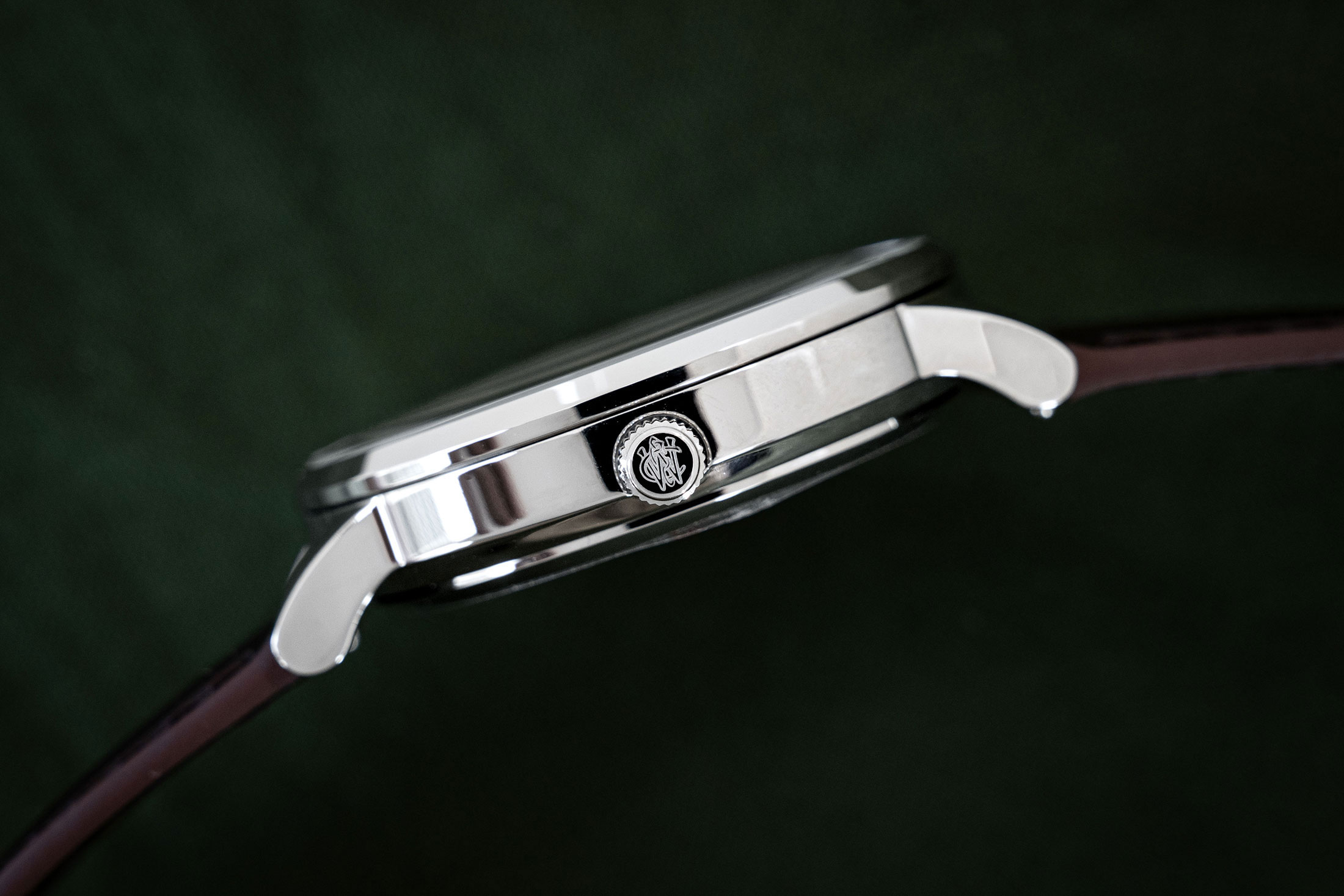 ストラップはなんとリアルレザーだ。同色のステッチが走るダークブラウンのストラップにはクイックリリース機構も取り付けられている。正直、このストラップだけで赤字だろう。