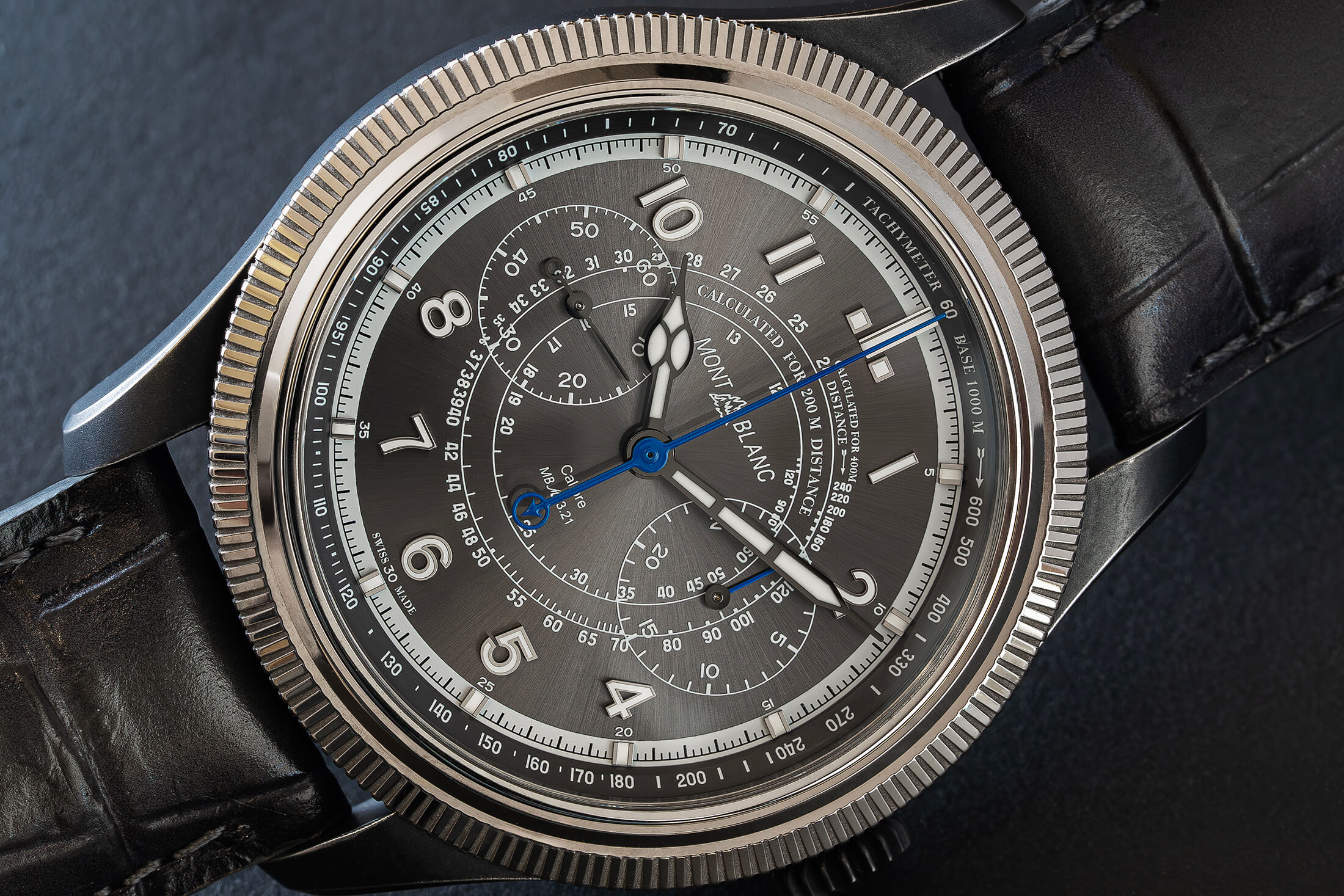フルーテッドベゼルによって操作を行う斬新なクロノグラフ。機構としては既存のモノプッシャークロノグラフをベースとしている。手巻き(Cal.MB M13.21)。ダメージ加工SSケース(18金WG製ベゼル)、アリゲータープリントのグレーカーフレザーストラップとSS製トリプルフォールディングクラスプ。42.5mm径。厚さ13.85mm。3 気圧防水。時計の詳細はこちら。