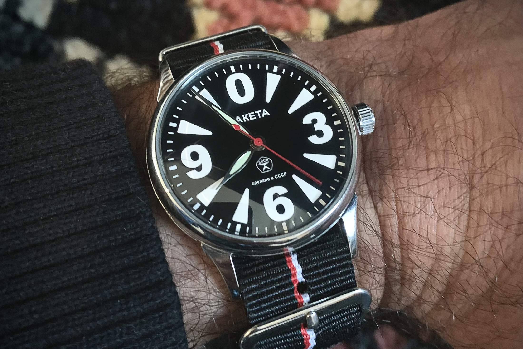 会社のお金を100ドル使って何を買おうかというハチャメチャなアイデアは、私がEtsyという別世界に深く入り込んで、このすばらしいヴィンテージのラケタを手にした後に思いついたものだ。だから、自分で決めたルールでズルをして18ドルもオーバーしたことを許してほしい。それよりも、もしあなたがこの商品に付いていたソ連の最も悲しい牛から採取されたと思われる悲惨な「レザー」ストラップを見ていたら、なぜ私がこのハンサムなレーシングストライプのNATOストラップに29.65ドルを追加してしまったのかがわかるだろう。安物買いの銭失いとはこのことだ。しかし、私はこの時計が大好きで楽しく感じているのだ。12の位置にある巨大な“0”の数字が気に入っている。また、この時計はシースルーバック仕様で、誰もがこの最高級のムーブメントをじっくりと見たいと思うようになっている。この記事を読むころには、親指と人差し指の間でリューズが折れているかもしれない。それはそれでいい。時計でも人生でも、何か馬鹿なことをするにはそれなりの理由が必要なのだ。