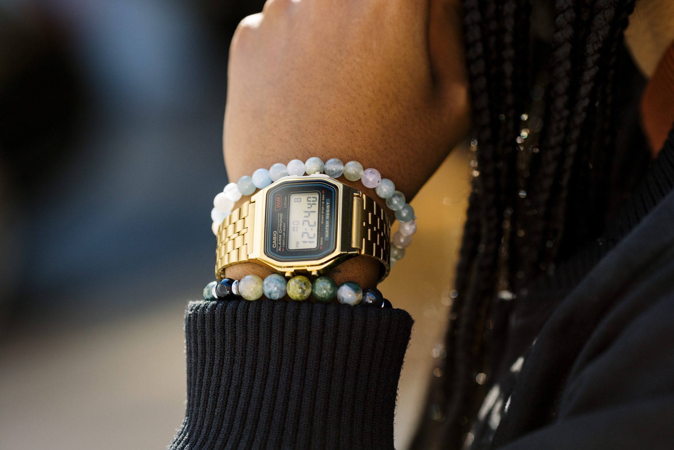 100ドル以下の時計を探すとき、私が最初に考えたのはファッショナブルでなければならないということだった。私が選んだのは昔ながらのゴールドカラーのカシオで、ストラップは誰の手首にも合わせられるようになっているがメンズウォッチと書かれている。これは少なくとも私にとっては大きなプラスだ。この時計はドレスアップしても完全にドレスダウンしても十分に使いこなすことができる。このヴィンテージスタイルのカシオは目覚まし時計、暗闇でも表示を確認できるライト、そして防水性を備えている。しかも時間がわかるのだ。予算的にはこれ以上は望めないだろう。