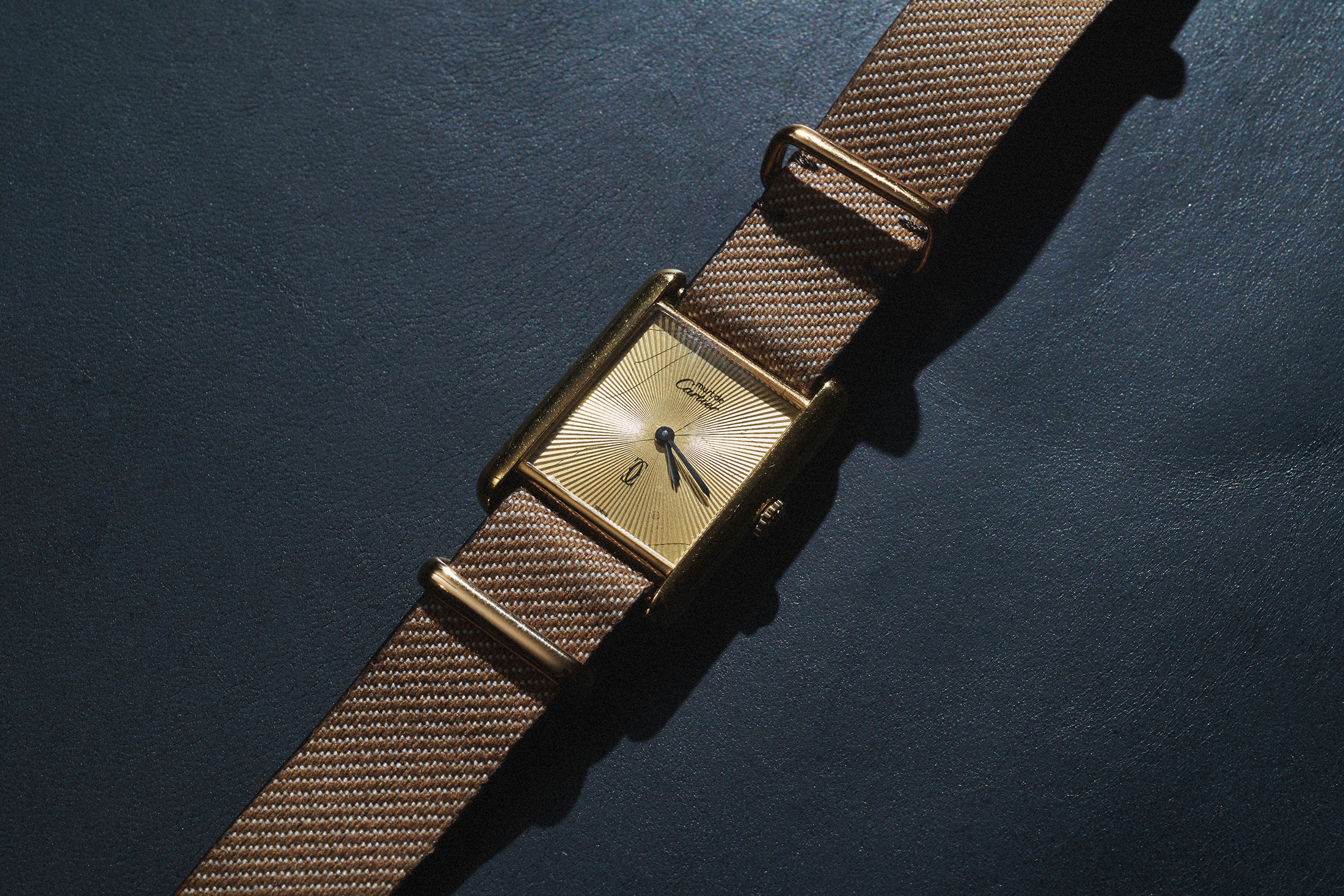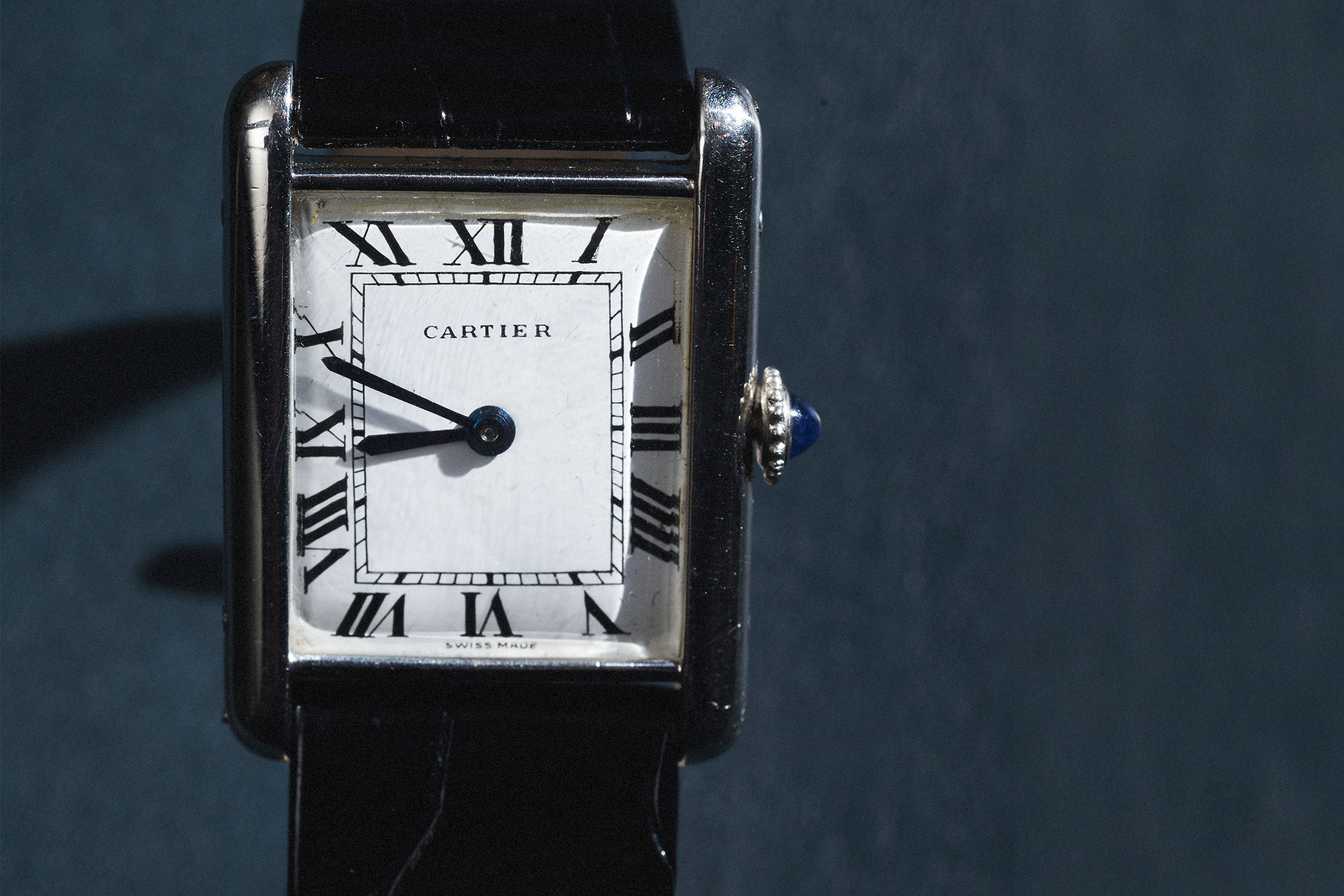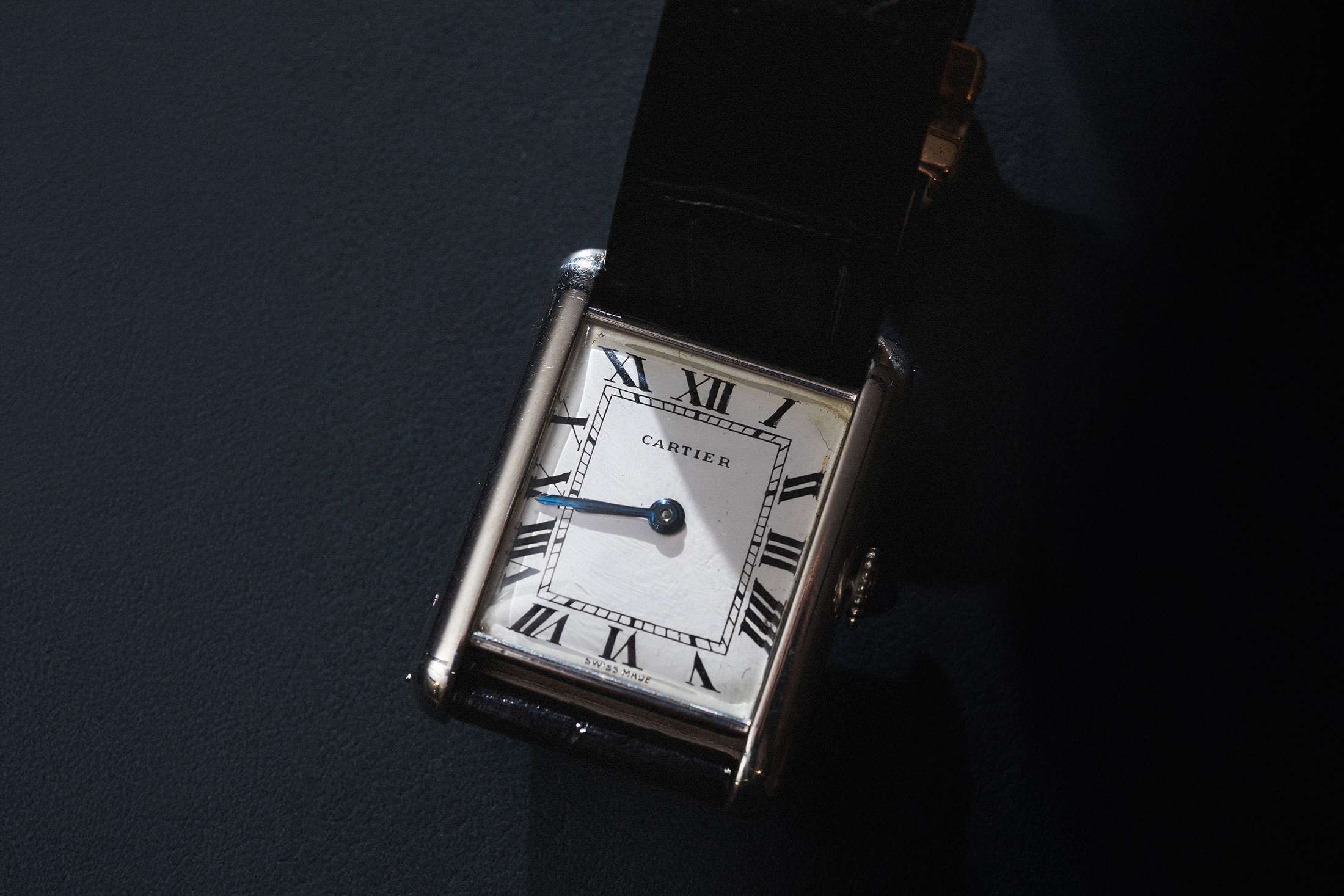 ソレイユ装飾をアクセントにしたシンプルな文字盤のタンク マストは、20年近く前にカナダの時計店がニューヨークで開いていたポップアップストアで購入。鴨志田さんが初めて購入したカルティエだという。