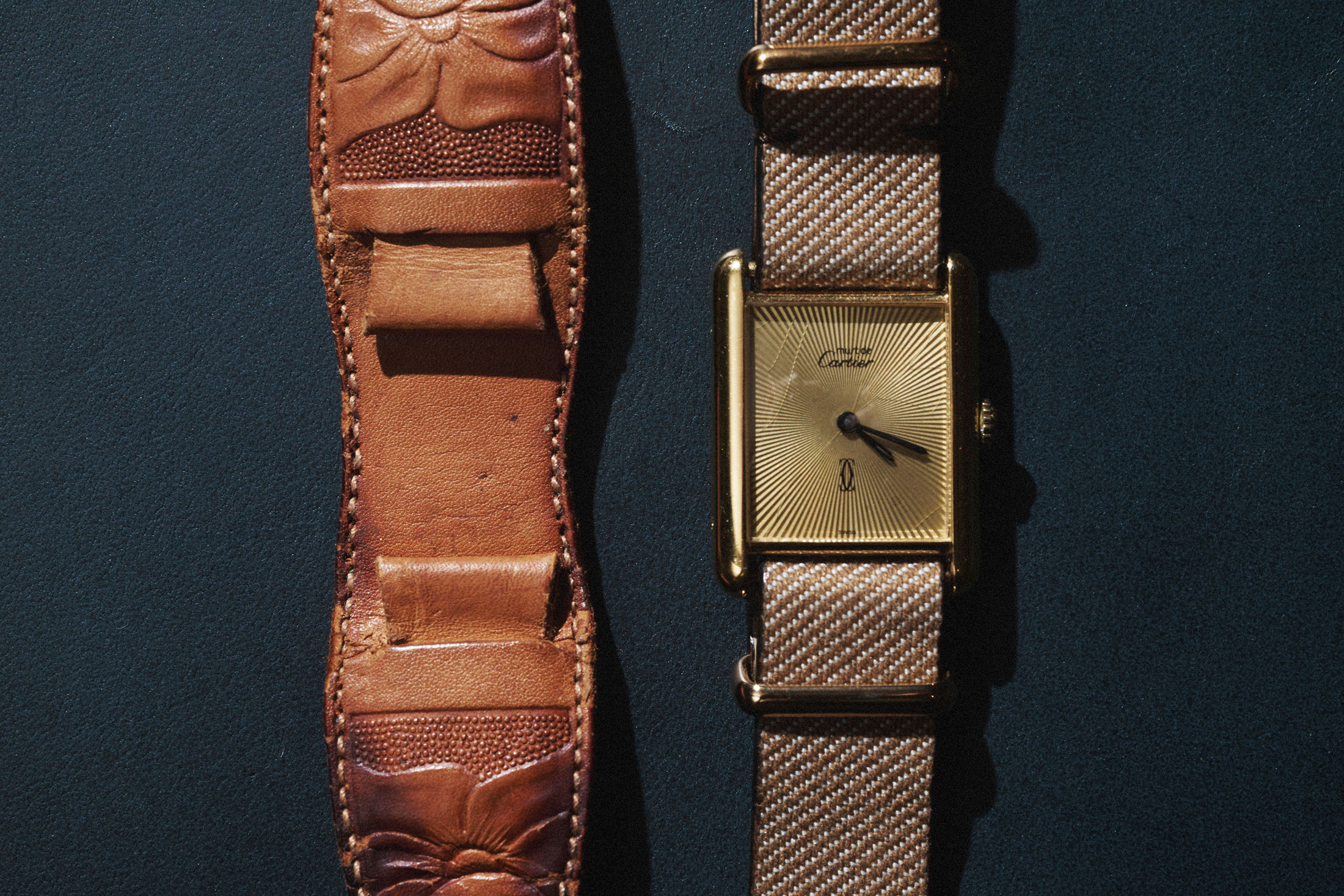 そして鴨志田さんは、このカルティエの横に民族調のカービングが施されたレザーストラップを並べた。表面の凹凸に応じて、深い陰影が刻まれている。