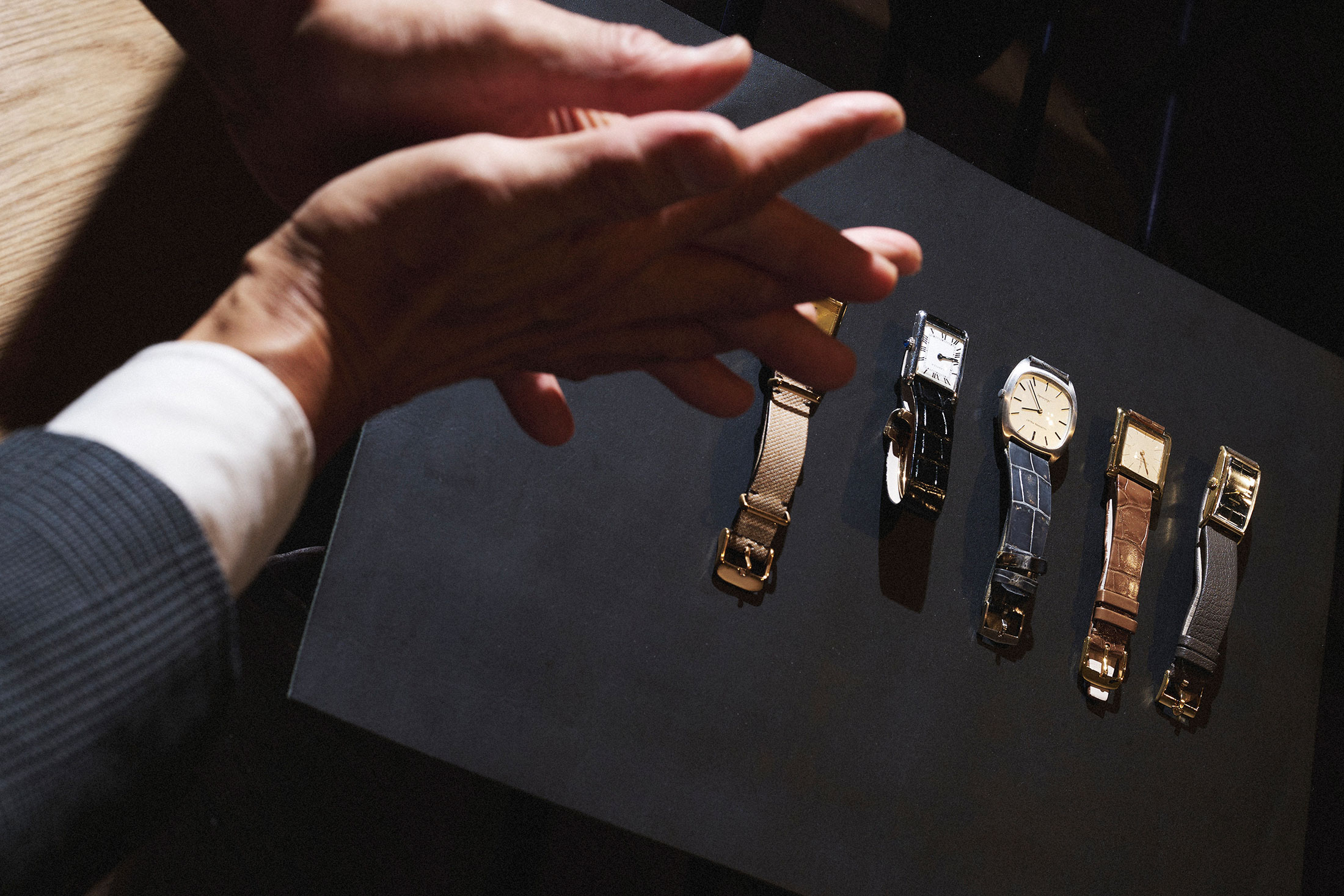 「ここに並べている時計のほとんどが、アール・デコの影響を感じさせるデザインですね。大学でインテリアを専攻したこともあって、とても好きな世界なんです。“秩序のある幾何学的な美”という価値が確立した時期でもあり、20世紀という今につながる時代の幕開けでもある。そして奇遇なことに、男性用腕時計というものが初めて登場したタイミングとも重なります。“オーセンティック”という概念の原点にあたるこの時代に、僕は本能的に惹かれ続けてきたんだなと今、話していて改めて気づかされました」
