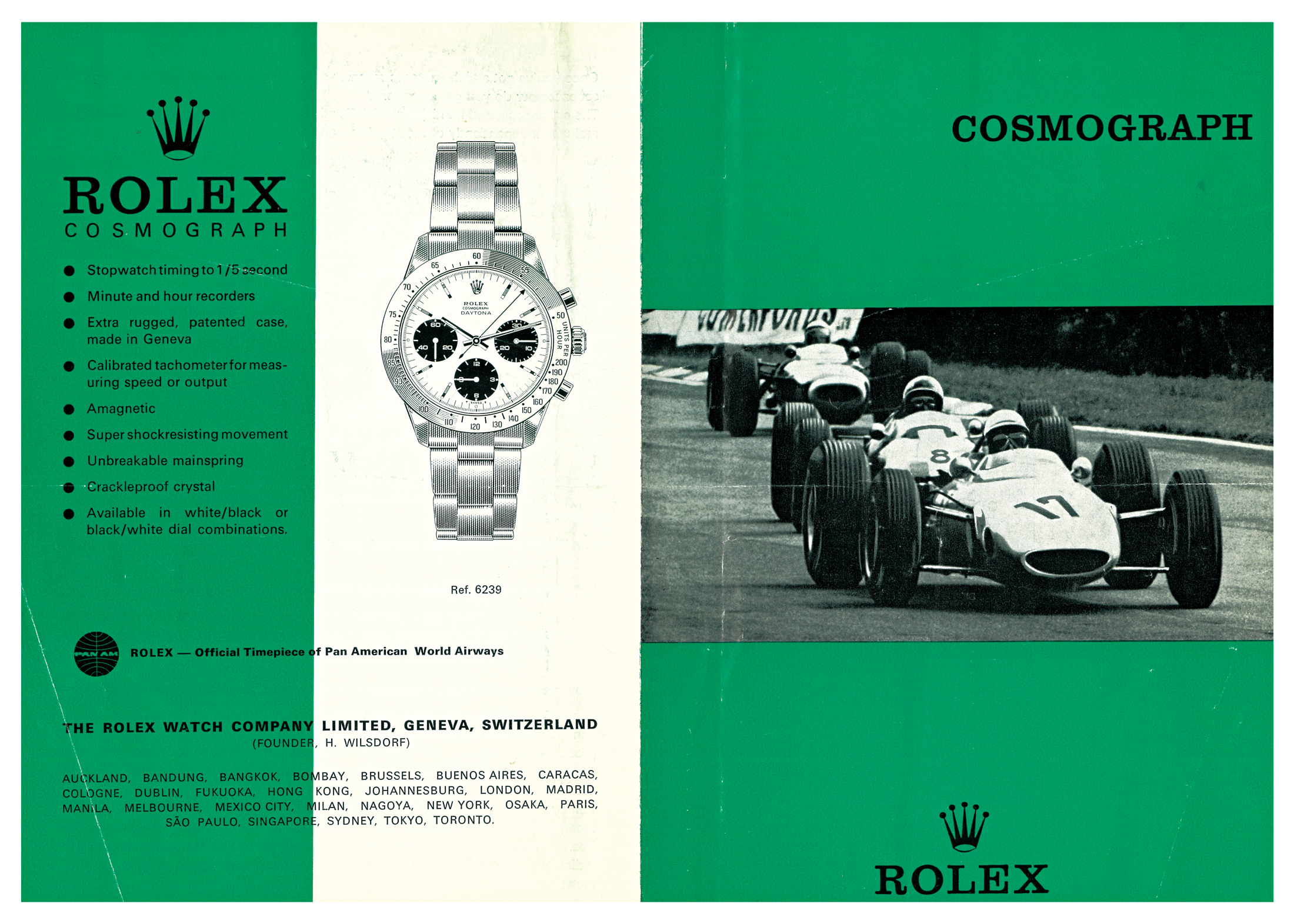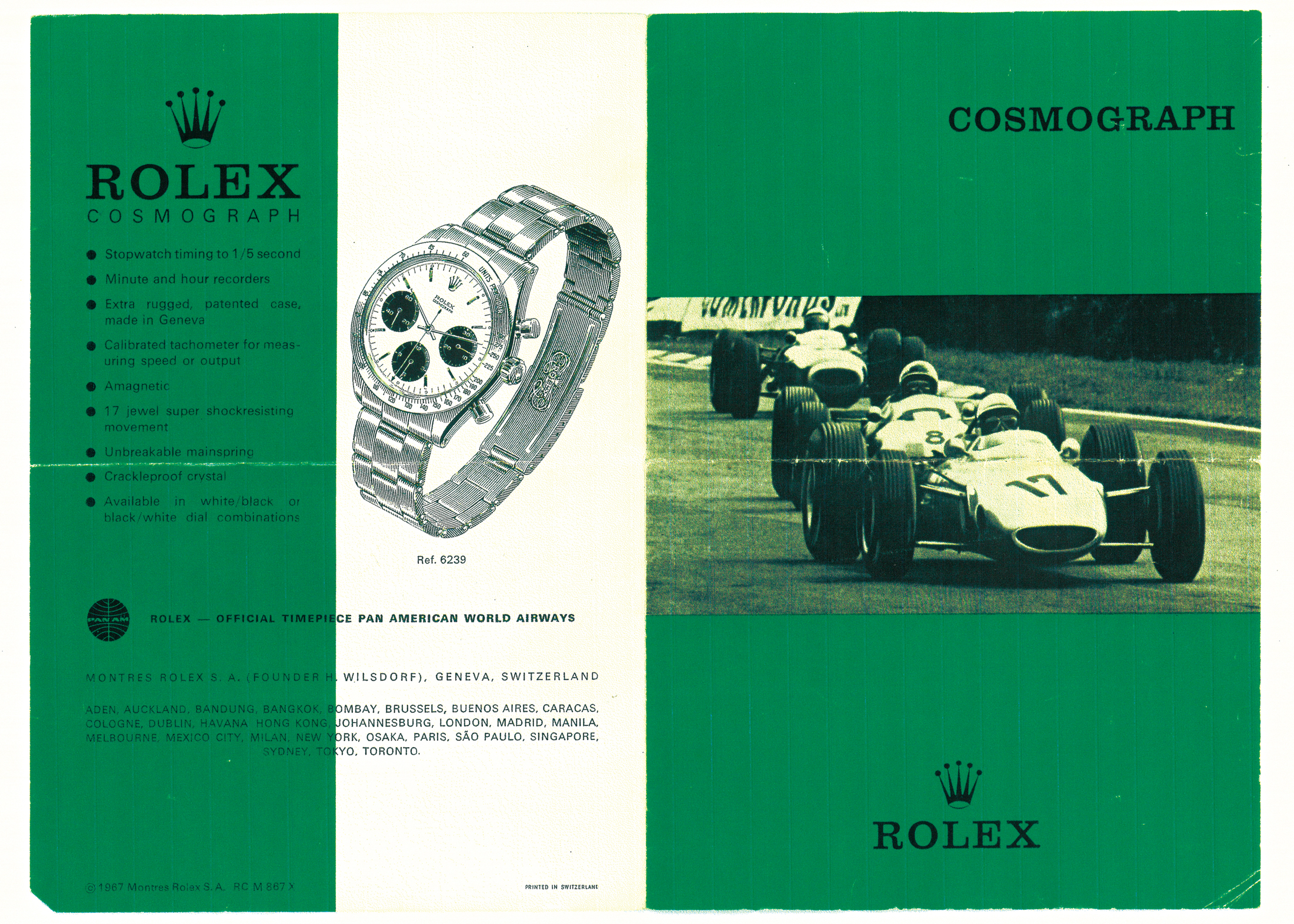 1967年のリーフレットには、ル・マンのイラストが掲載されている。なぜル・マンのイラストだとわかるかというと、文字盤の12時位置に2行で“ROLEX”“COSMOGRAPH”表記が入り、タキメーターべゼルには“275”の数字が入るからだ。6時位置には“ダブルスイス”表記もある。