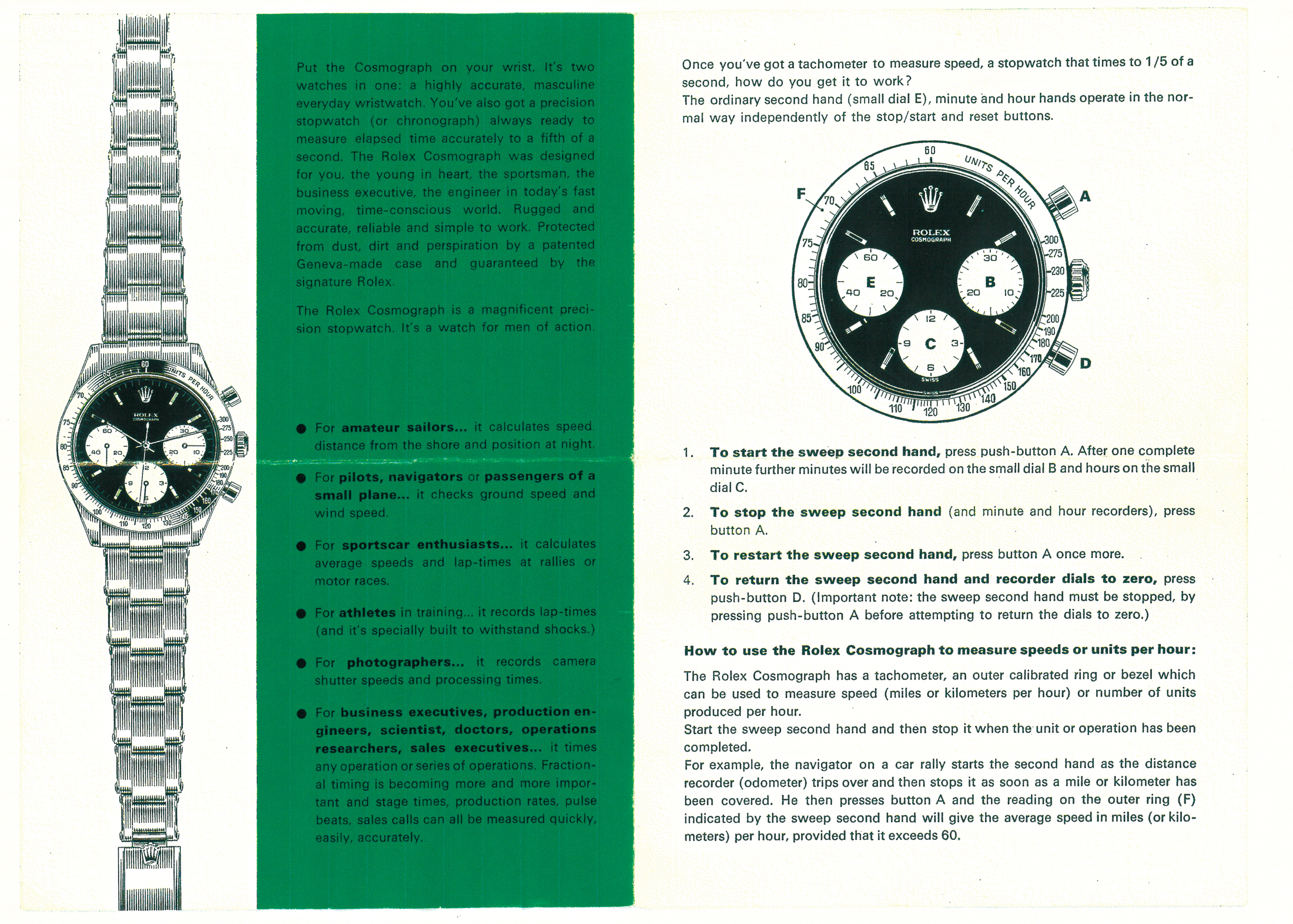 こちらは1970年のリーフレットだが、写真はル・マンの数年後に発売した年式の異なるデイトナ表記入りが掲載されている。文字盤には“DAYTONA”の名が入り、ベゼルはRef.6239用としていちばん最後に登場したタイプが採用されている。