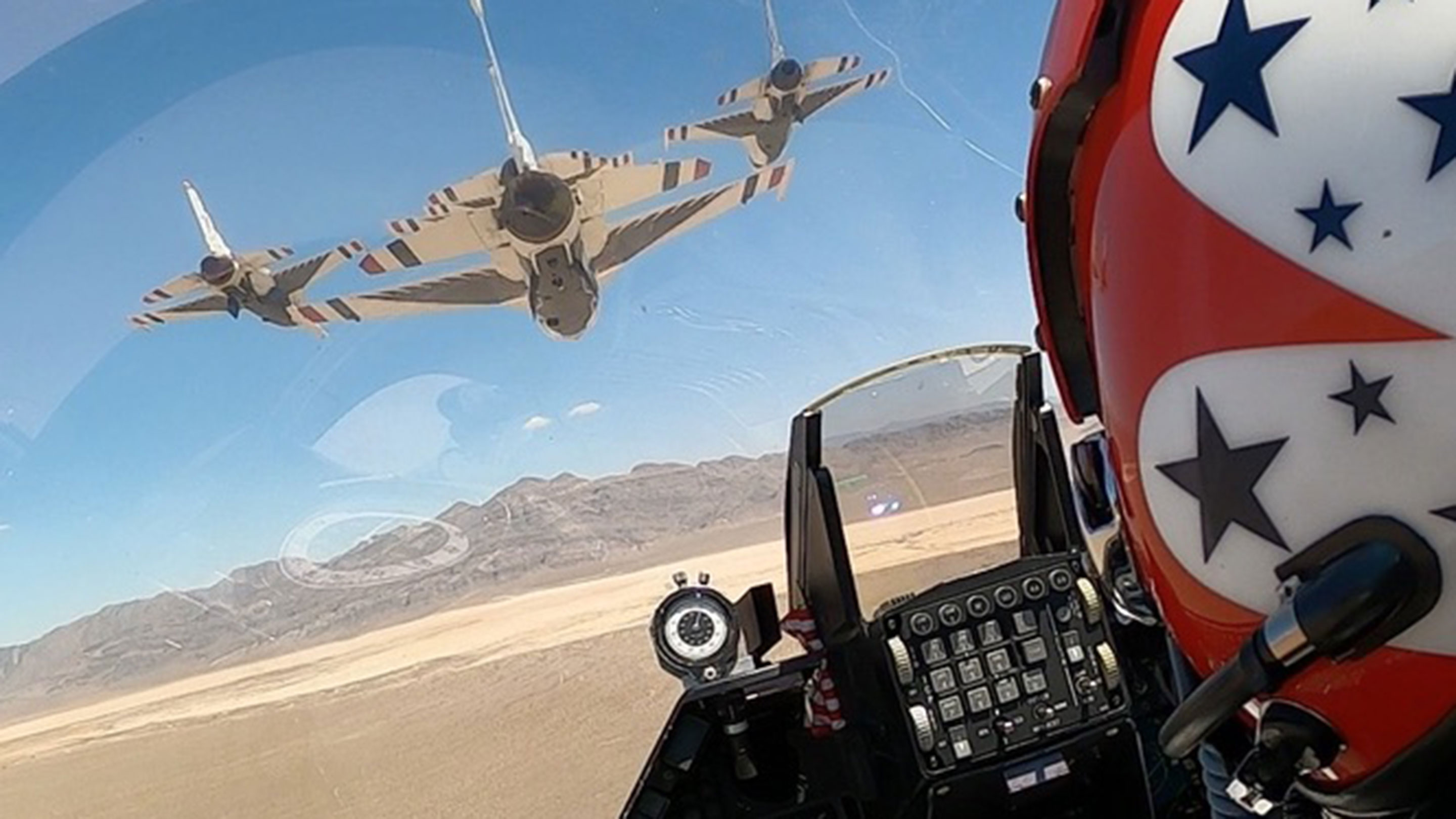 他の計器類と共にマラソンのストップウォッチが視覚的に溶け込んでいる。レーダー警告受信機の真上にあり、コックピットのHUD(ヘッドアップディスプレイ)の左に搭載されている。ロッキード・マーティン工場の組み立てラインから転がり落ちてきたようにも見えます。しかし、実はこれはサンダーバーズのソロパイロット特有の改造なのだ。
