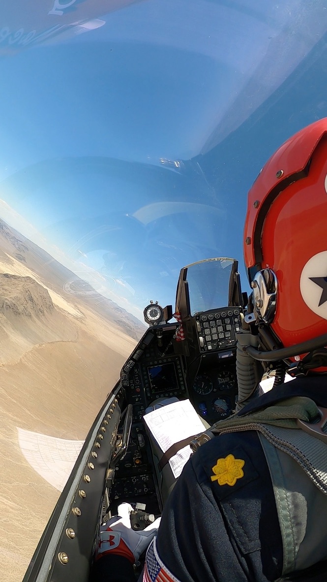 カラン少佐は「ダイヤモンド隊形」の後ろを辿る。 ストップウォッチは、HUDの左側のグレアシールドに取り付けられている。